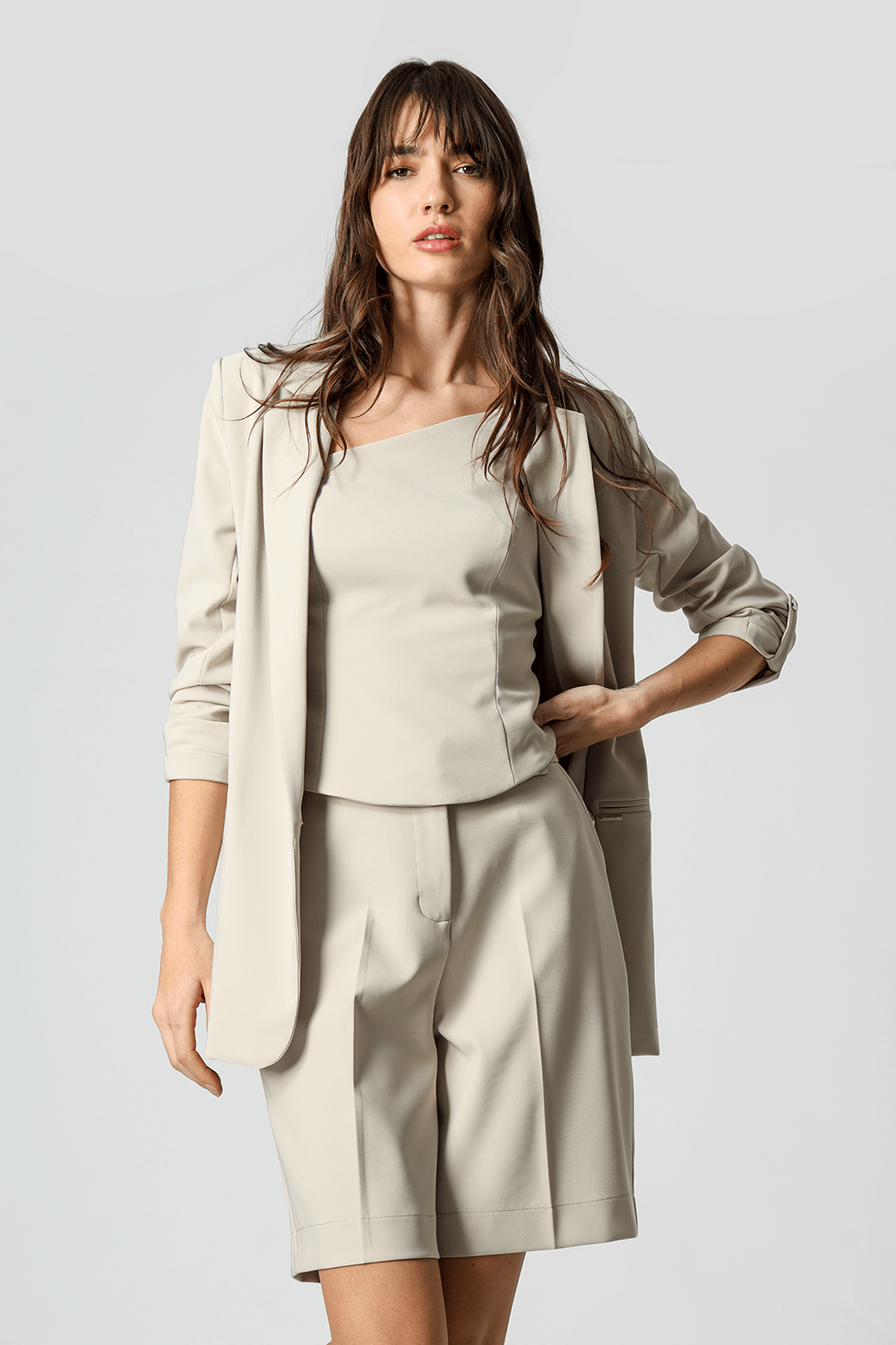 Bermuda com botão forrado do próprio tecido. Peça confeccionada em tecido Alfaiataria. Um modelo clássico, elegante e perfeito para compor com looks work.