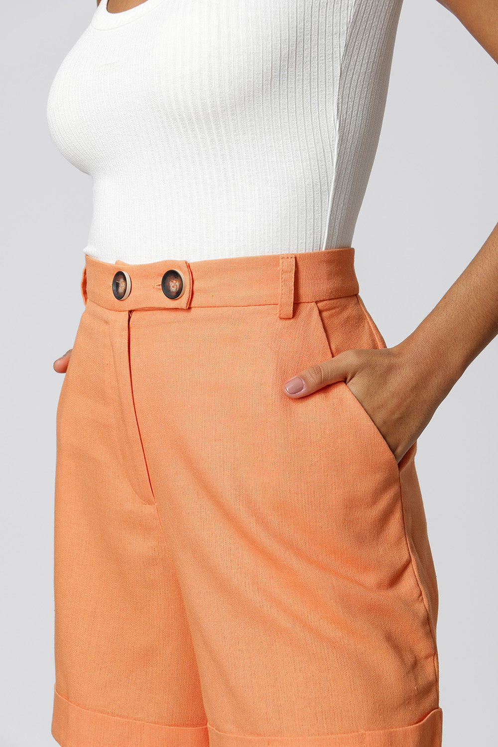 Bermudas confeccionadas en lino con dobladillo italiano y botones de carey en la cinturilla cruzada. Una pieza casual, relajada y encantadora para usar todos los días.
