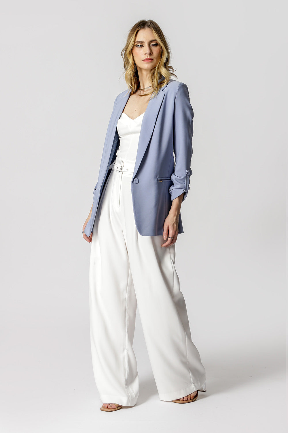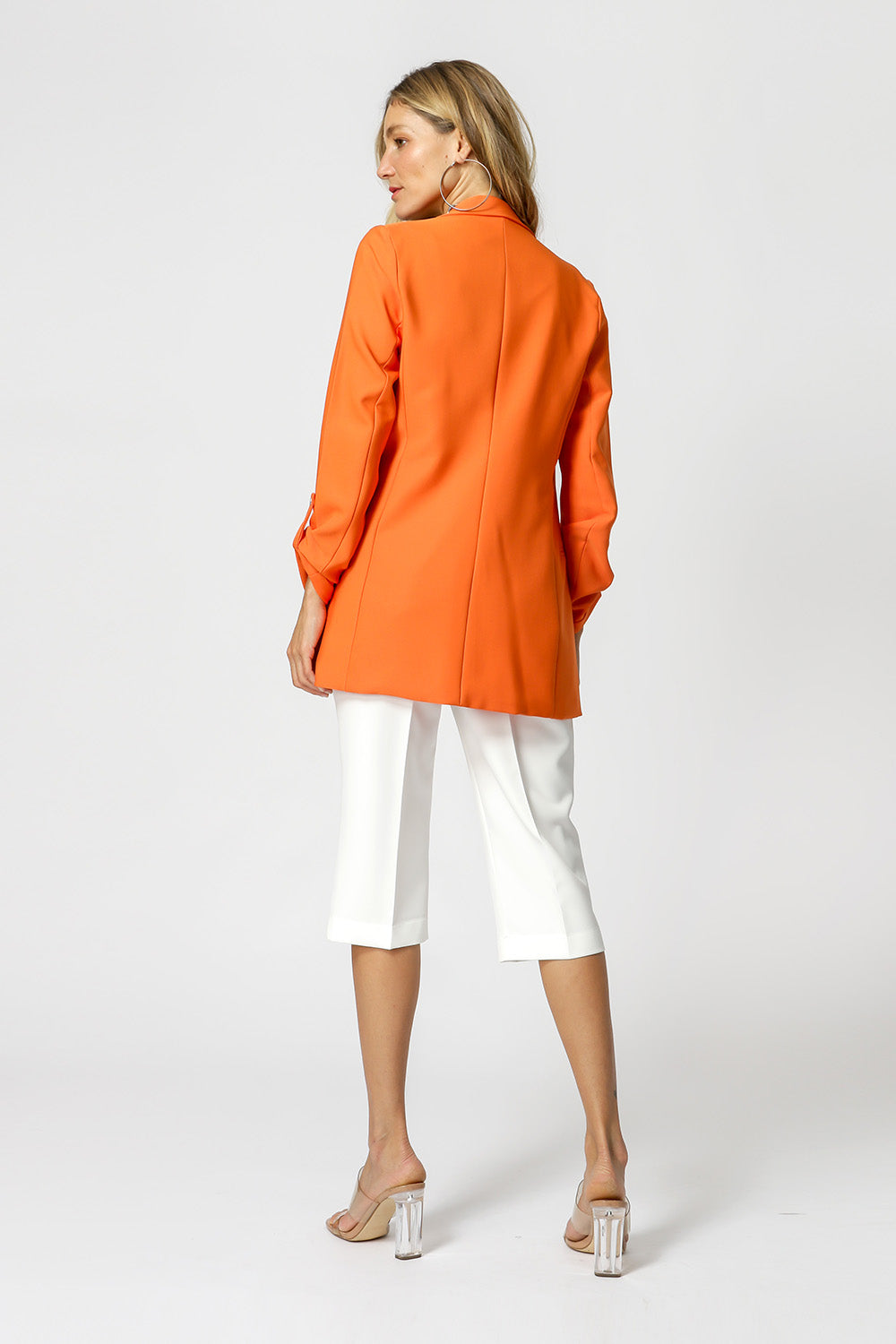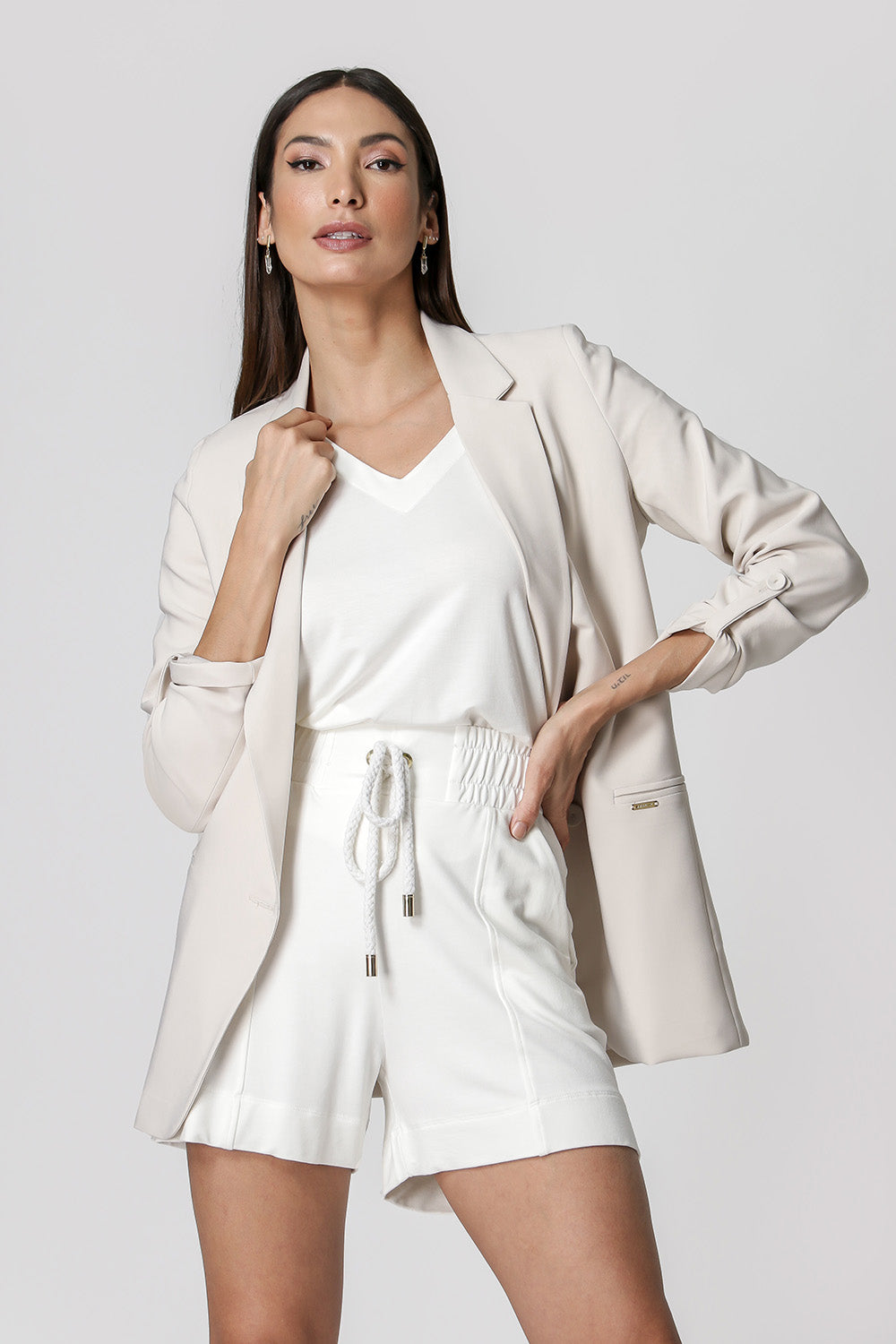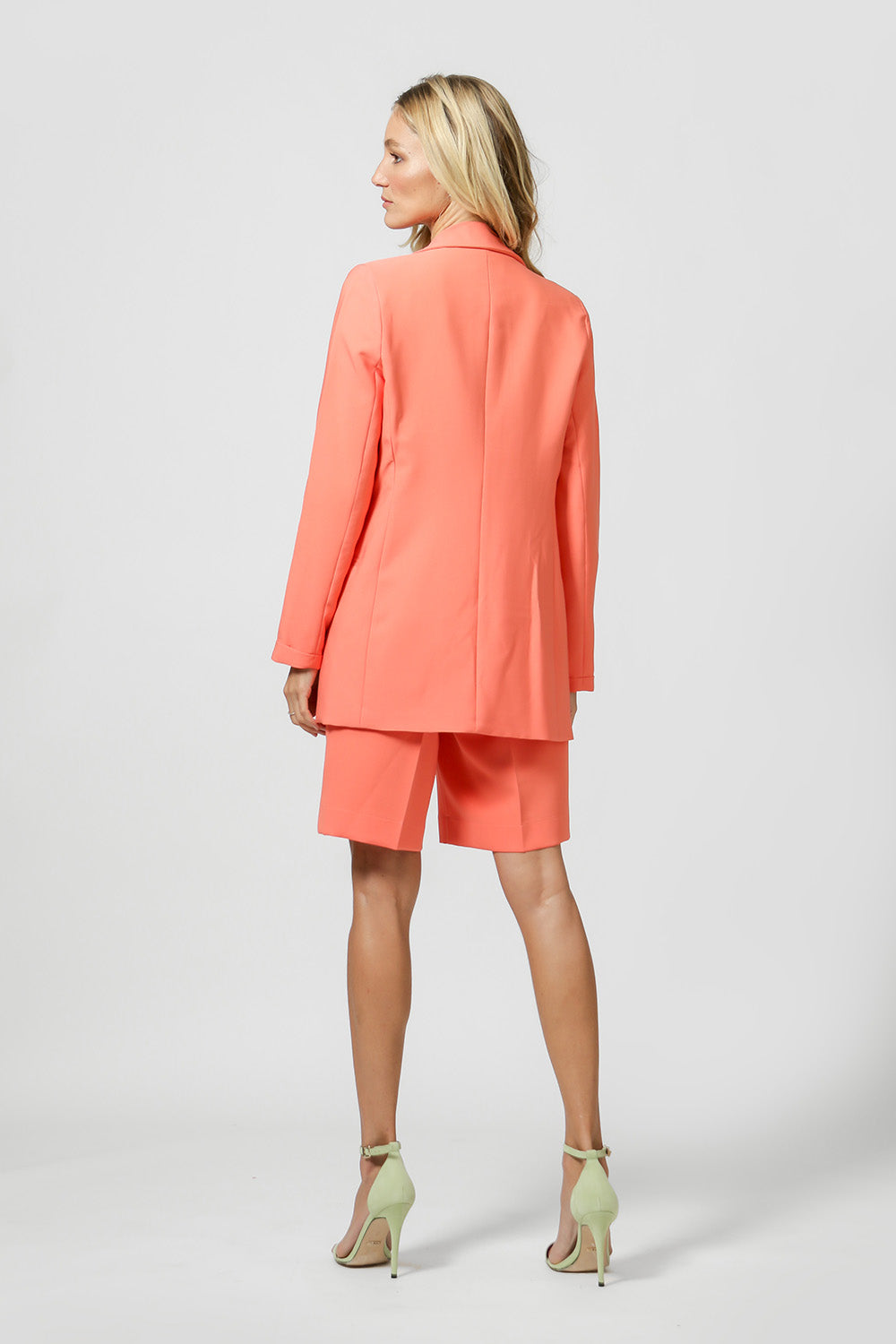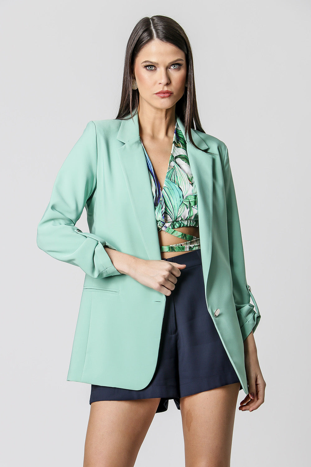 Blazer de alfaitaria com shape longline, com detalhe de martingale e com forro estampado.