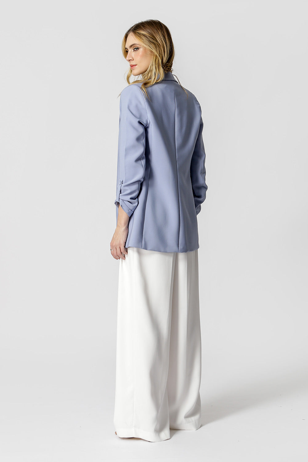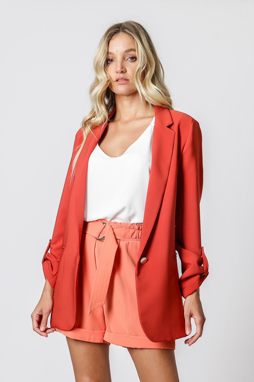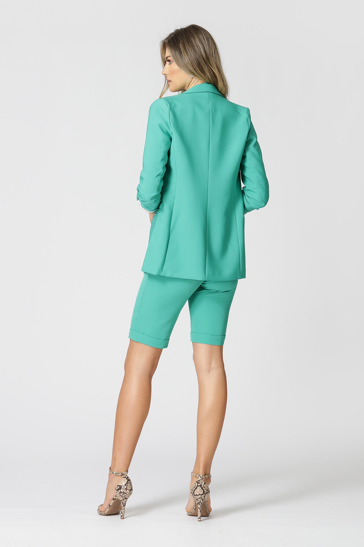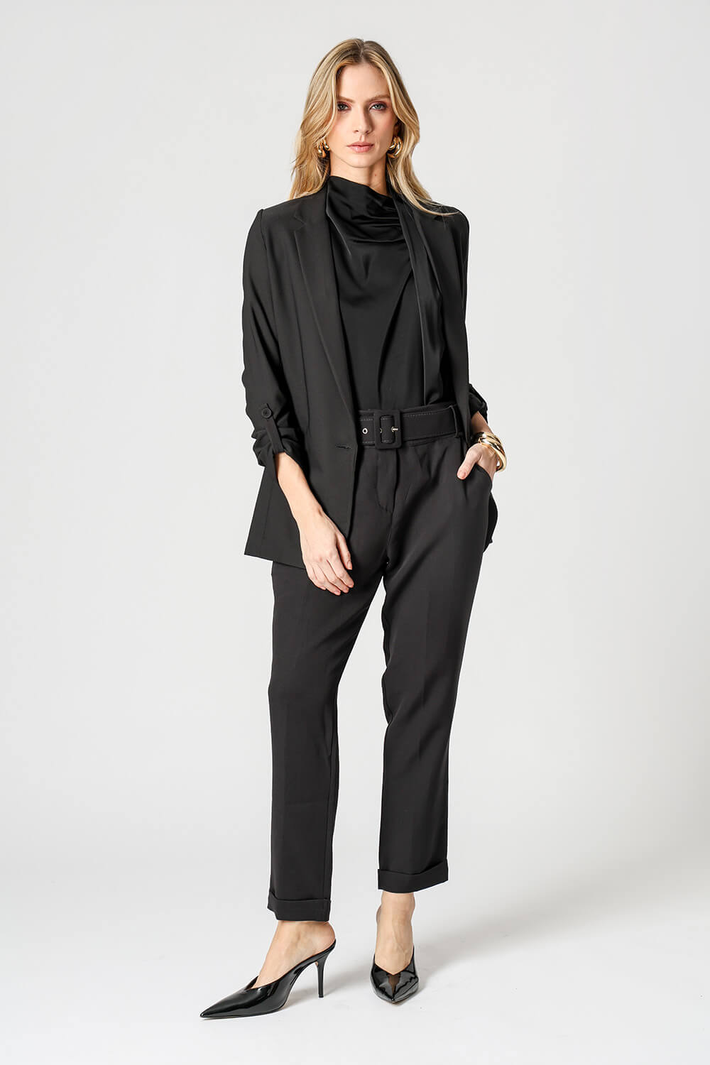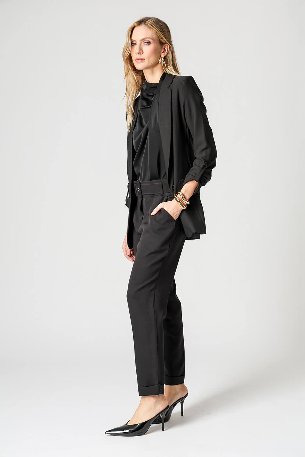 Blazer de alfaitaria com shape longline, com detalhe de martingale e com forro estampado.