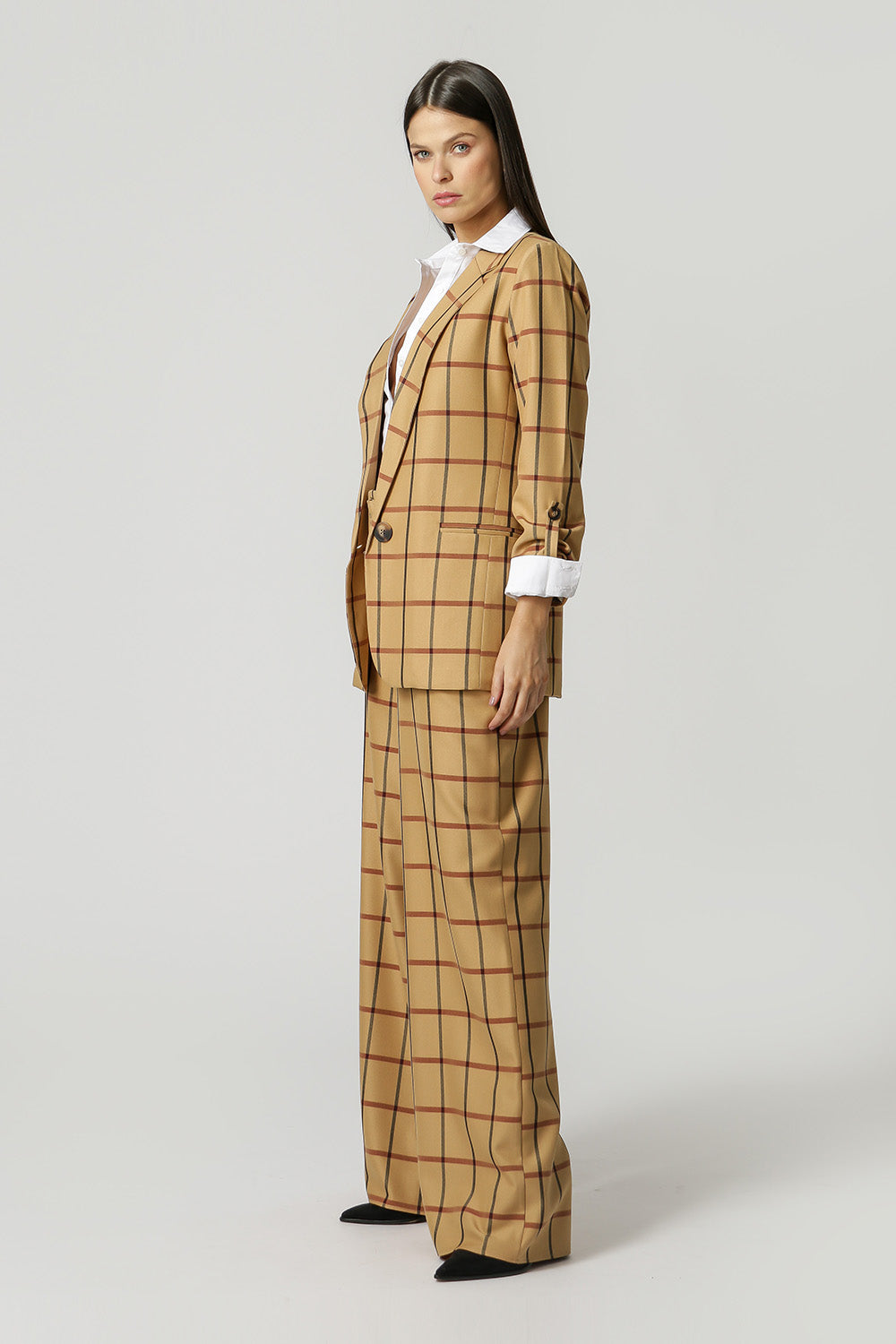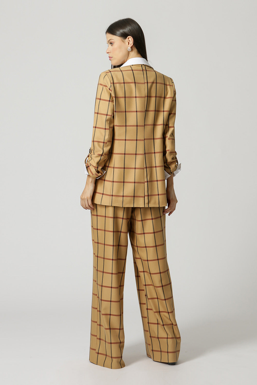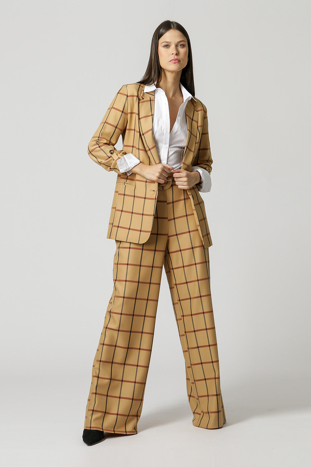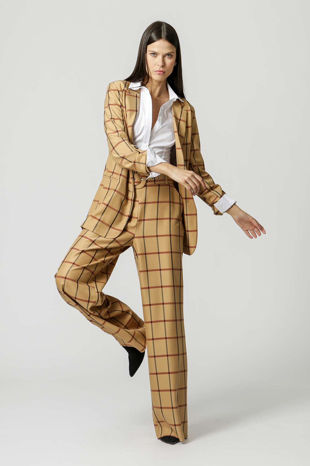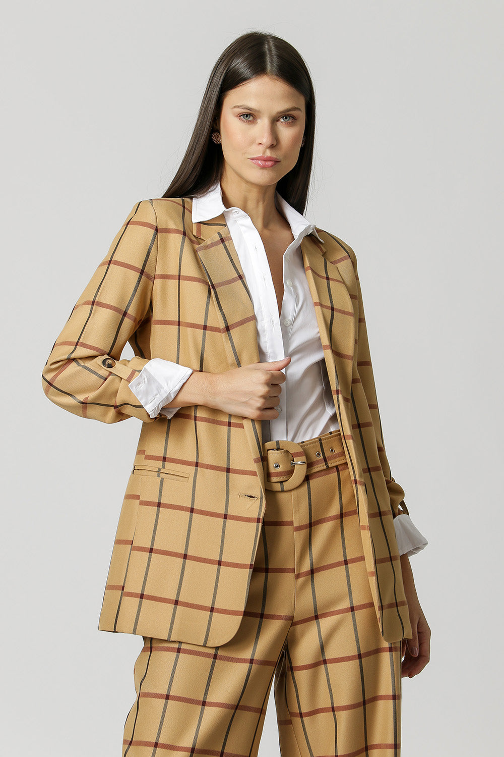 Blazer confeccionado en sastrería de cuadros con corte largo, con detalle de martingala y forro estampado. ¡El clásico que debes tener!