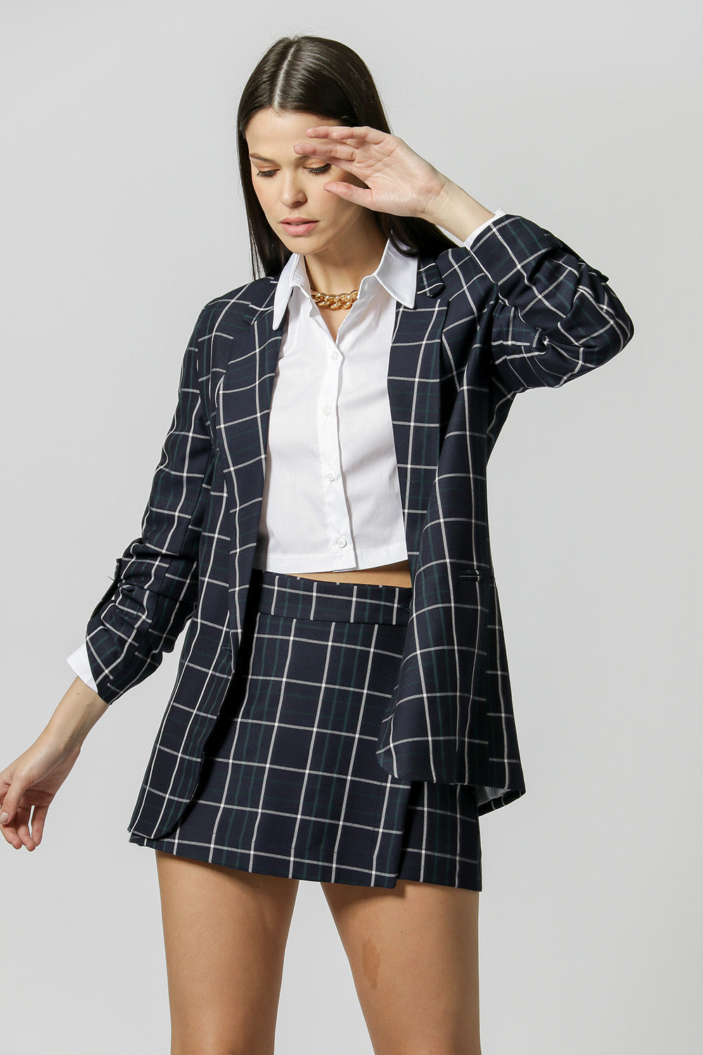 Blazer confeccionado en sastrería de cuadros con corte largo, con detalle de martingala y forro estampado. ¡El clásico que debes tener!