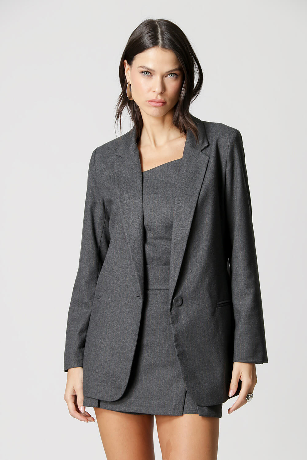 Blazer largo con botón forrado en el mismo tejido. Un modelo confeccionado en tejido de sastrería con raya diplomática. Una pieza perfecta para añadir un toque de sofisticación y estilo a tus looks y que combina con una variedad de piezas diferentes.