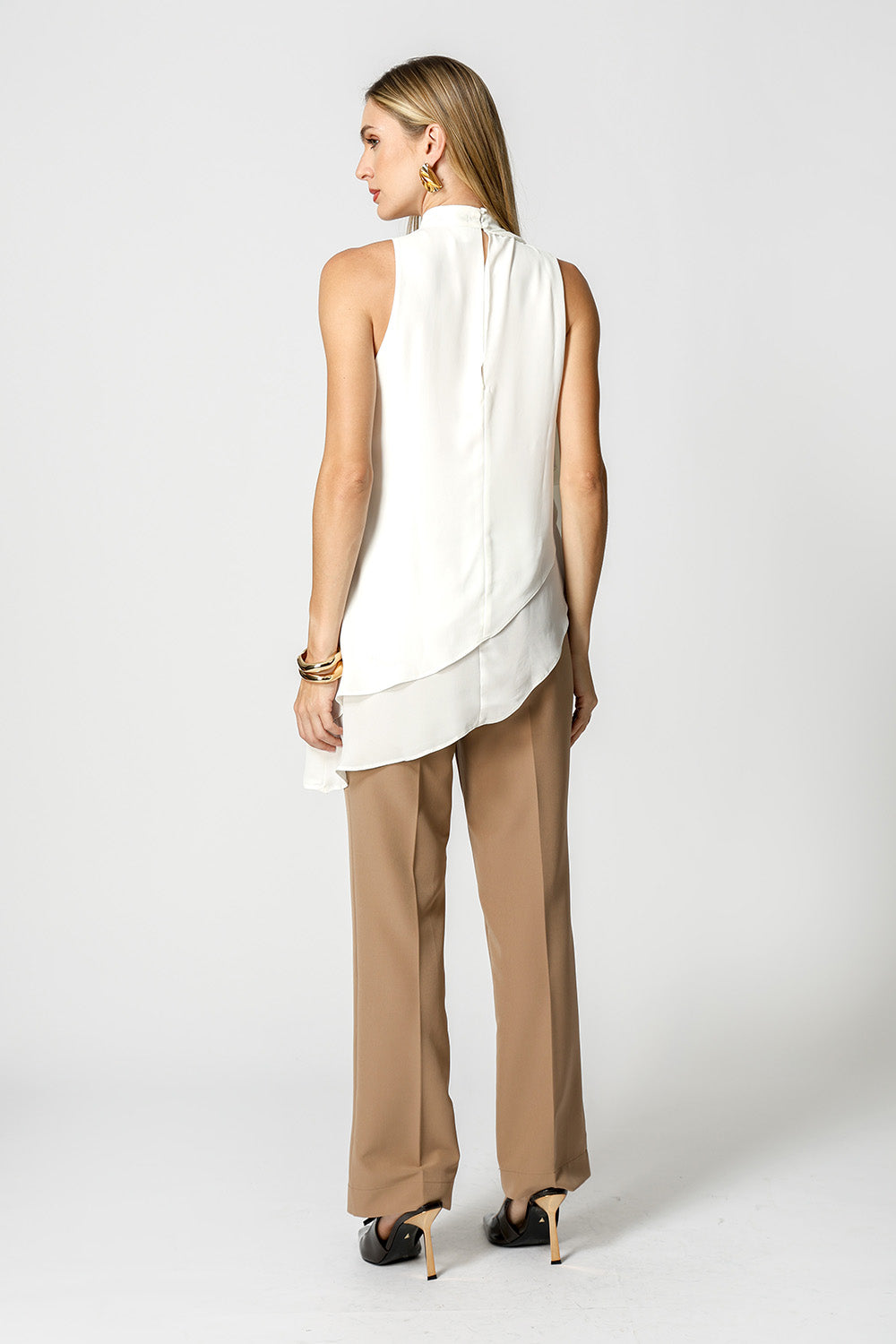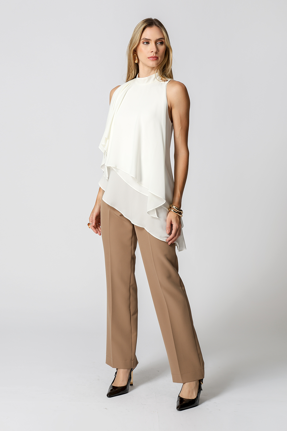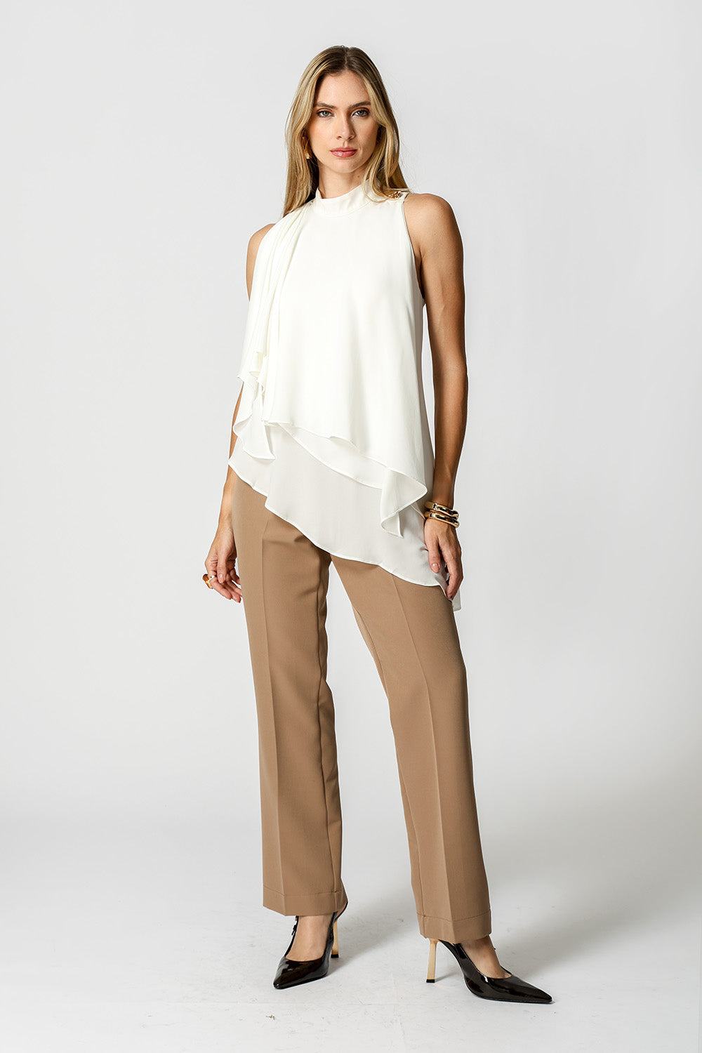 Blusa asimétrica de 3 capas de crepe fluido que se puede llevar de diferentes maneras. Tiene diferentes detalles de botones. ¡Una pieza elegante llena de detalles!