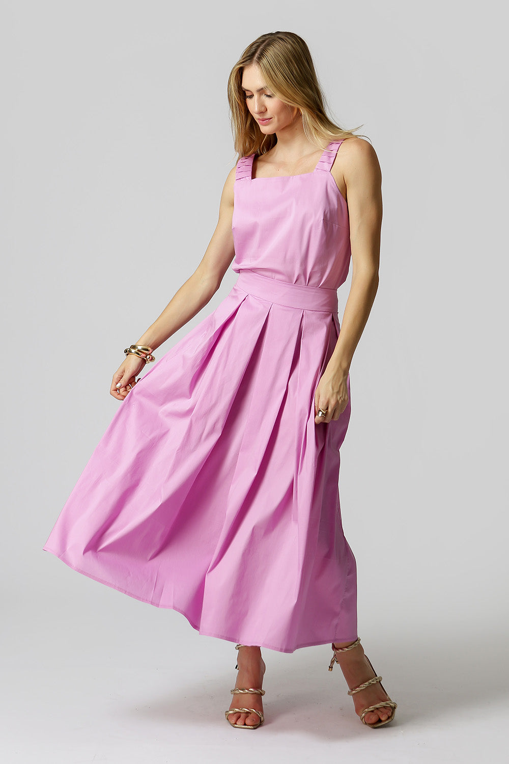 Tiene pliegues en los tirantes, abertura en el bajo y botones en la espalda.