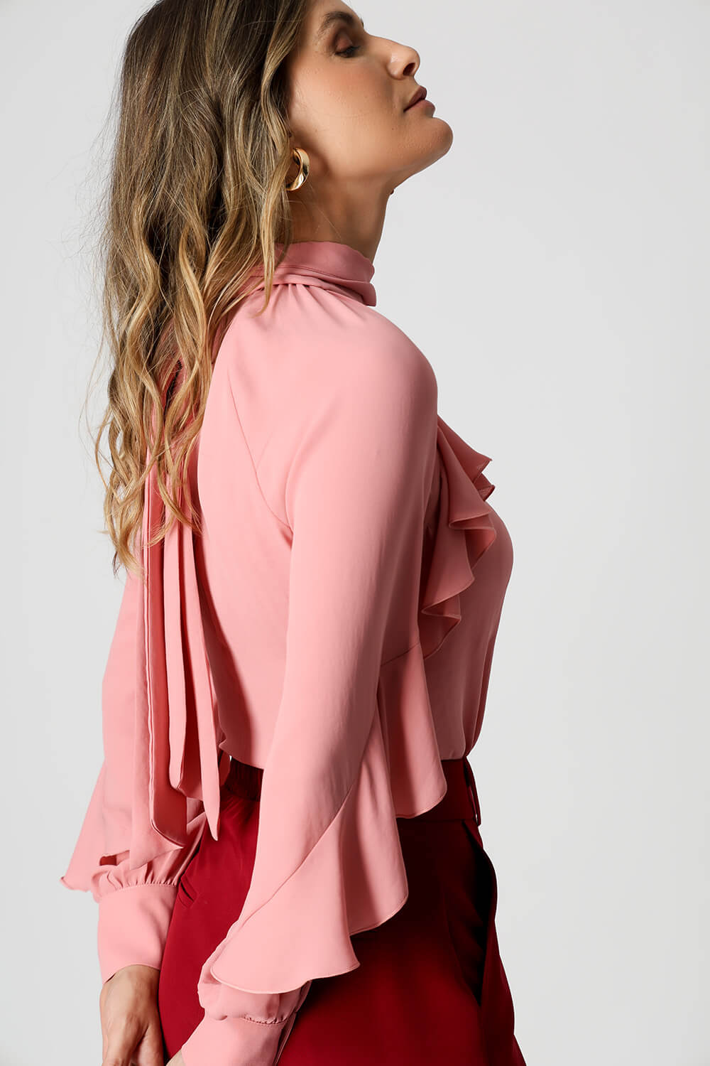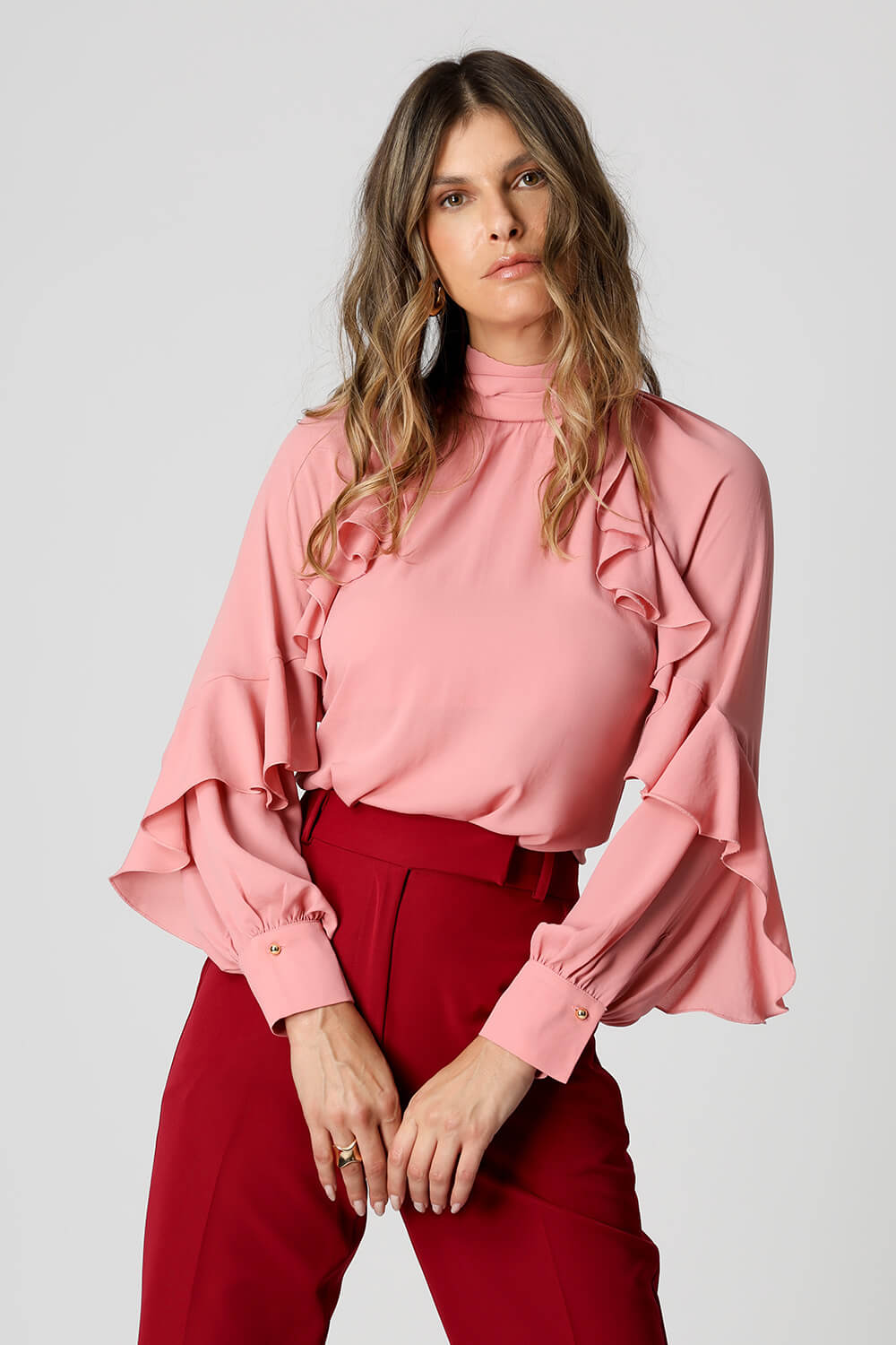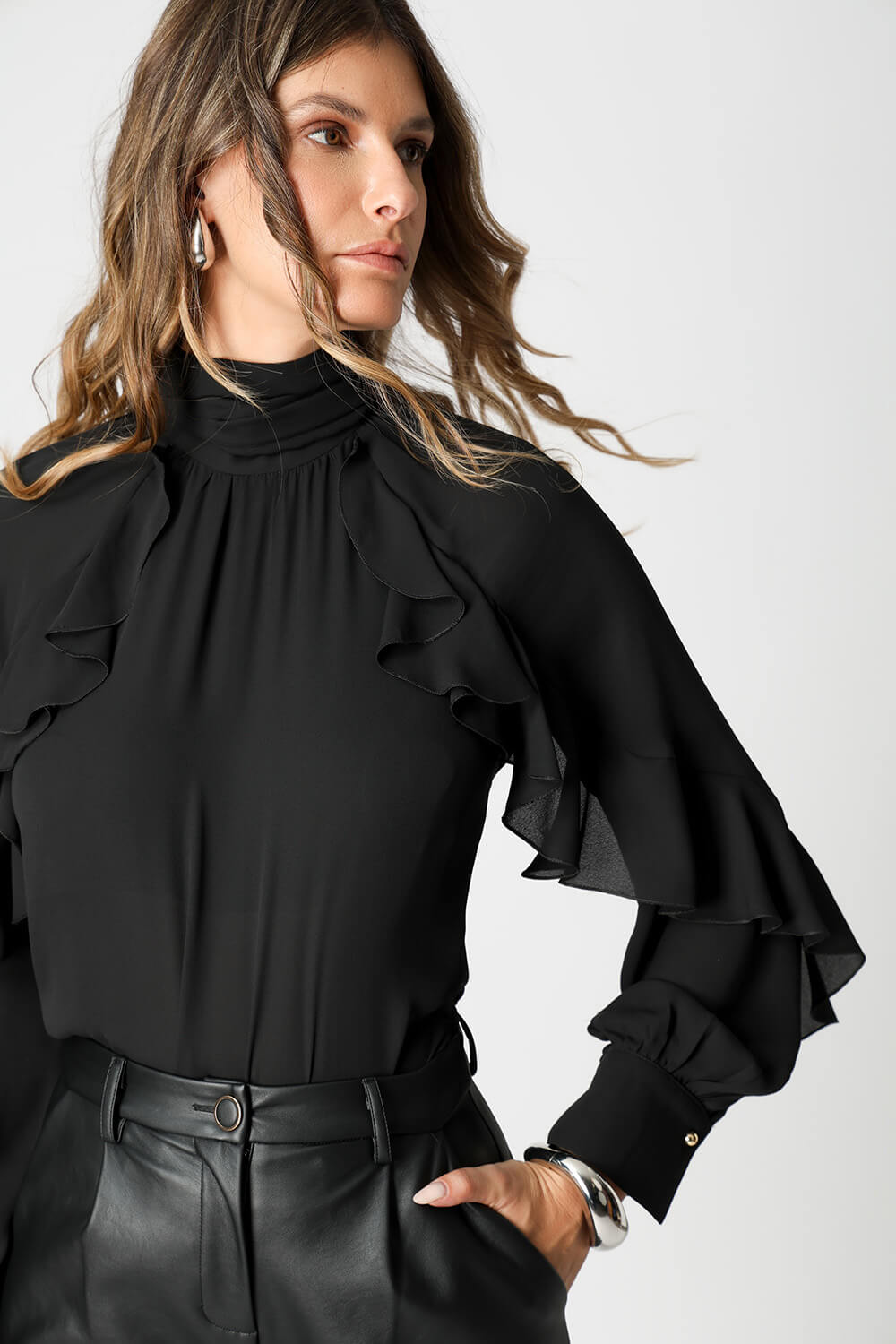 Blusa de Crepe Fluido com babados que se estendem da gola alta até os punhos, criando um visual elegante e dinâmico. Possui faixa para amarração embutida na parte de trás da gola.