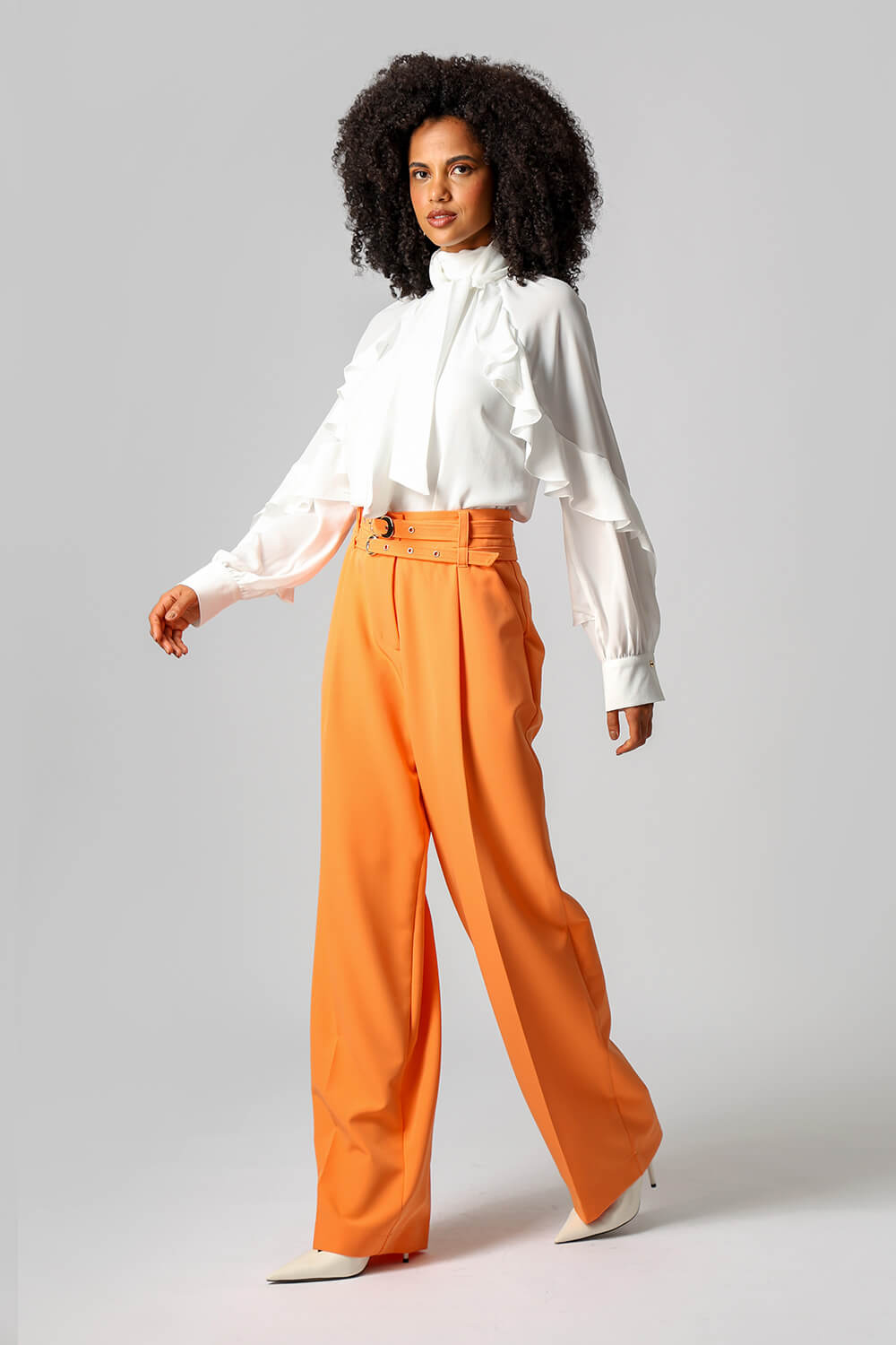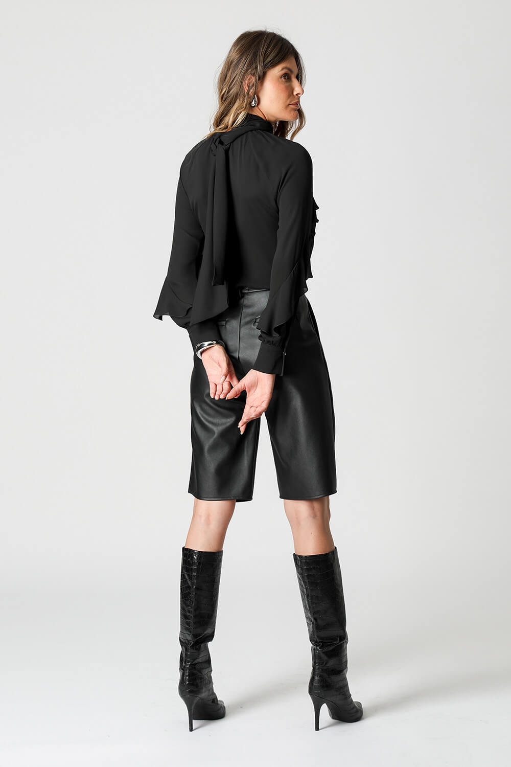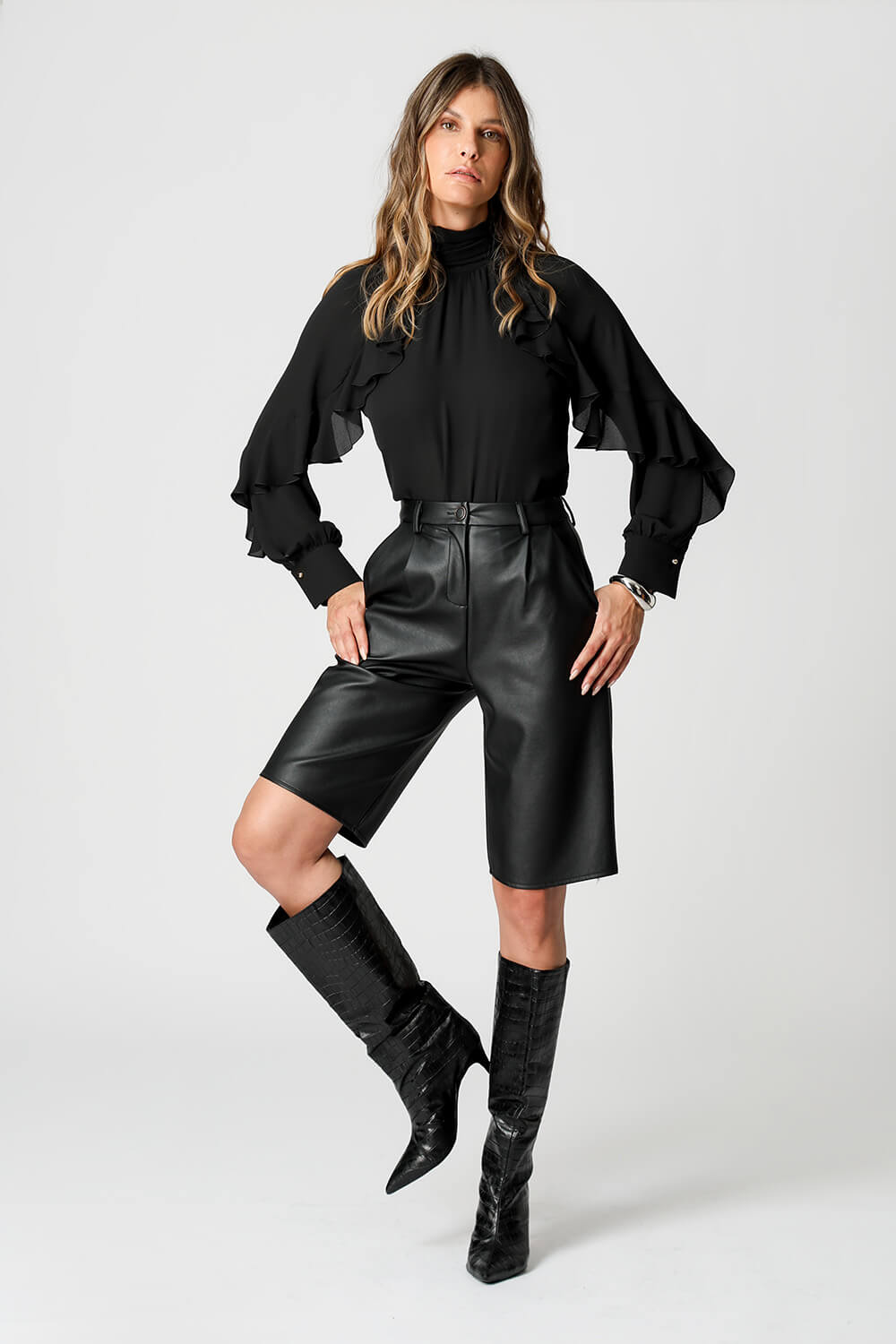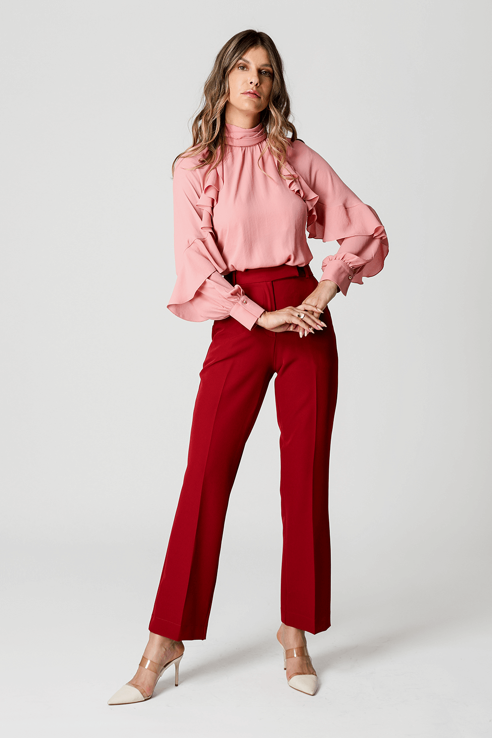 Blusa de Crepe Fluido com babados que se estendem da gola alta até os punhos, criando um visual elegante e dinâmico. Possui faixa para amarração embutida na parte de trás da gola.