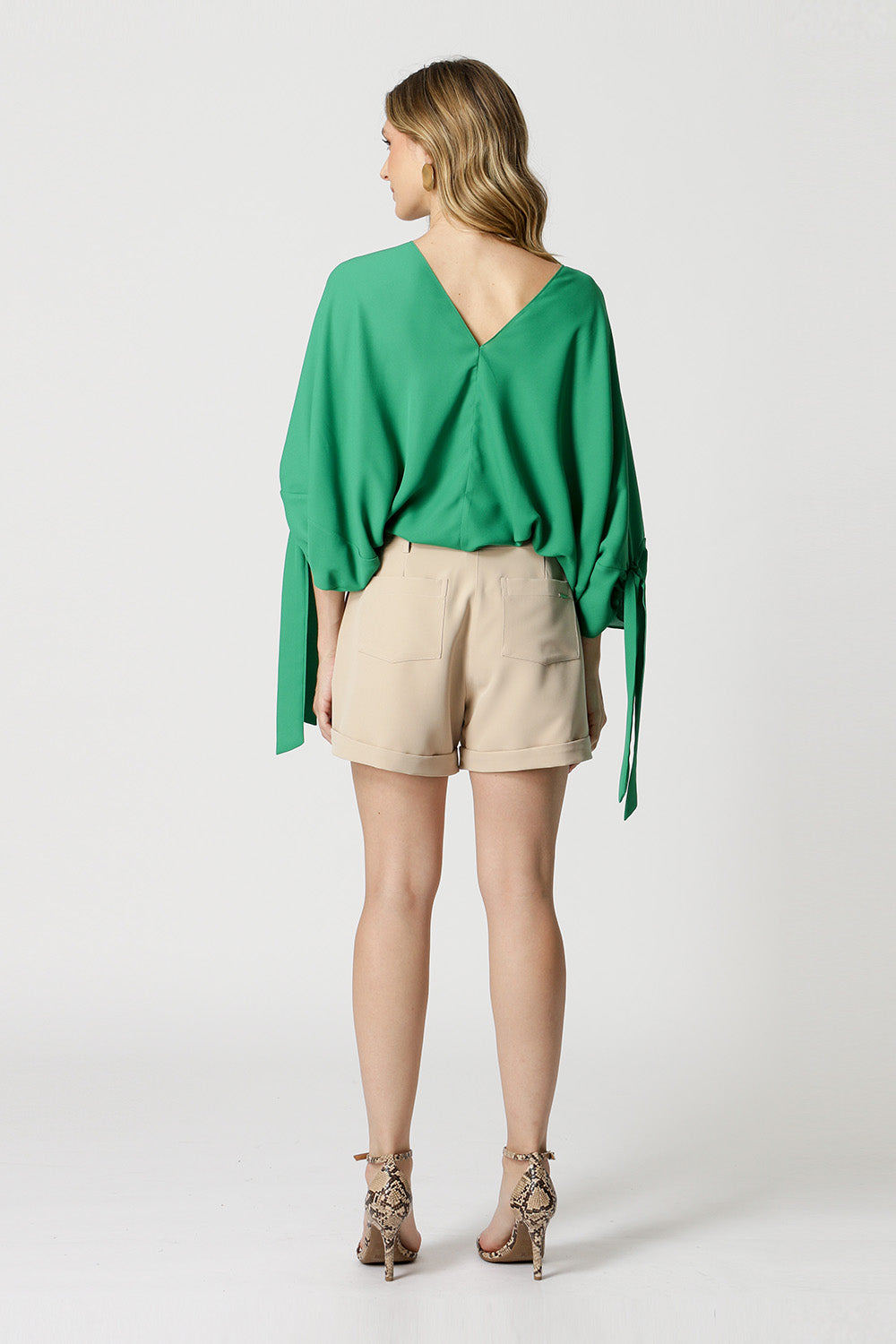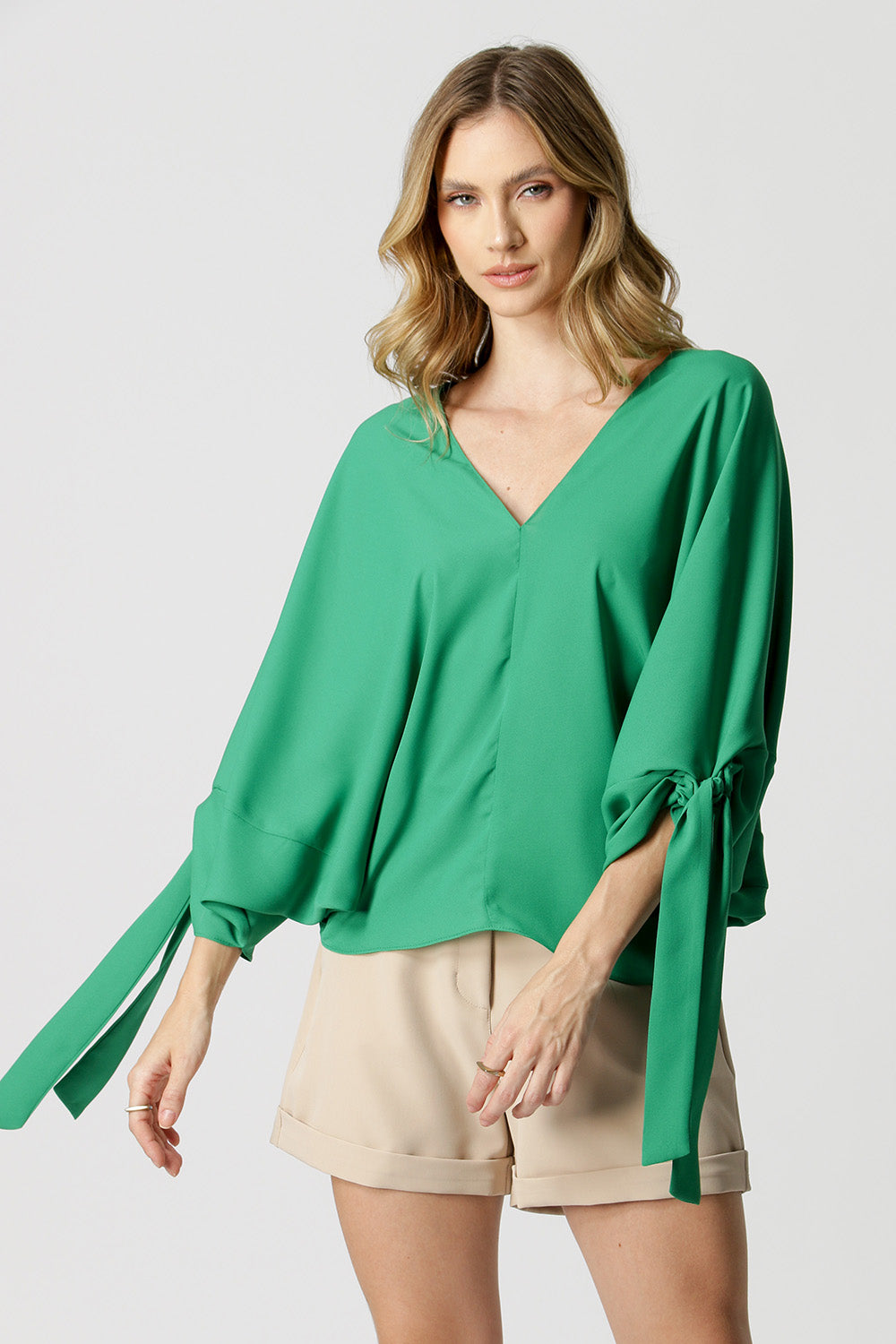 Blusa holgada, escote en pico con detalle de lazo al final de la manga. Pieza súper casual para lucir un look casual.