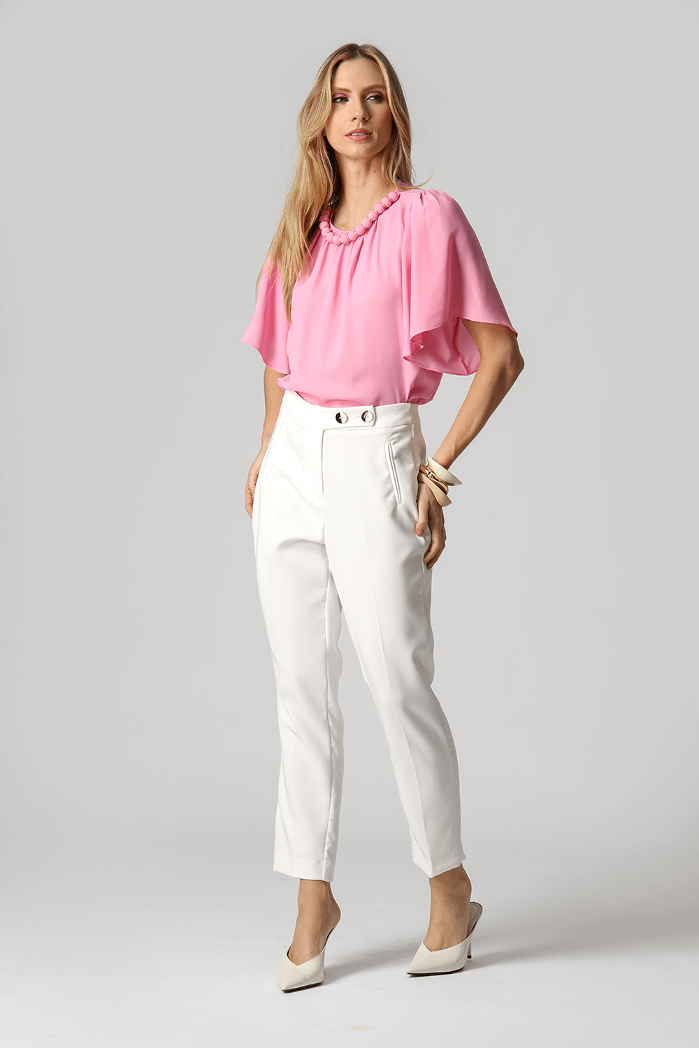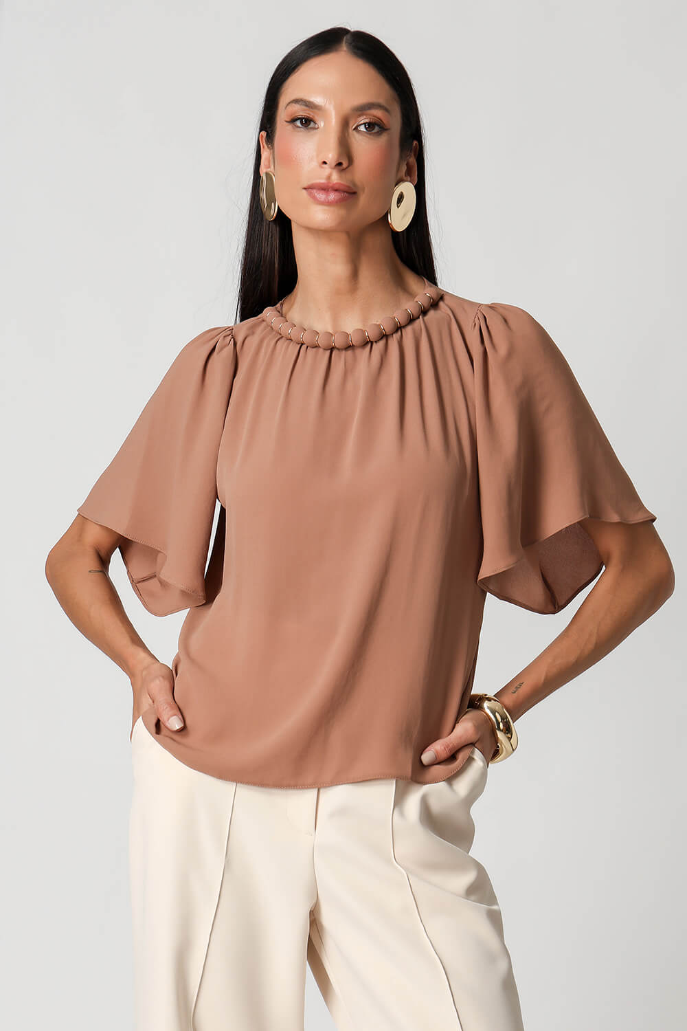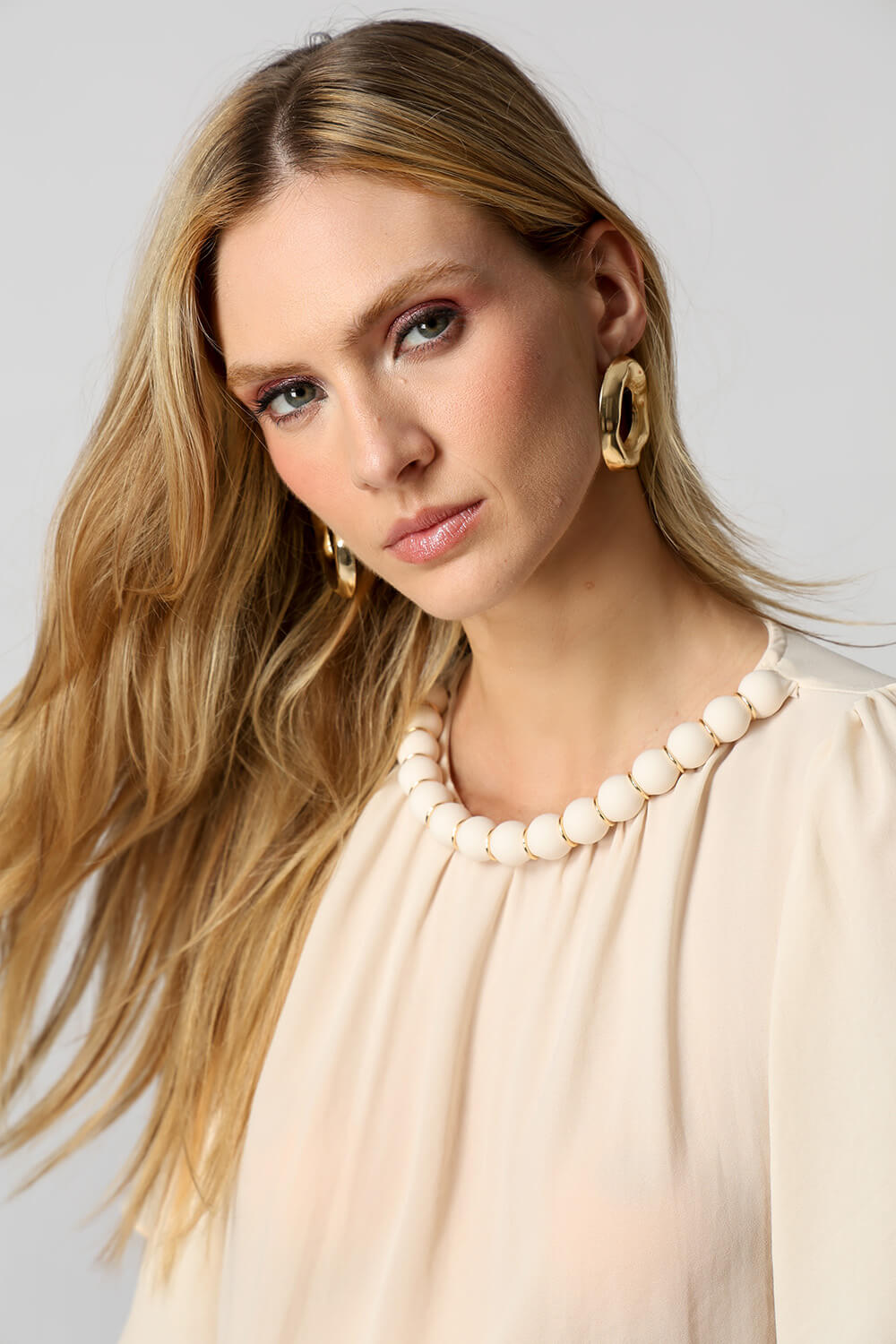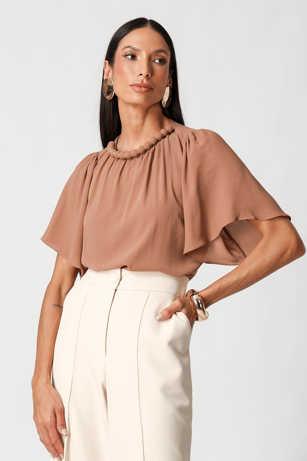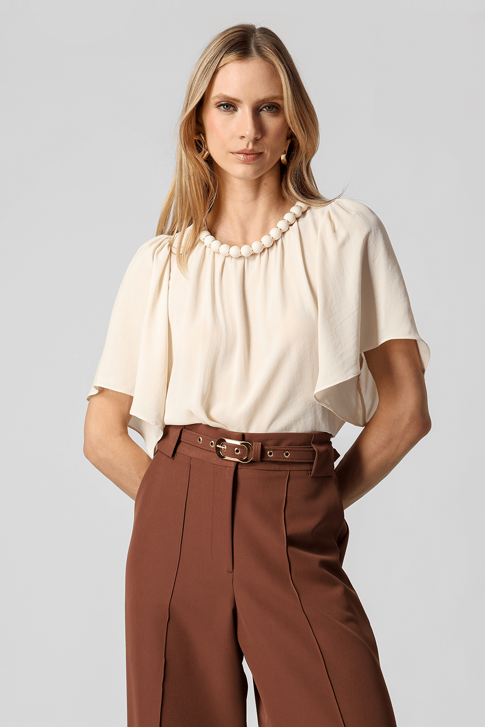 Blusa de manga estilo angel confeccionada em crepe fluido, com caimento leve e elegante. Acompanha colar fixo de esferas e aros dourados, que valoriza o visual com um toque sofisticado. Ideal para composições modernas e femininas.