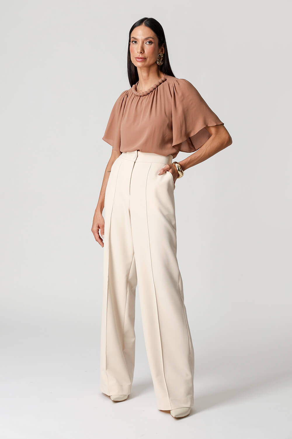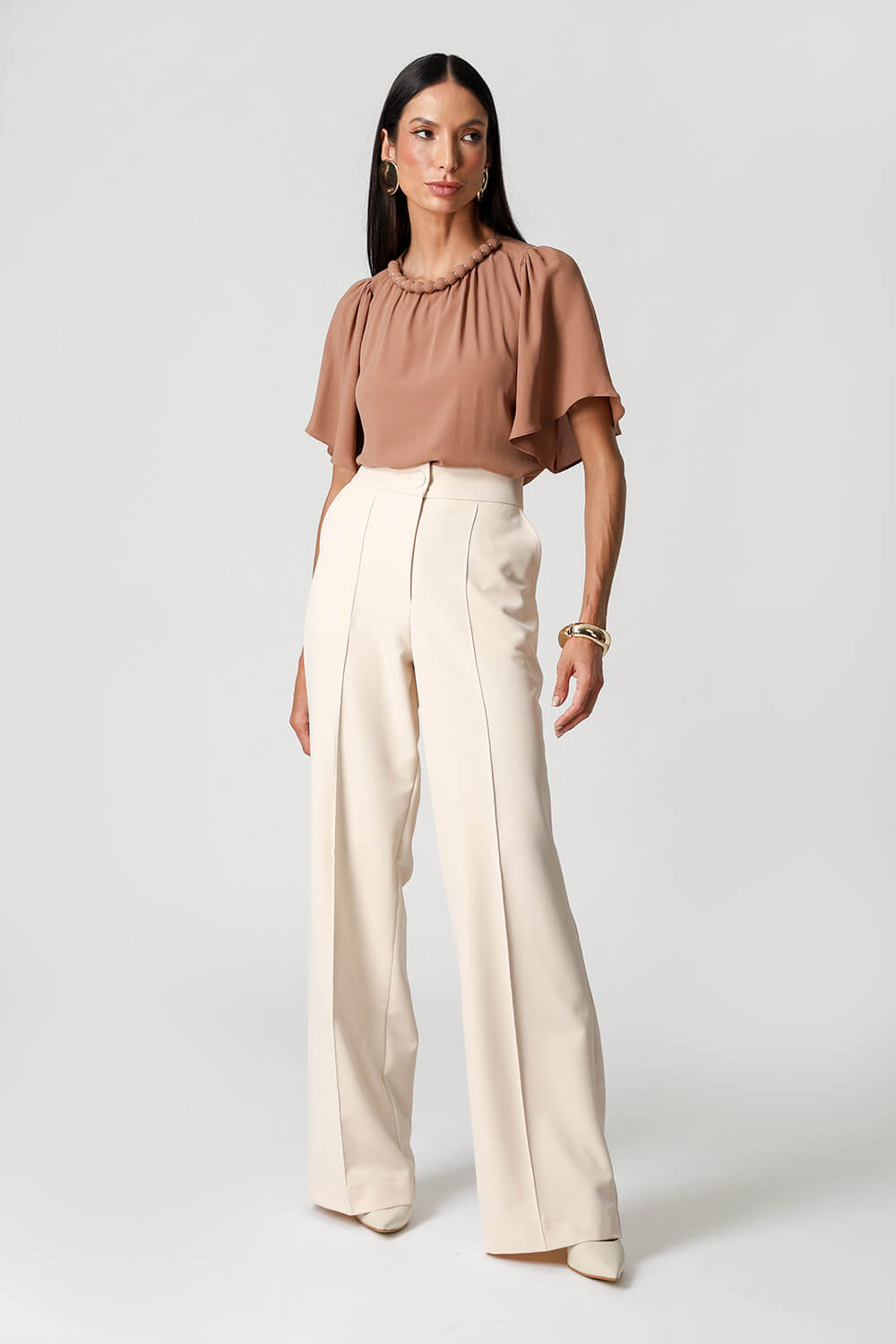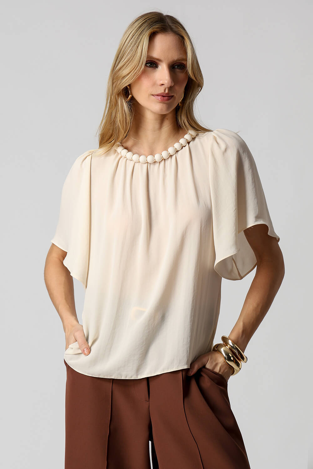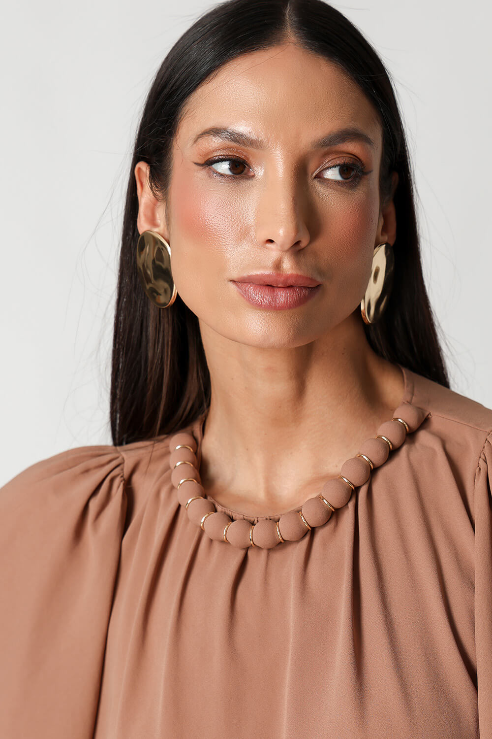Blusa de manga estilo angel confeccionada em crepe fluido, com caimento leve e elegante. Acompanha colar fixo de esferas e aros dourados, que valoriza o visual com um toque sofisticado. Ideal para composições modernas e femininas.