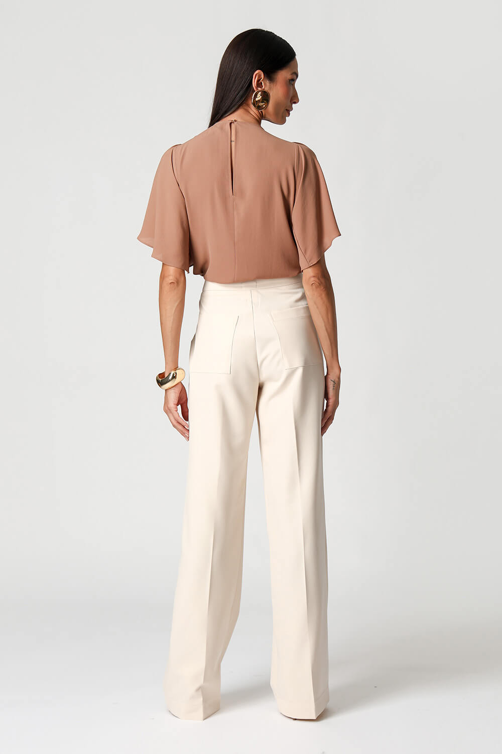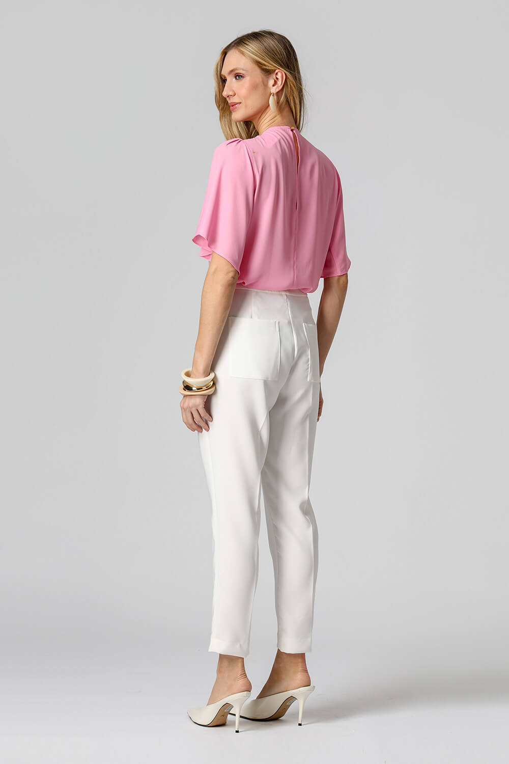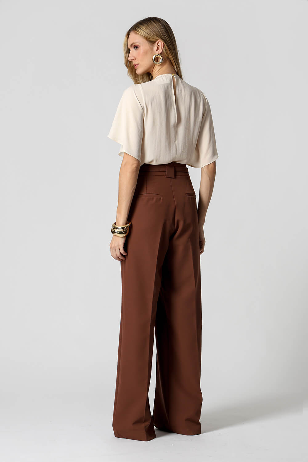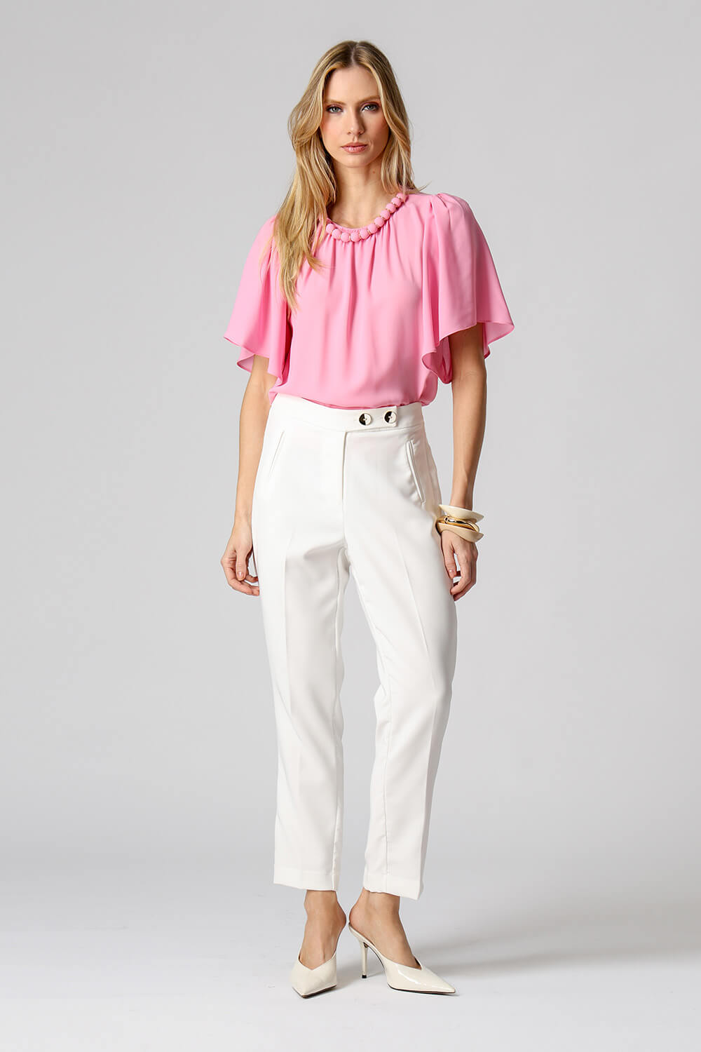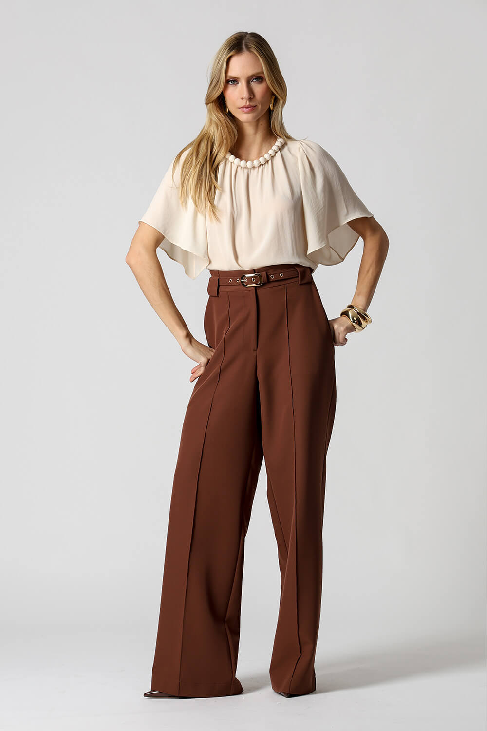 Blusa de manga estilo angel confeccionada em crepe fluido, com caimento leve e elegante. Acompanha colar fixo de esferas e aros dourados, que valoriza o visual com um toque sofisticado. Ideal para composições modernas e femininas.