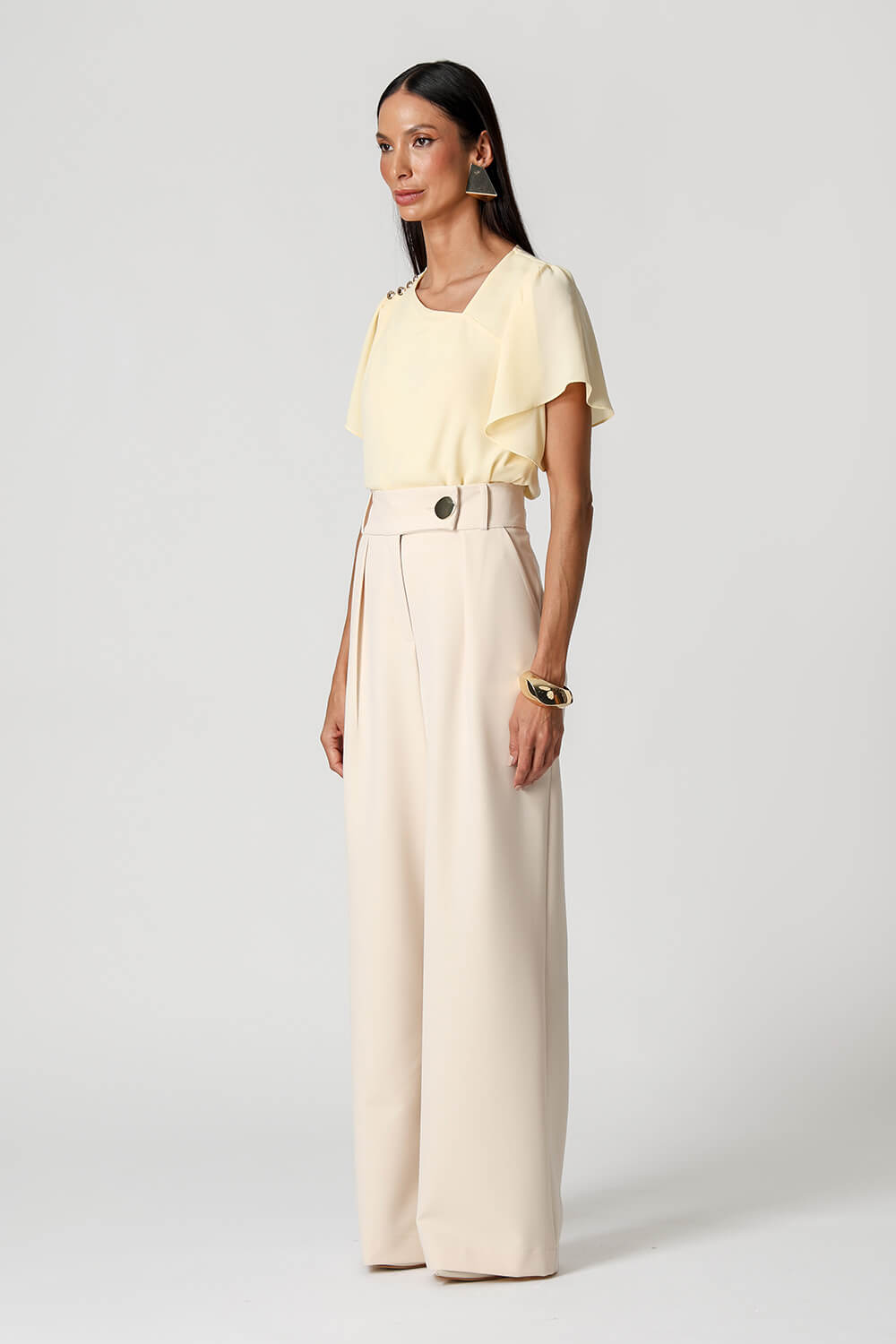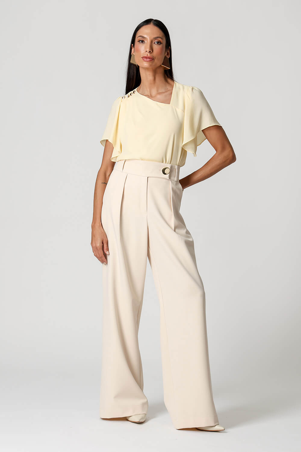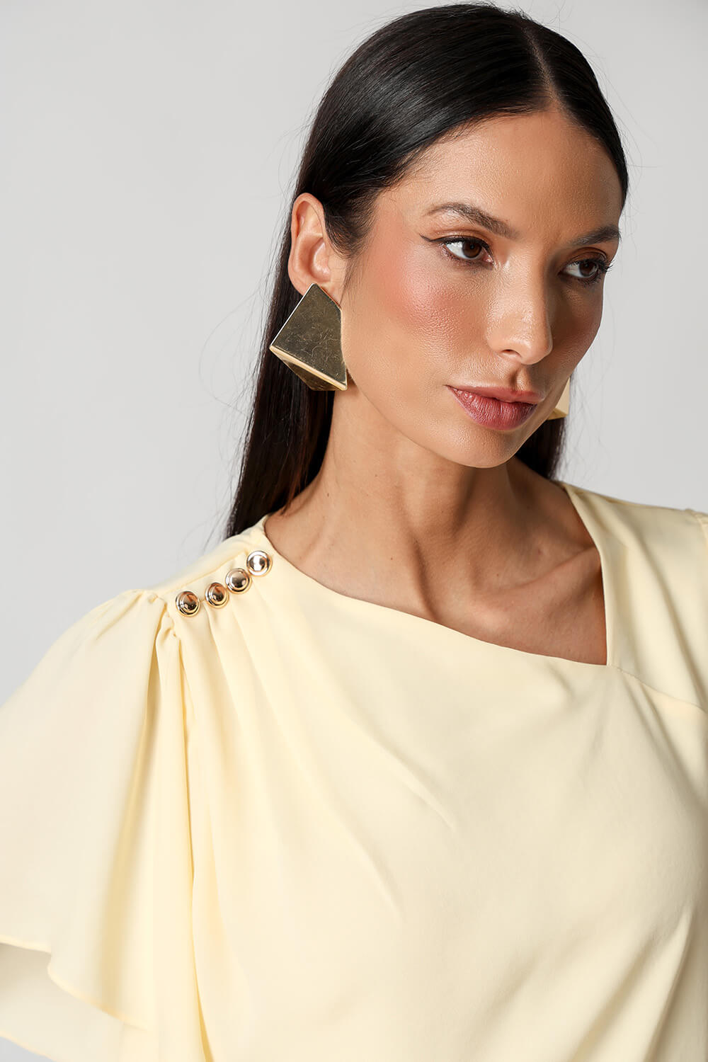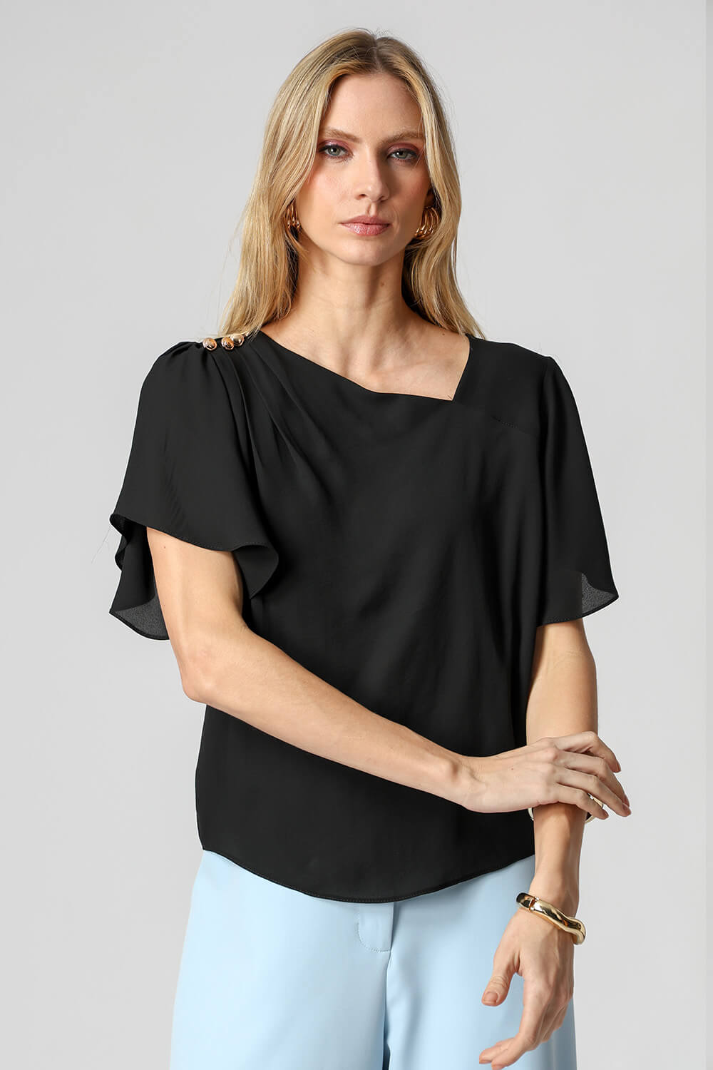 Blusa em crepe fluido com decote assimétrico, ombro com pregas e detalhes de botões decorativos. Possui manga angel que adiciona leveza e movimento ao look, unindo elegância e modernidade.