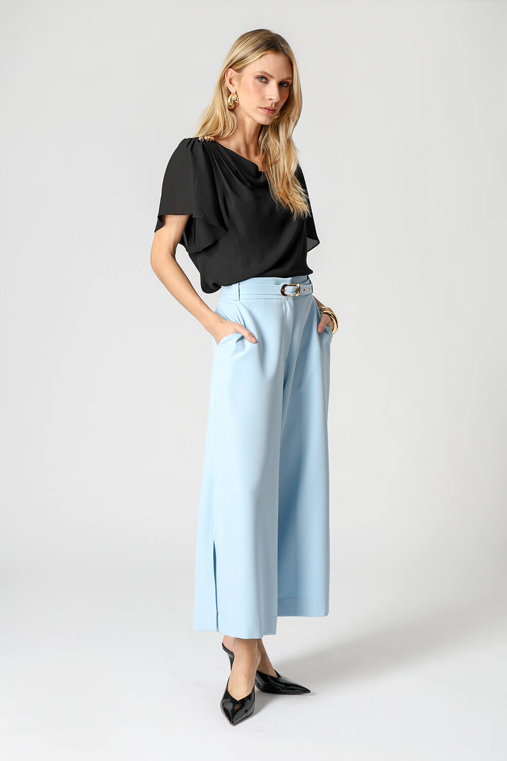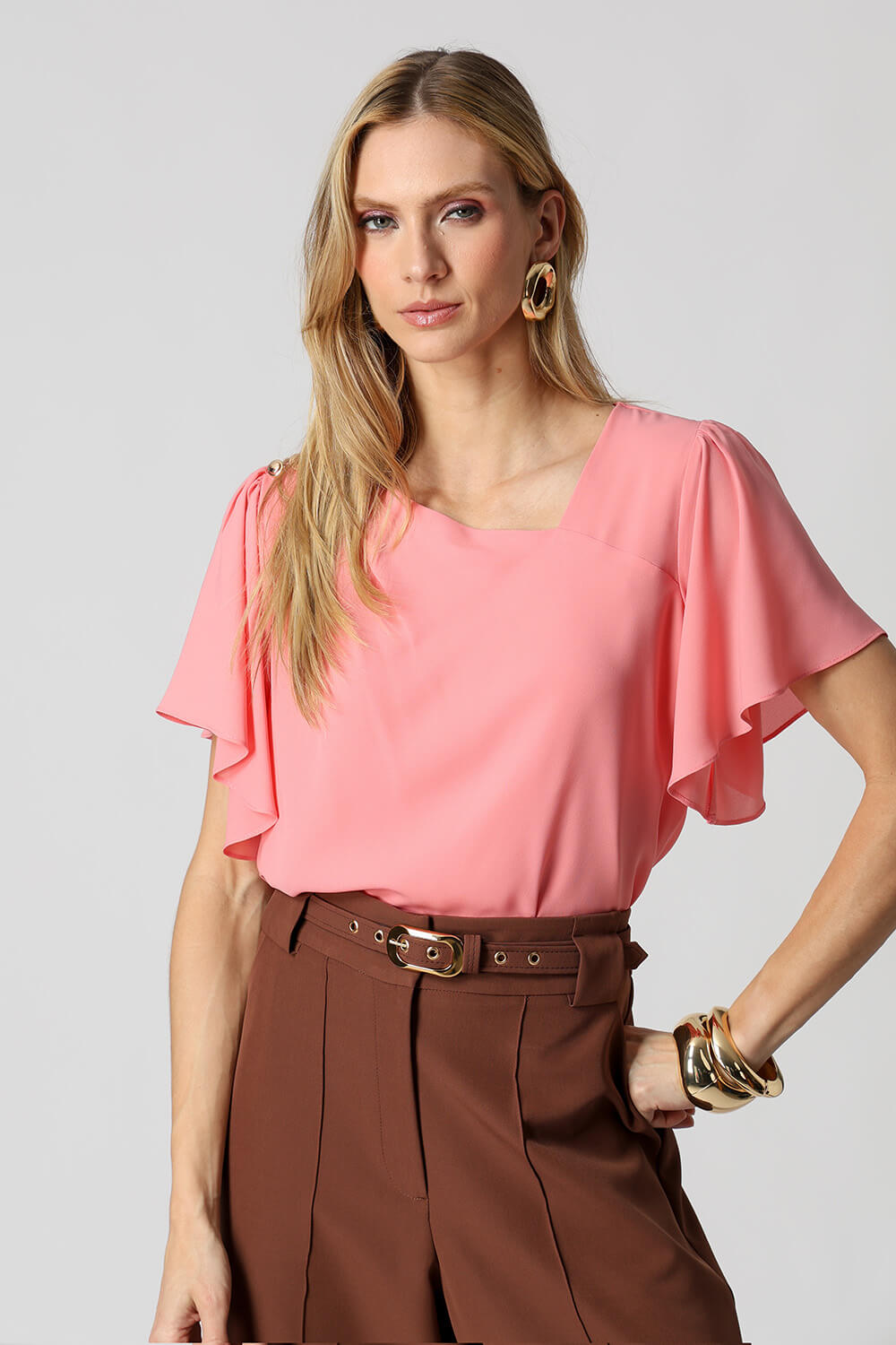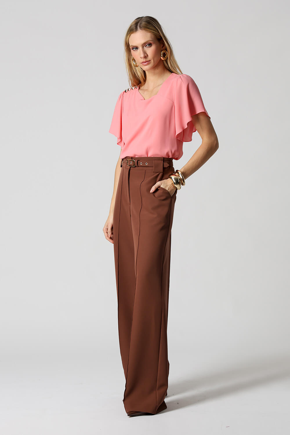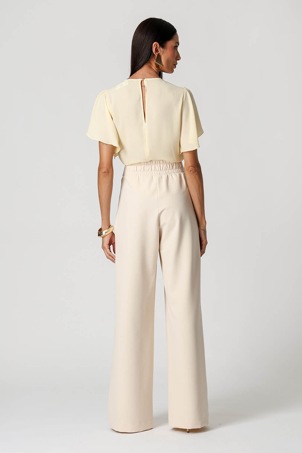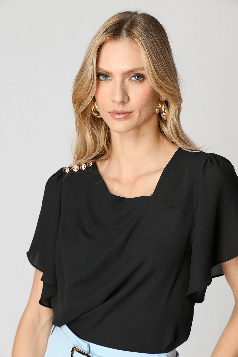 Blusa em crepe fluido com decote assimétrico, ombro com pregas e detalhes de botões decorativos. Possui manga angel que adiciona leveza e movimento ao look, unindo elegância e modernidade.