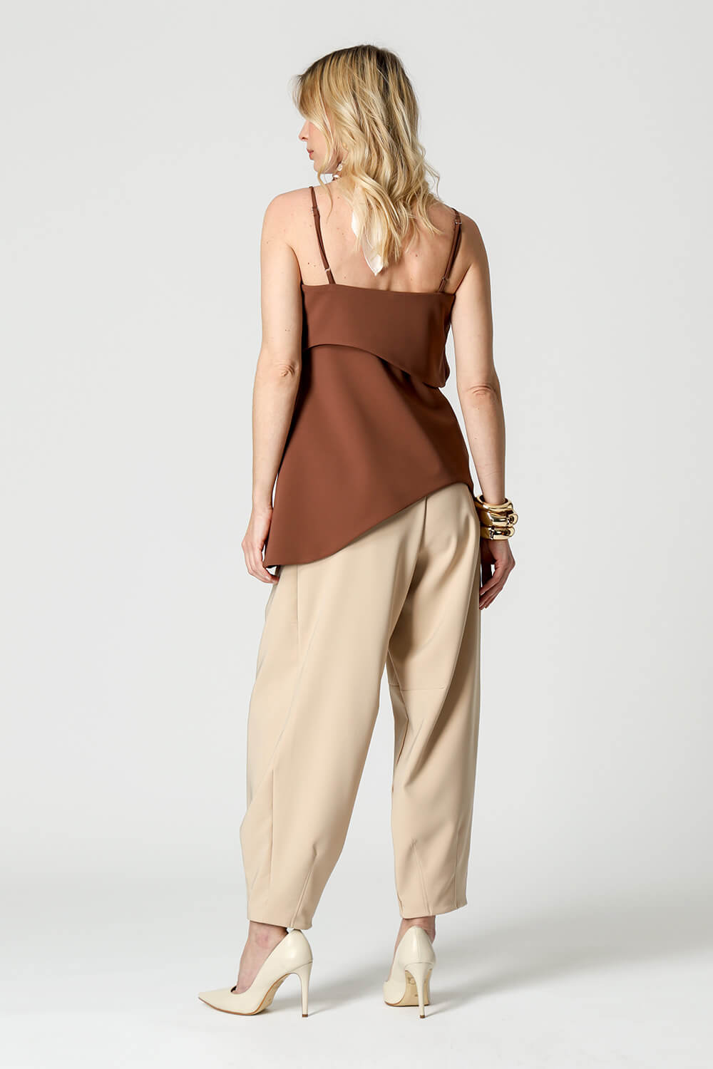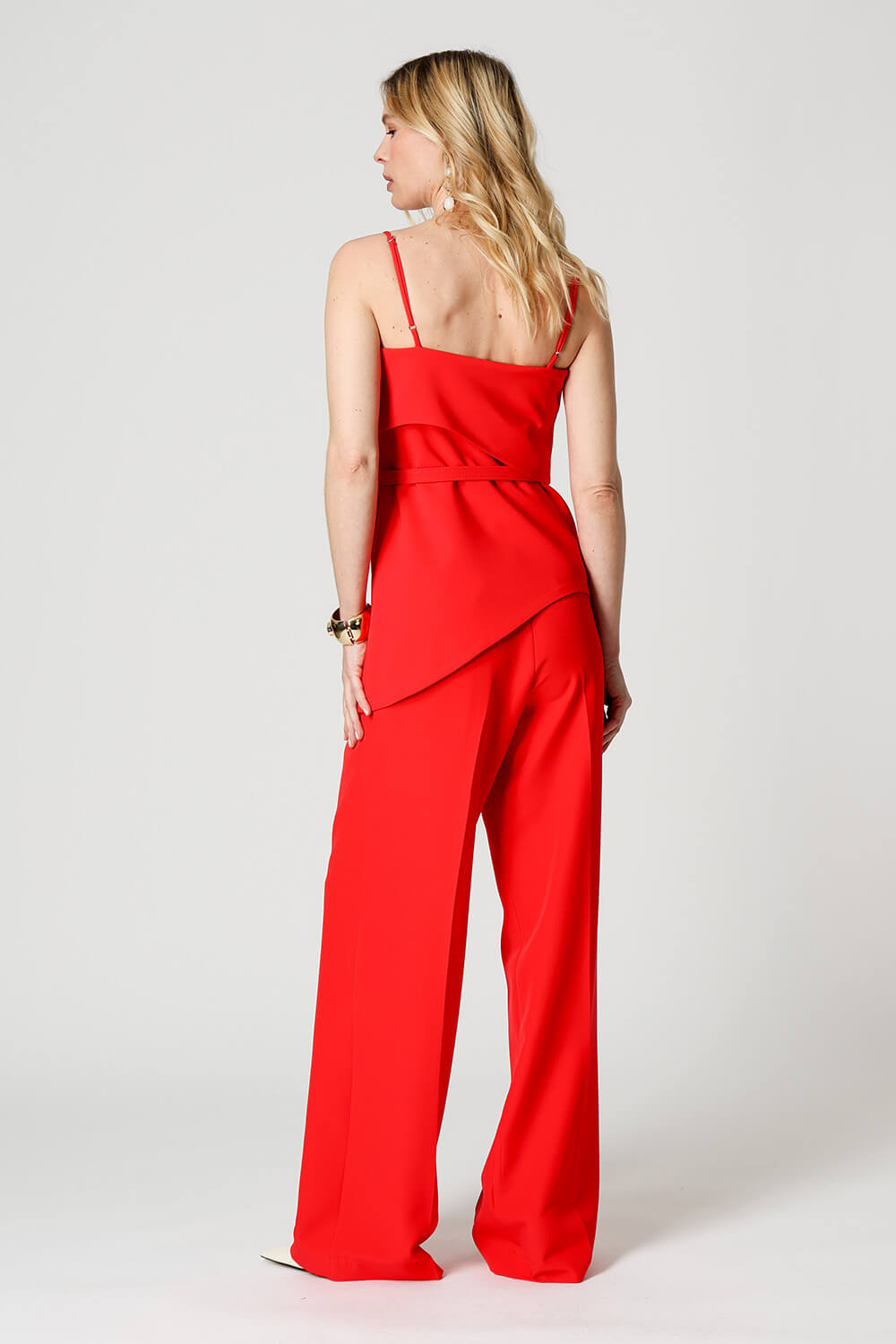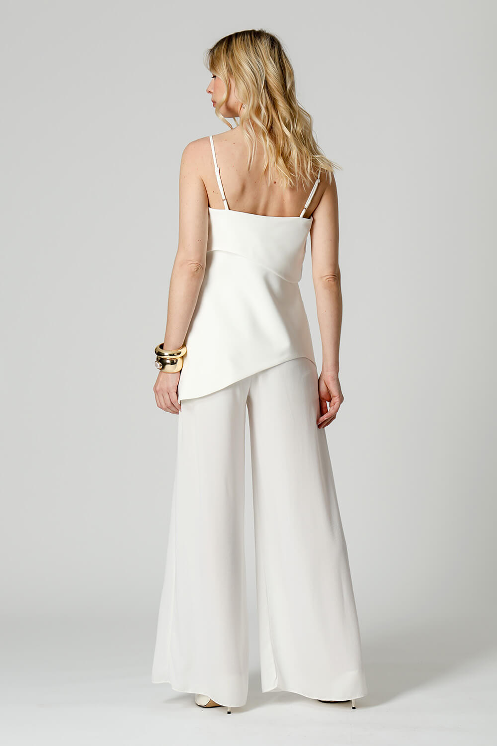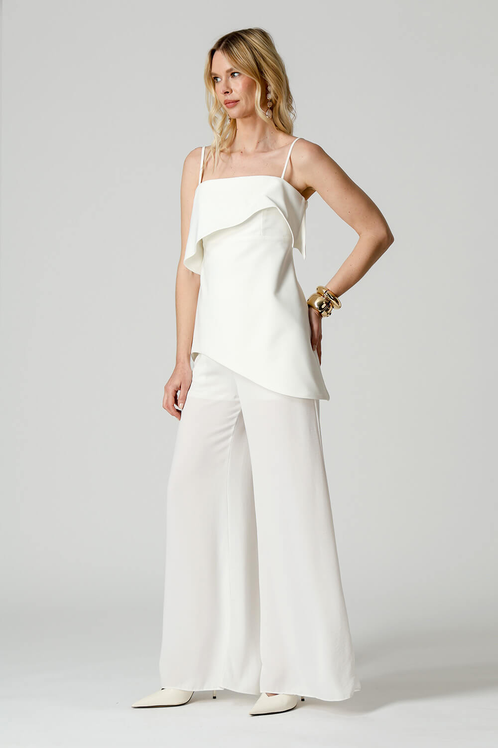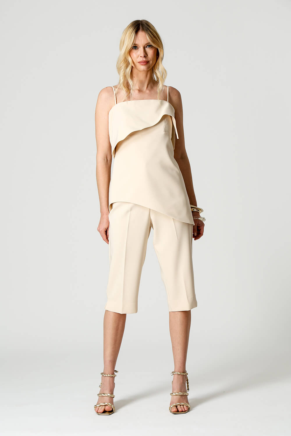 Blusa em tecido de alfaiataria com alças reguláveis e pala estruturada. A barra assimétrica em formato ondular traz movimento e um toque moderno à peça, perfeita para compor looks elegantes e atuais.