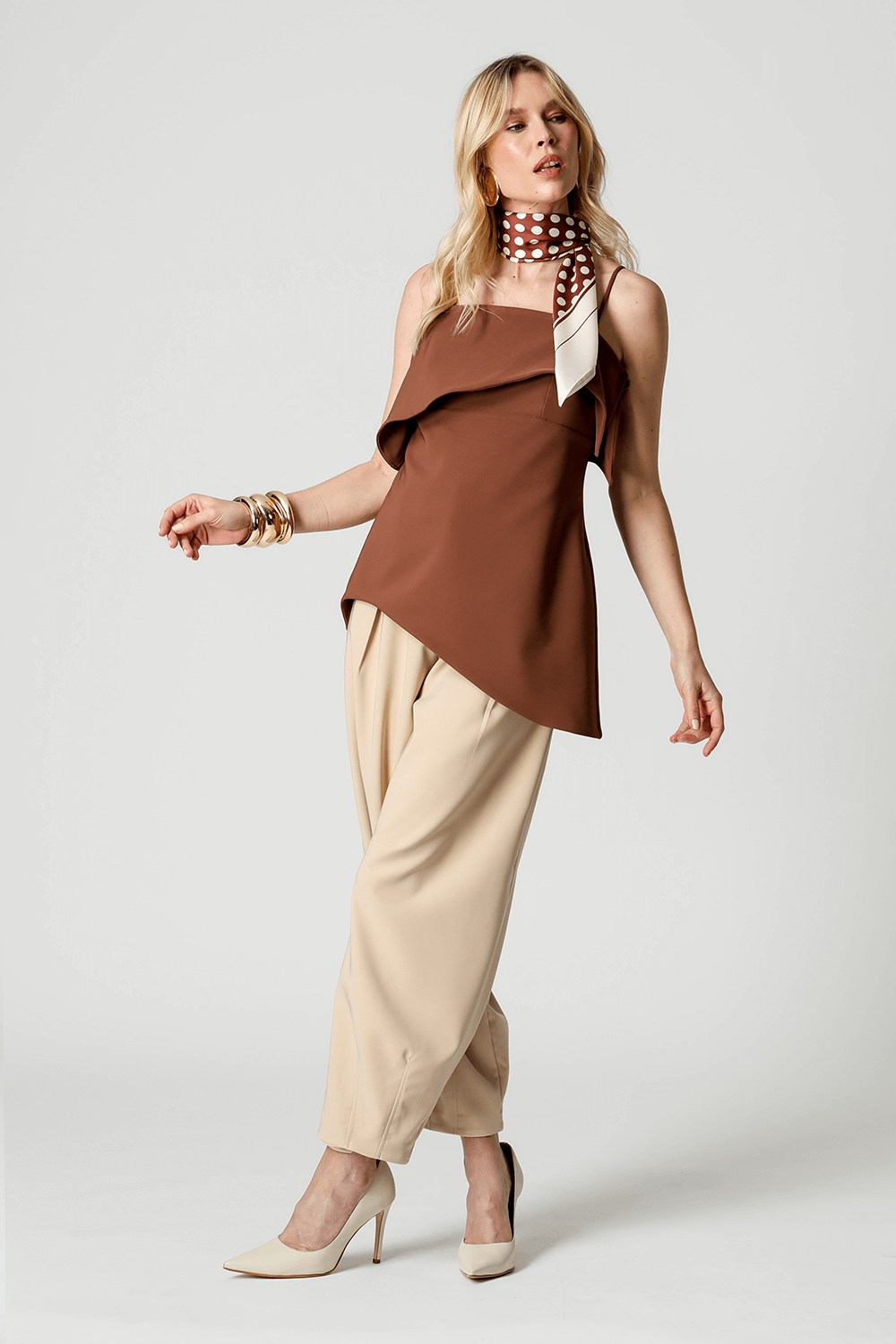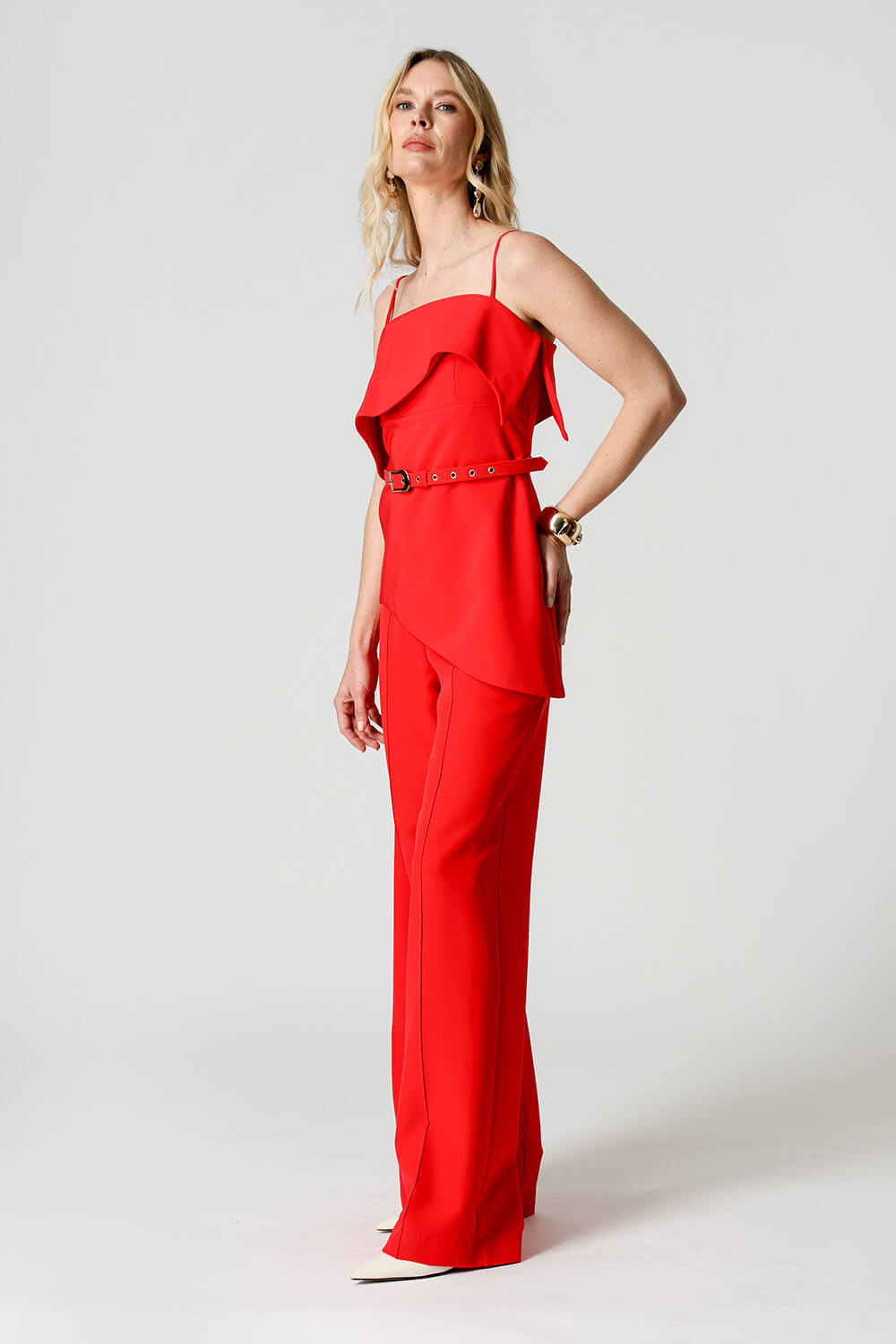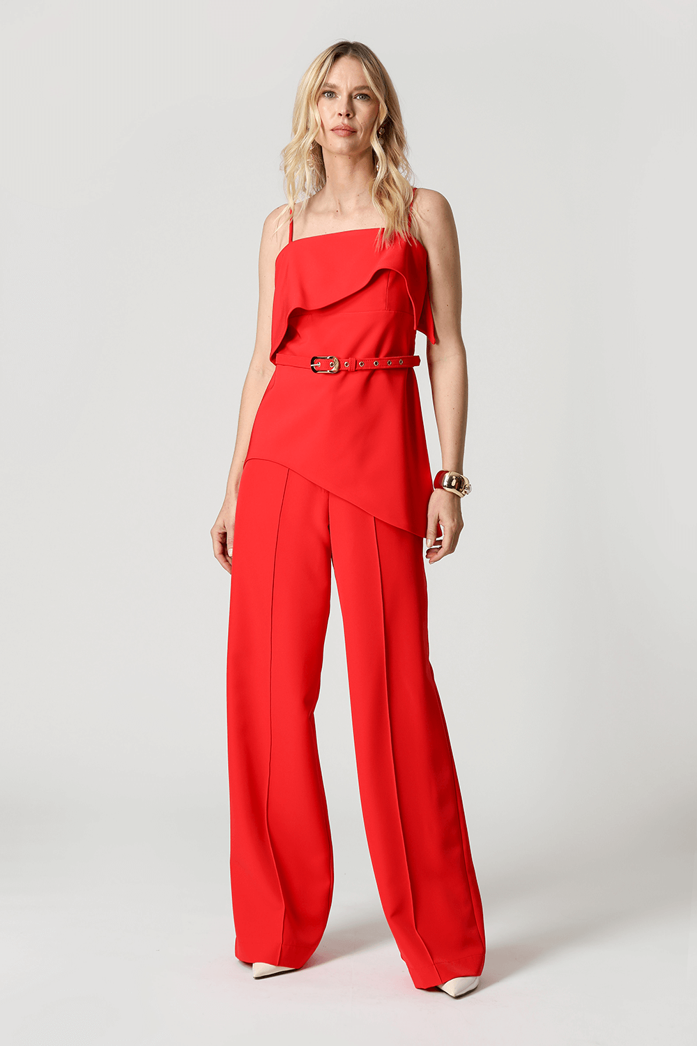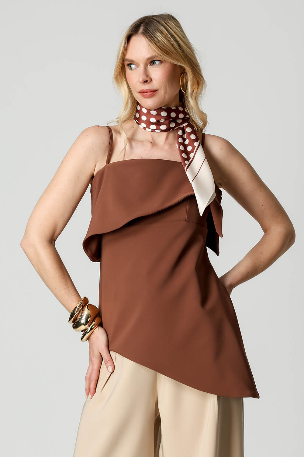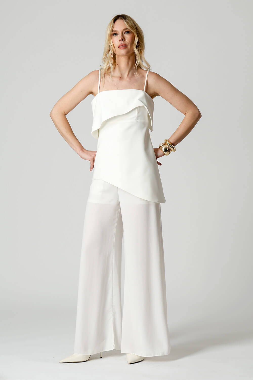 Blusa em tecido de alfaiataria com alças reguláveis e pala estruturada. A barra assimétrica em formato ondular traz movimento e um toque moderno à peça, perfeita para compor looks elegantes e atuais.
