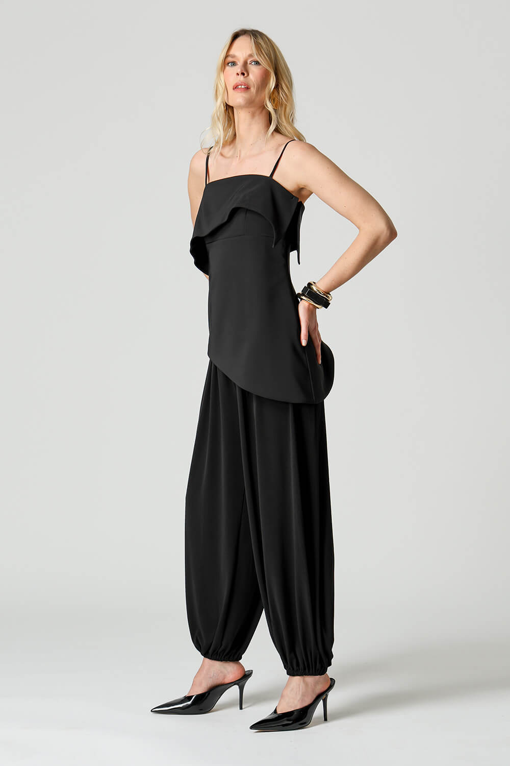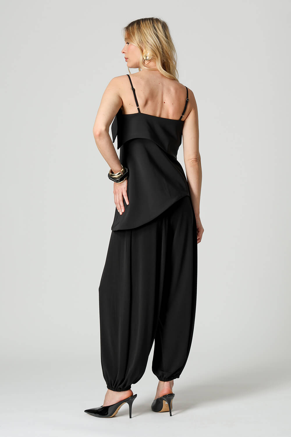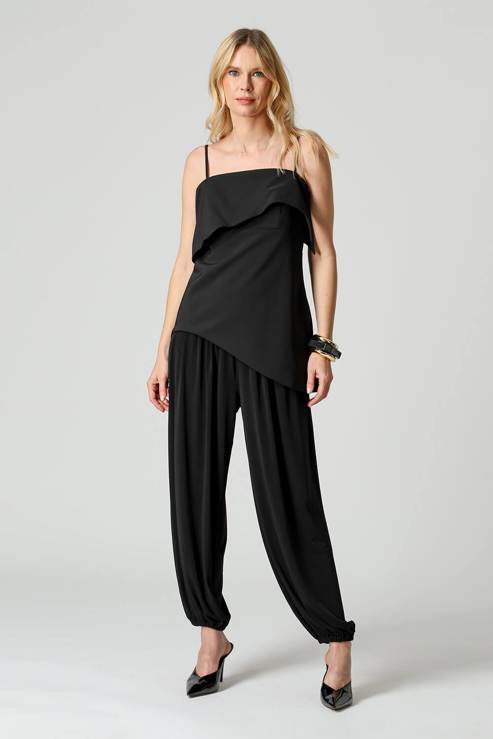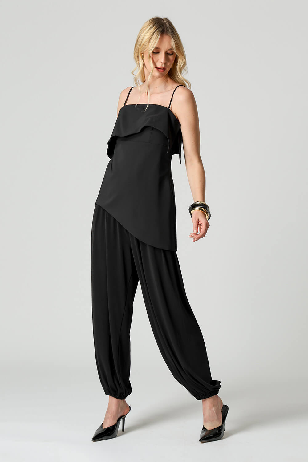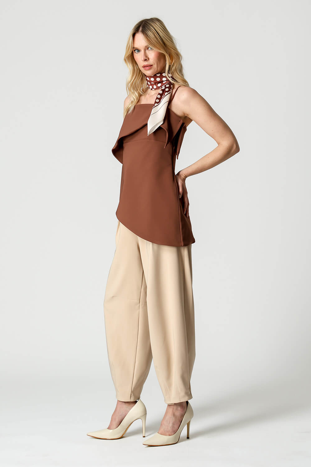 Blusa em tecido de alfaiataria com alças reguláveis e pala estruturada. A barra assimétrica em formato ondular traz movimento e um toque moderno à peça, perfeita para compor looks elegantes e atuais.