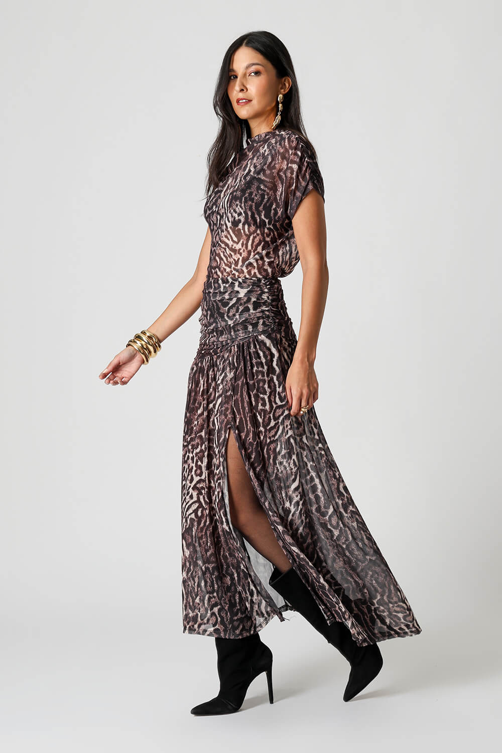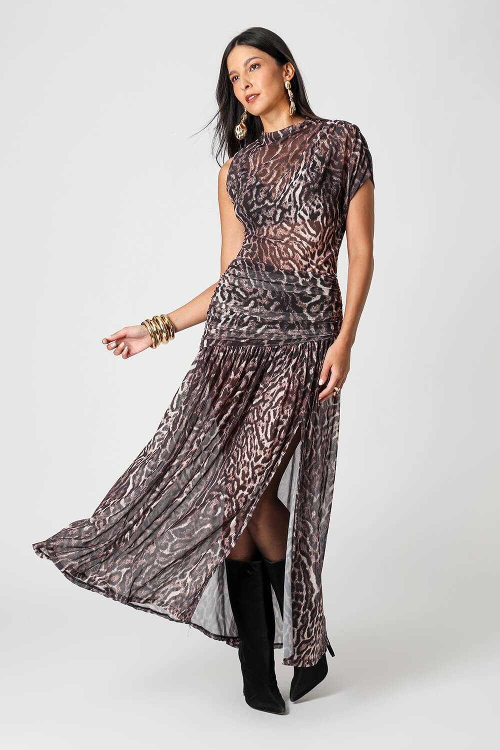 Blusa assimétrica em tule estampado, com franzido no ombro que valoriza o visual. Leve, moderna e cheia de estilo.