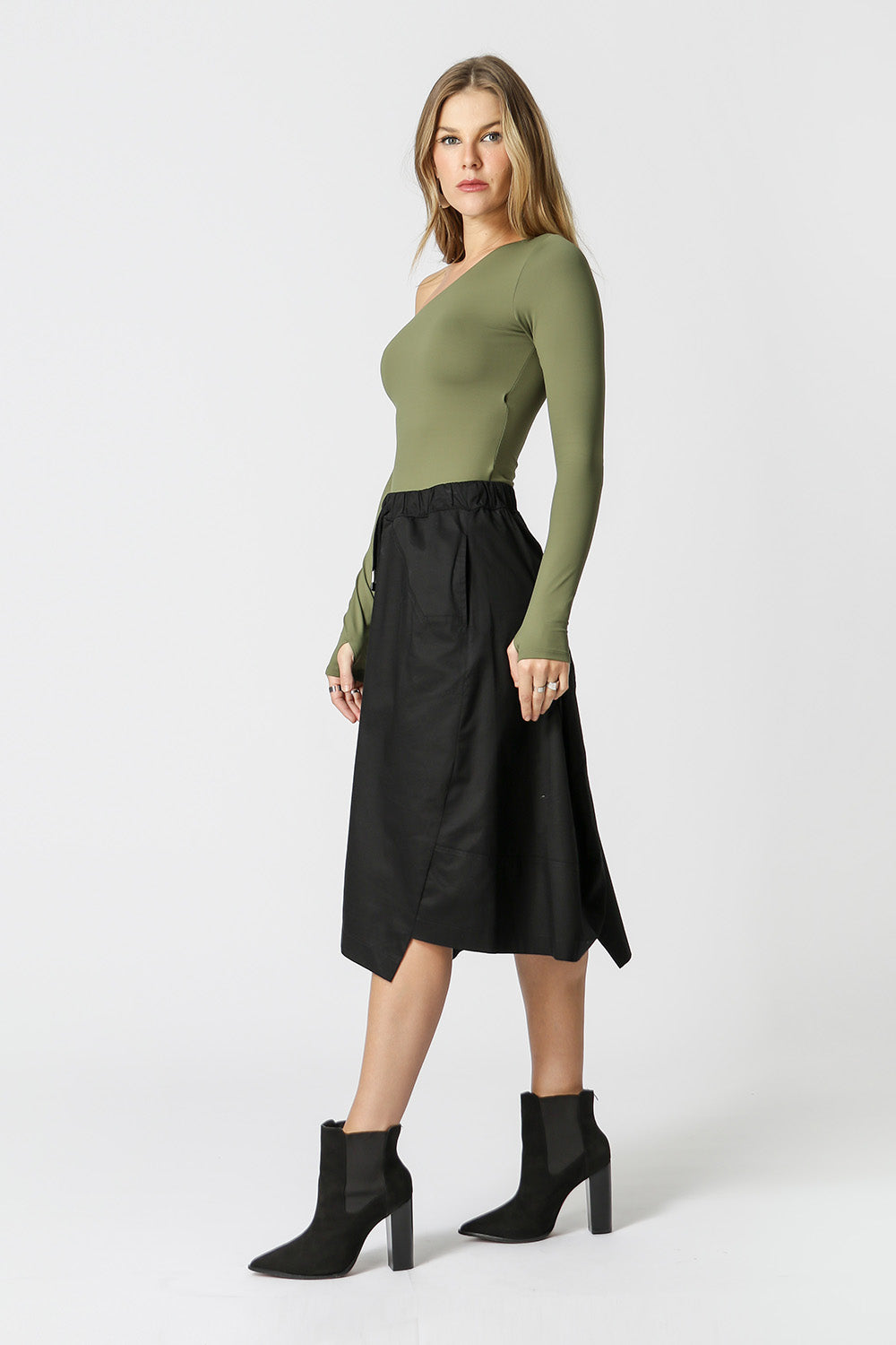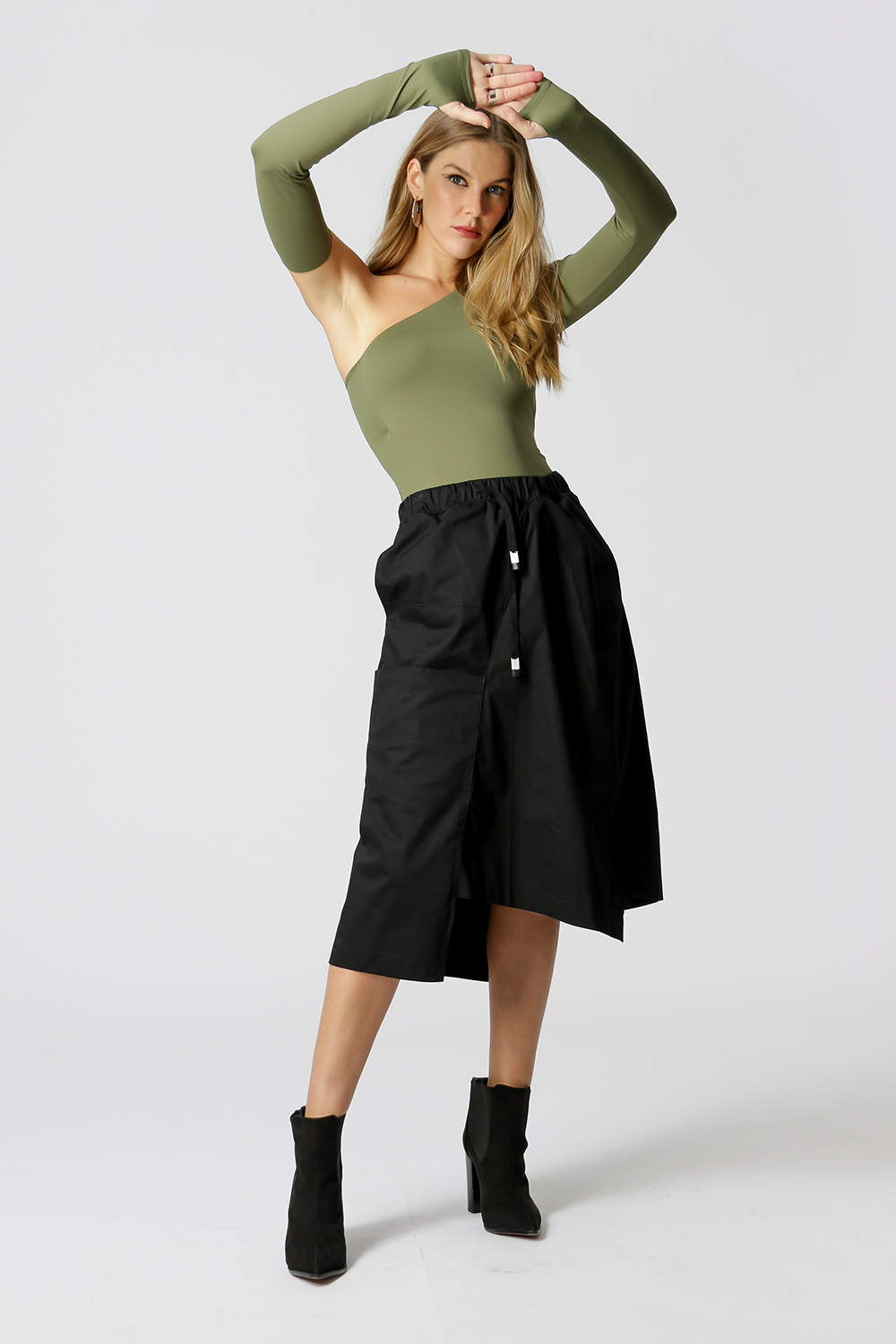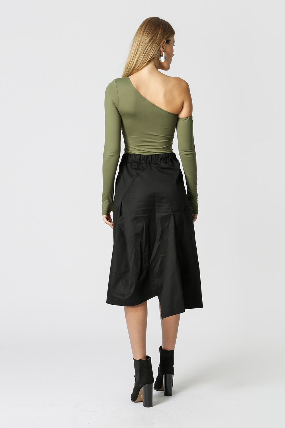 Blusa con escote asimétrico, un hombro, manga larga y detalle de apertura en el pulgar. Una pieza que viene con una funda extraíble, creando la apariencia de un guante y modernizando cualquier look.