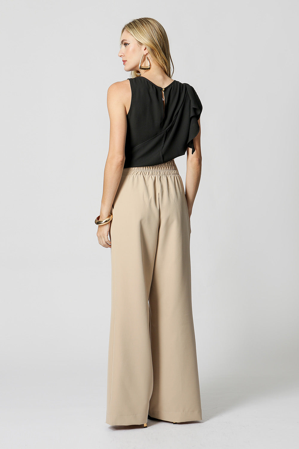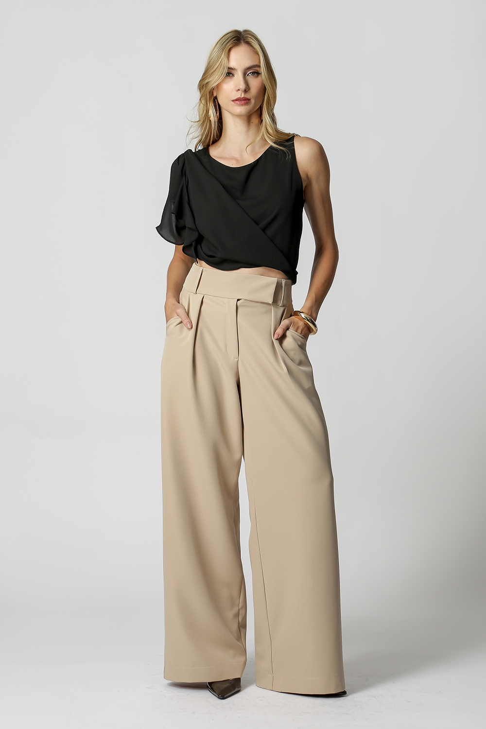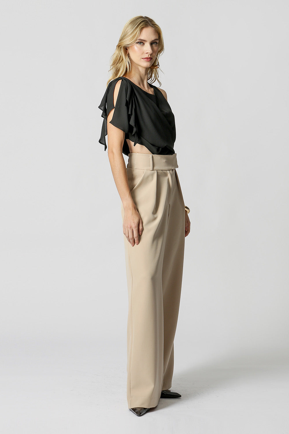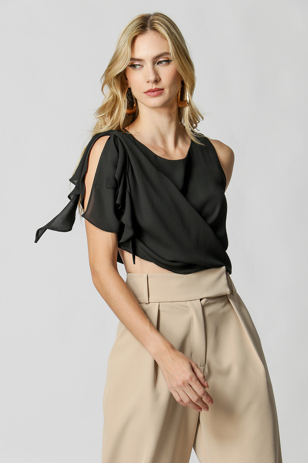 Blusa con volantes asimétricos, botón y abertura en la manga. Fabricado en tejido crepé fluido. Una pieza moderna y elegante. Gran propuesta para mejorar tu estado de ánimo laboral.