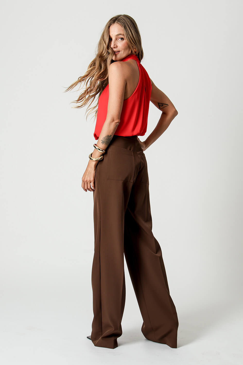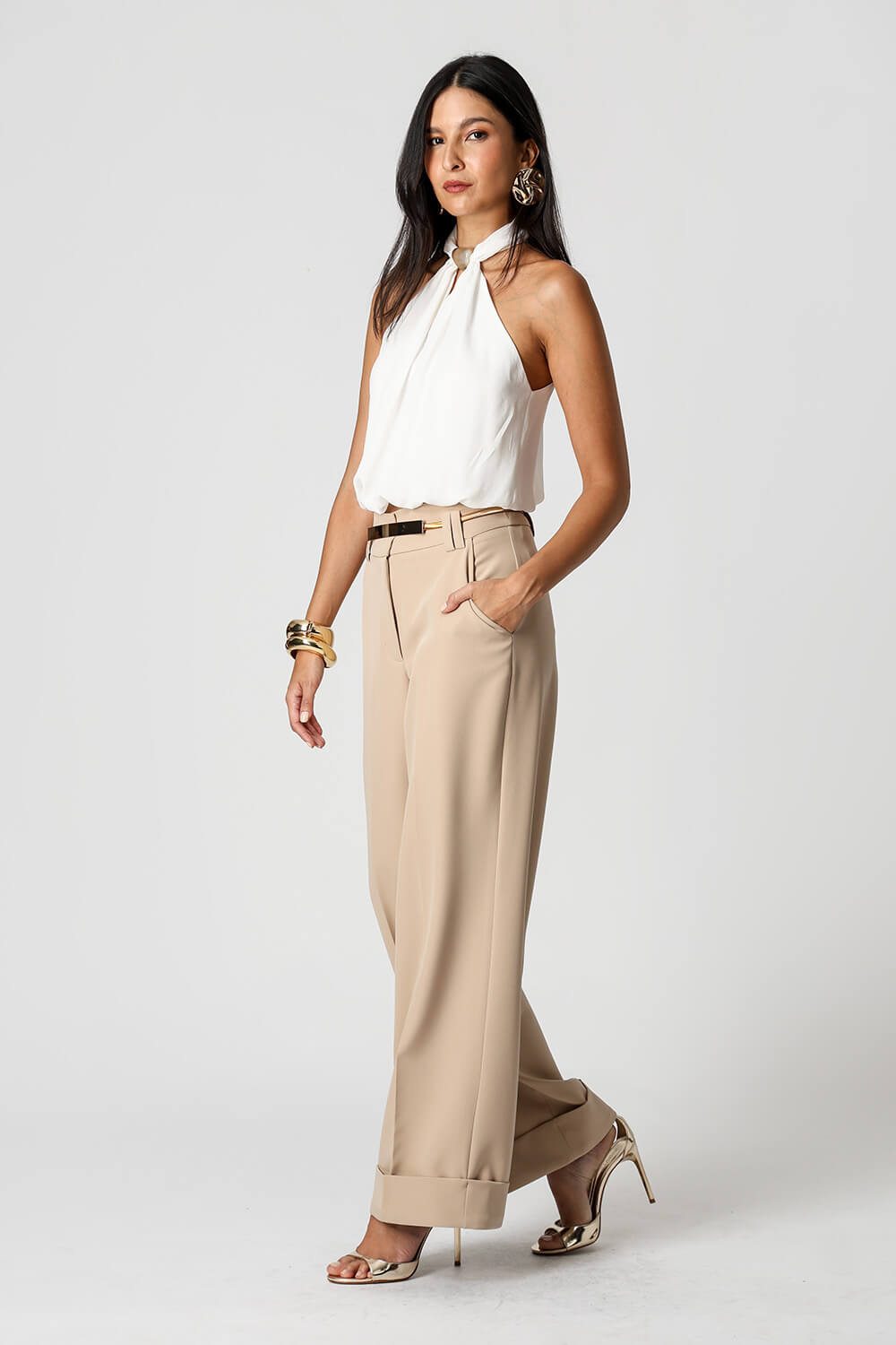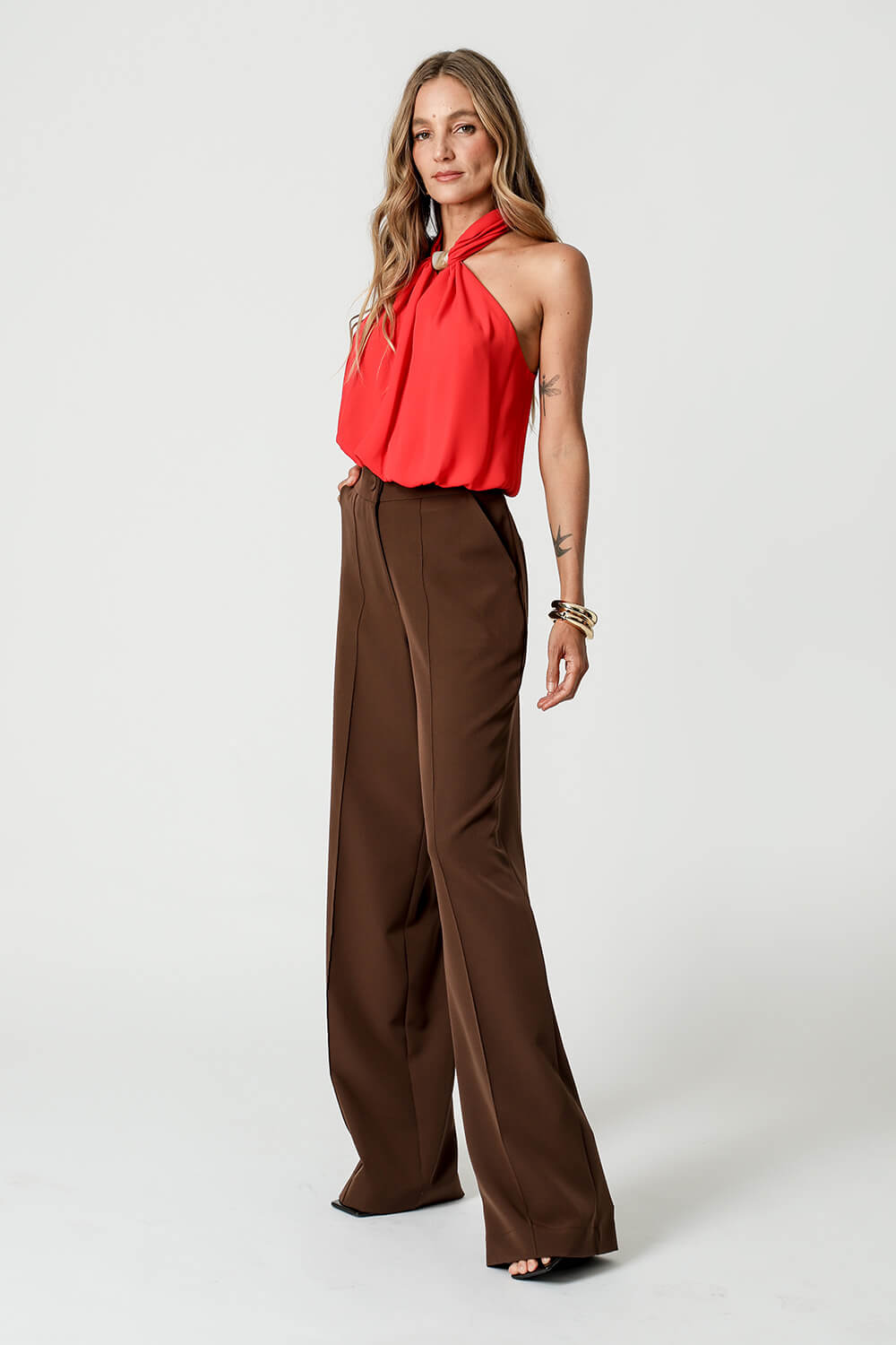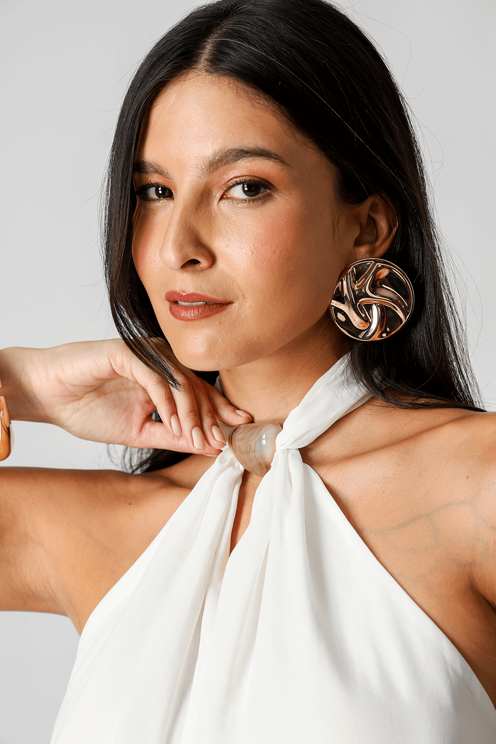 Blusa em crepe fluido com cava americana, decote torcido e detalhe de pedra central que adiciona brilho. A gola franzida traz leveza e sofisticação, criando um visual elegante e moderno para diversas ocasiões.
