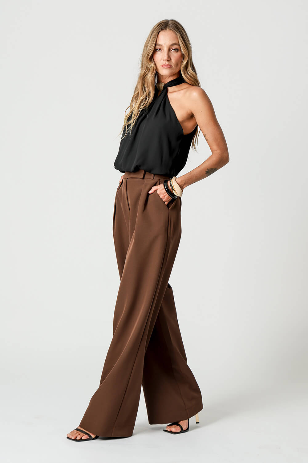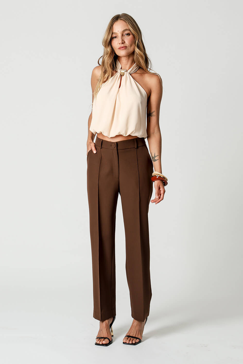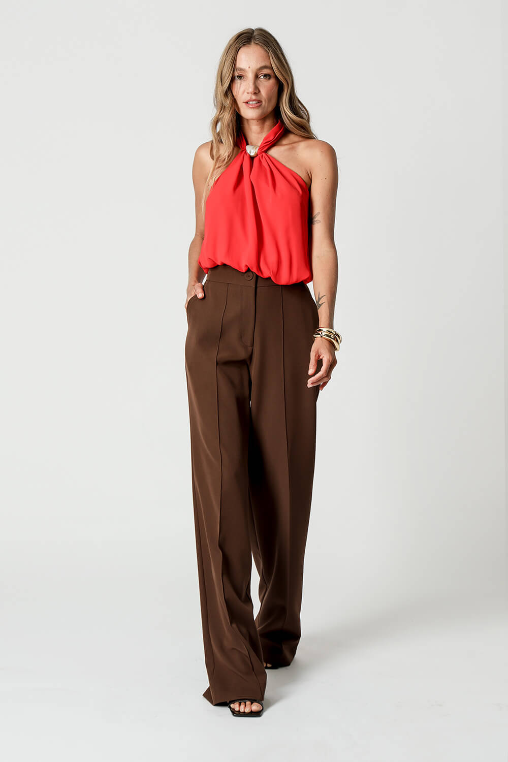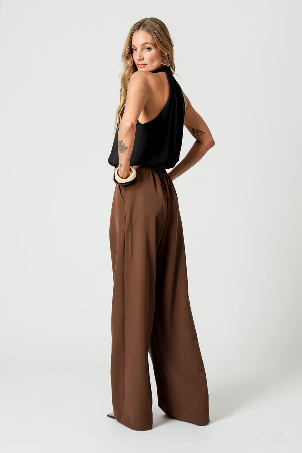 Blusa em crepe fluido com cava americana, decote torcido e detalhe de pedra central que adiciona brilho. A gola franzida traz leveza e sofisticação, criando um visual elegante e moderno para diversas ocasiões.