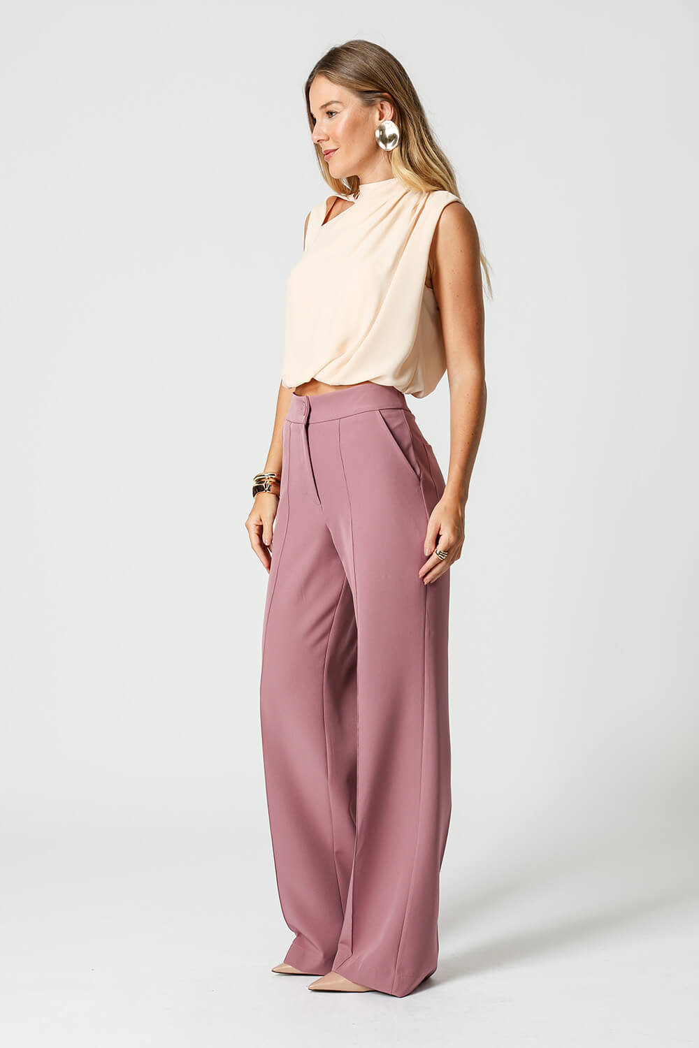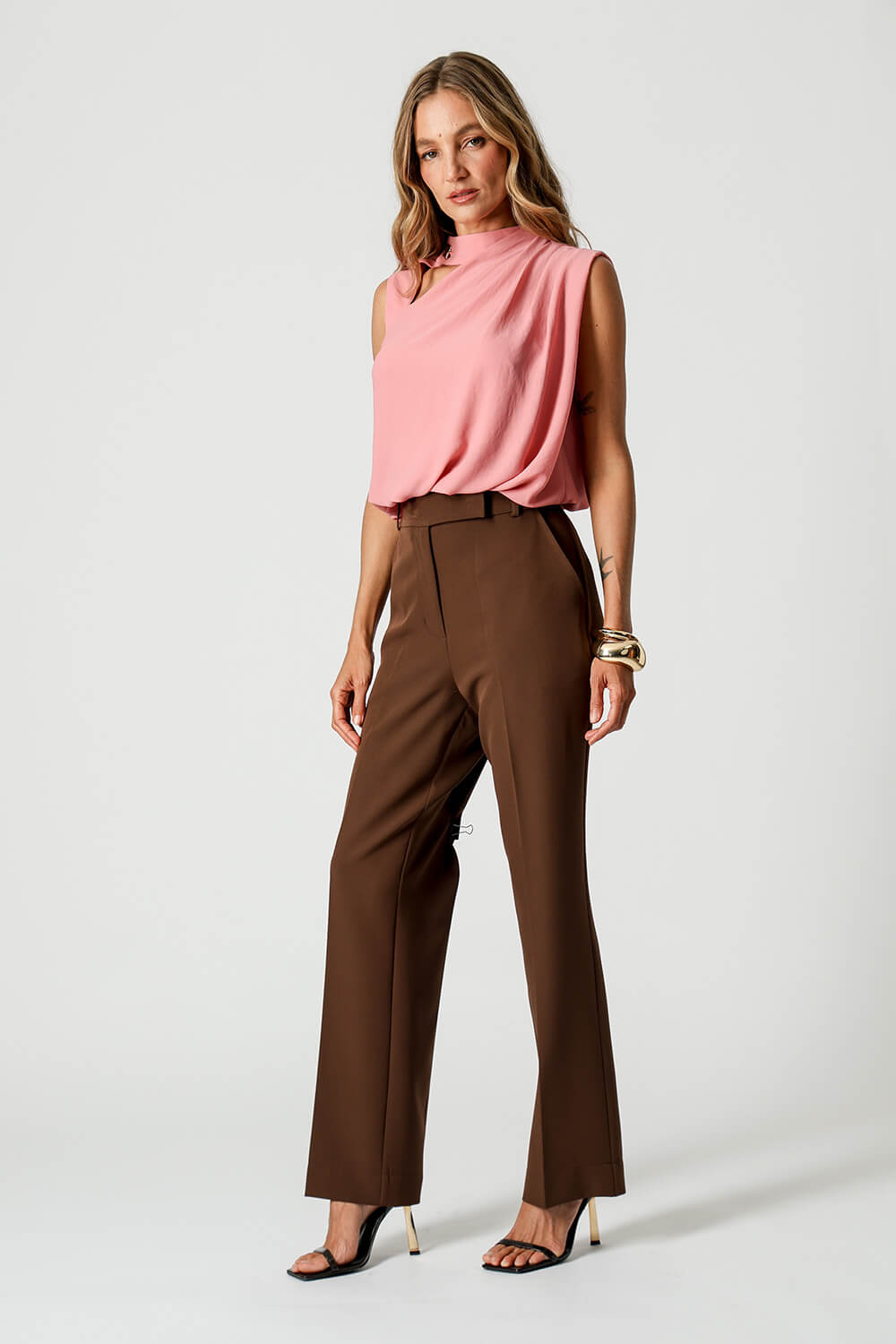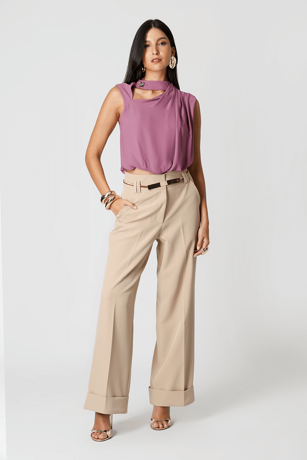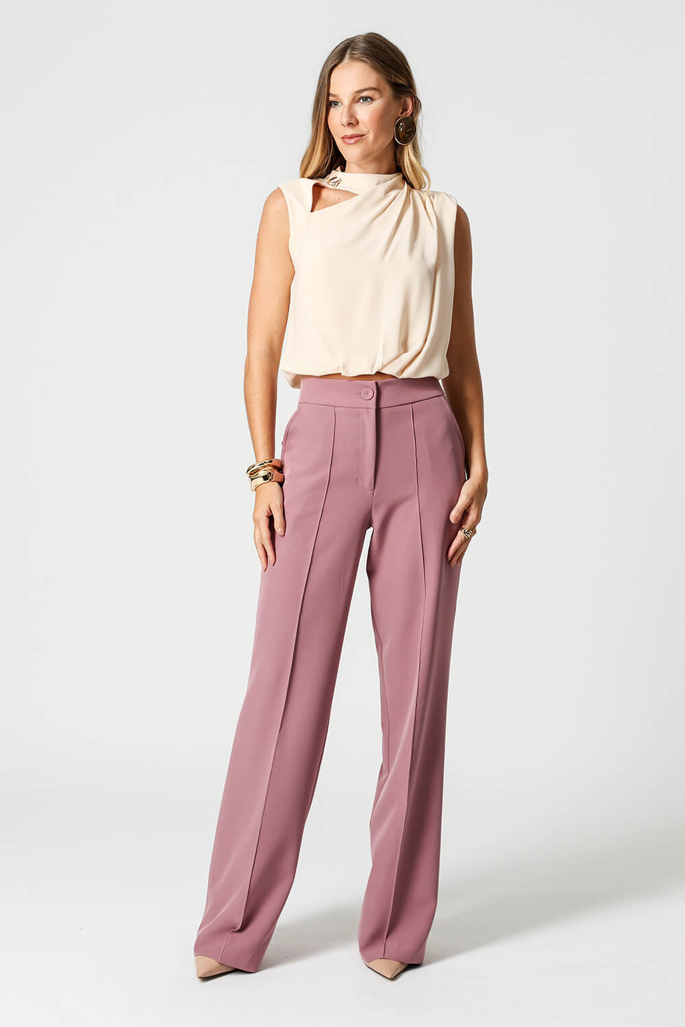 Blusa balonê com gola alta e botão funcional, pregas nos ombros e recortes vazados no decote frontal e costas. Confeccionada em crepe fluido, une leveza e sofisticação para looks elegantes.
