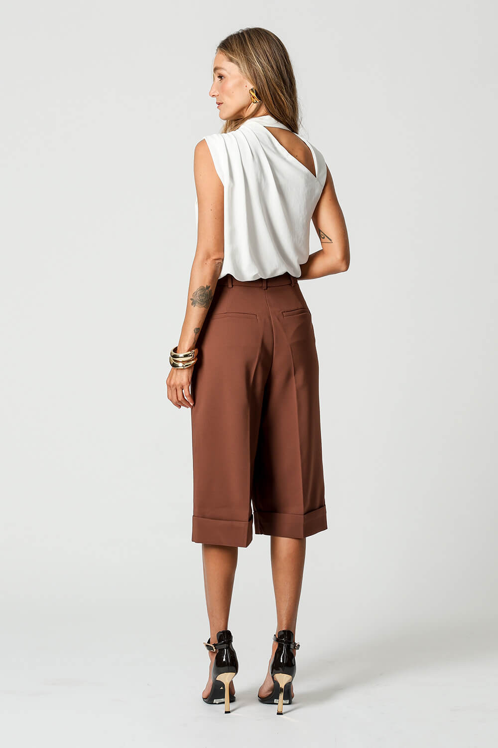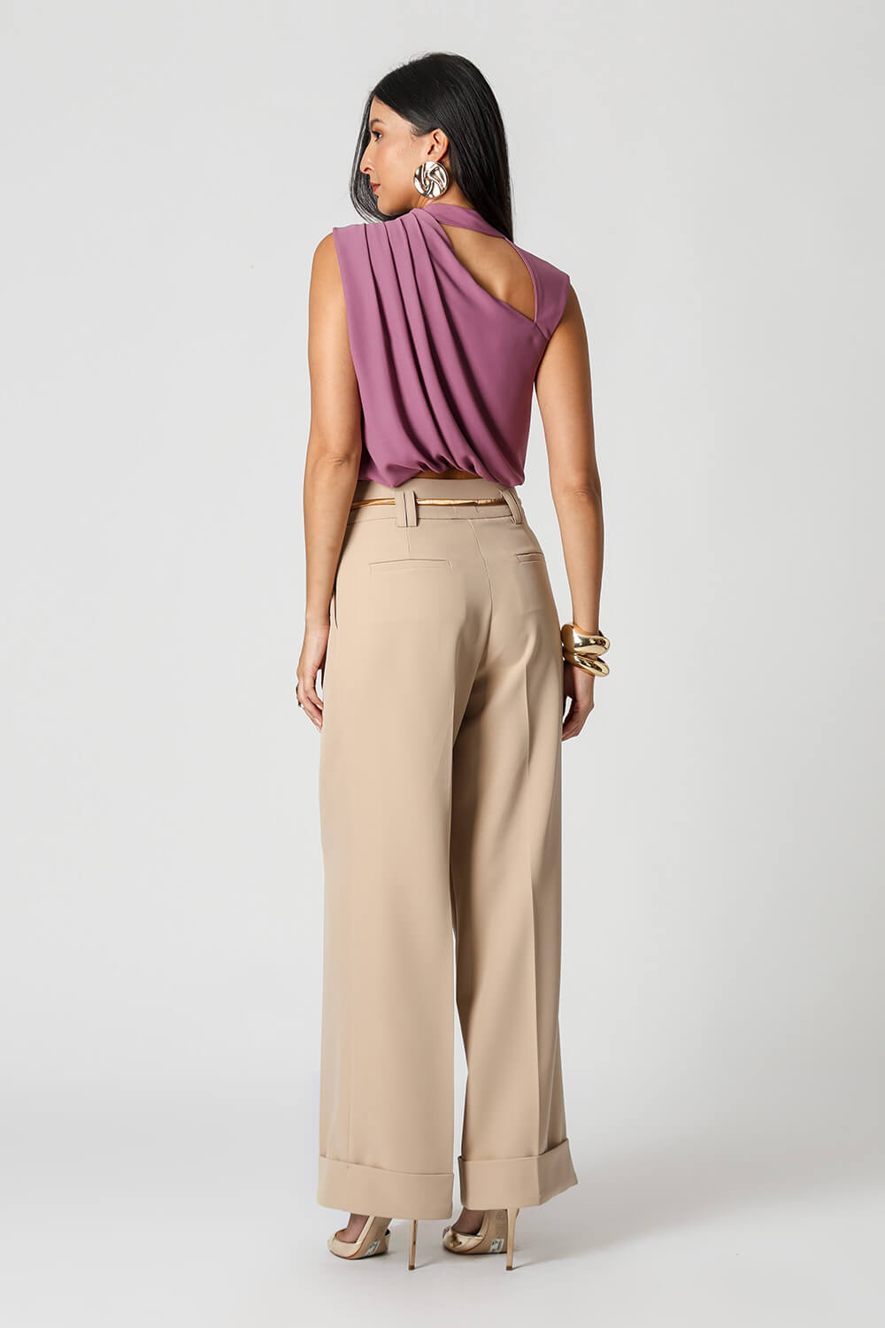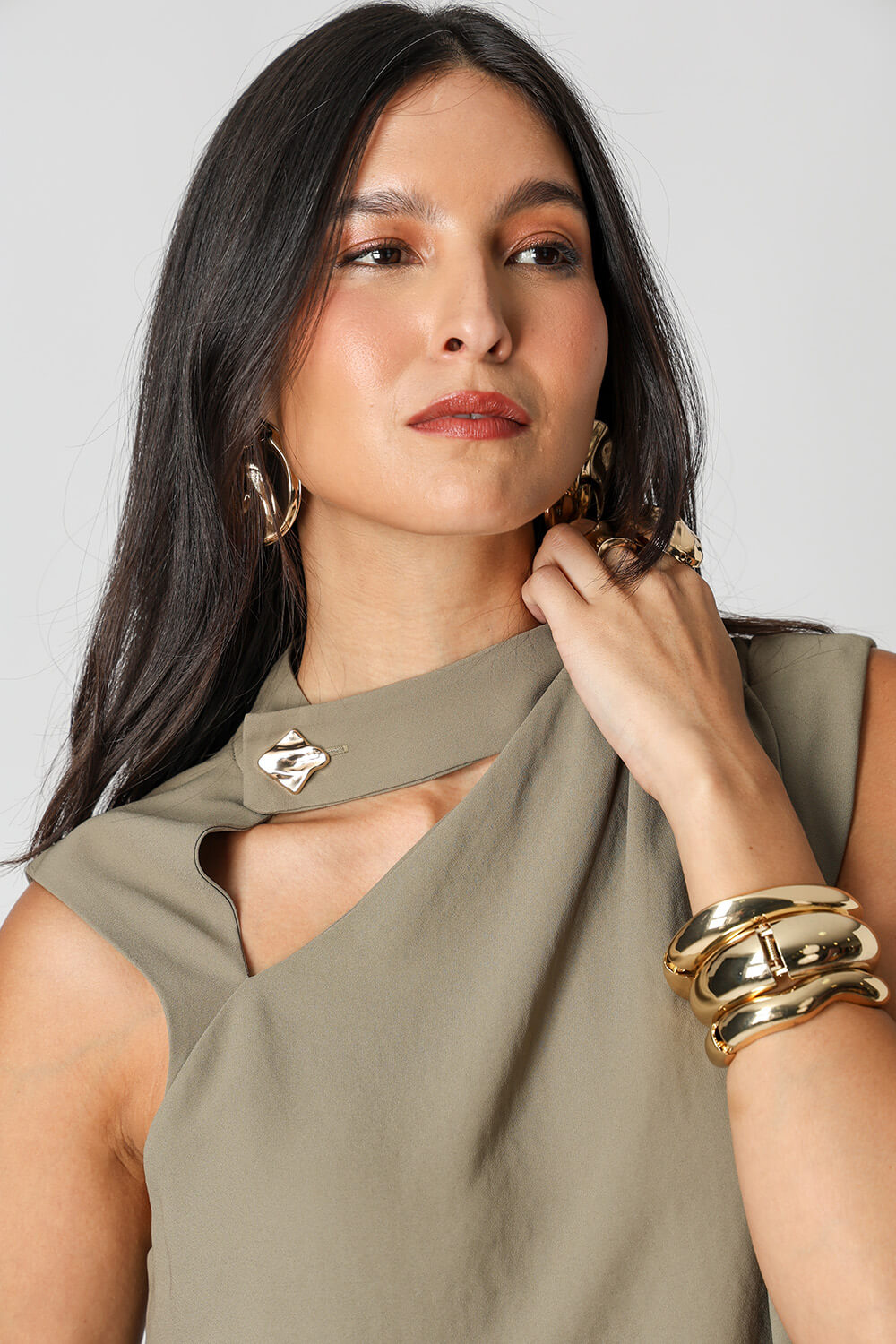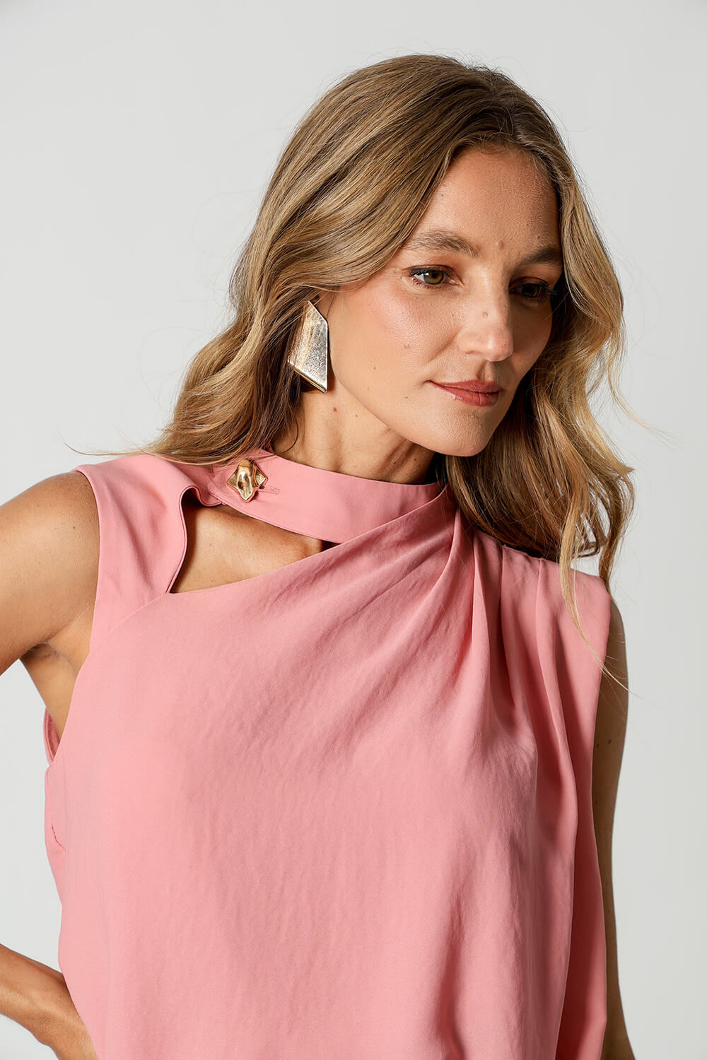 Detalhe de pregas no ombro e recortes no decote