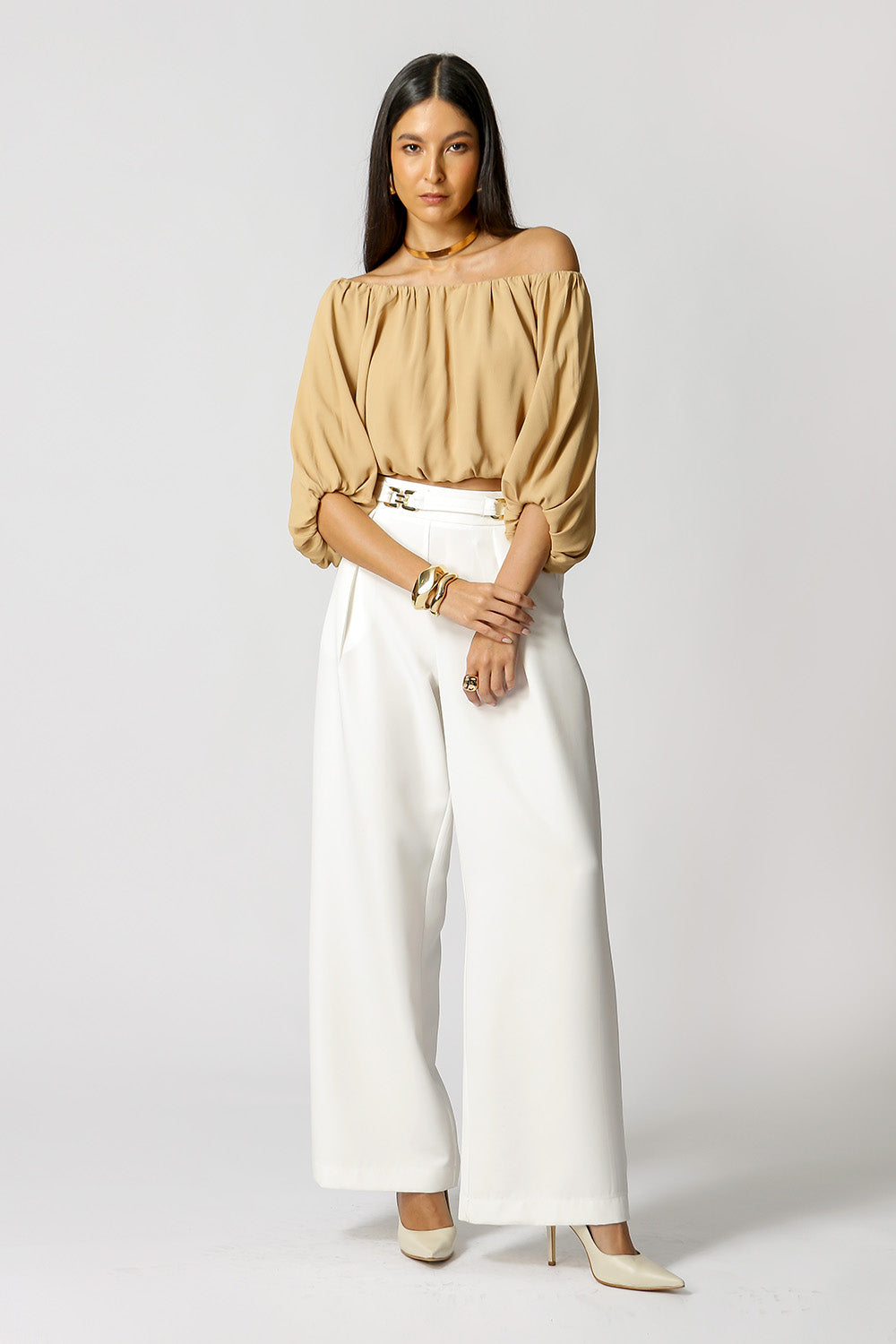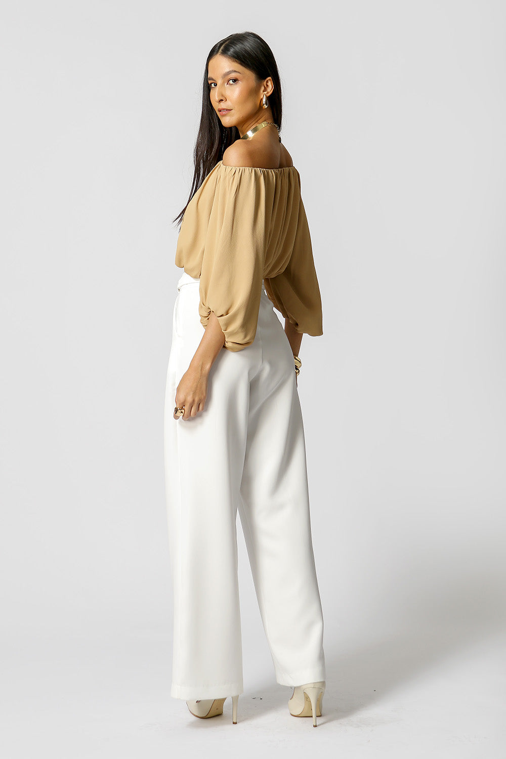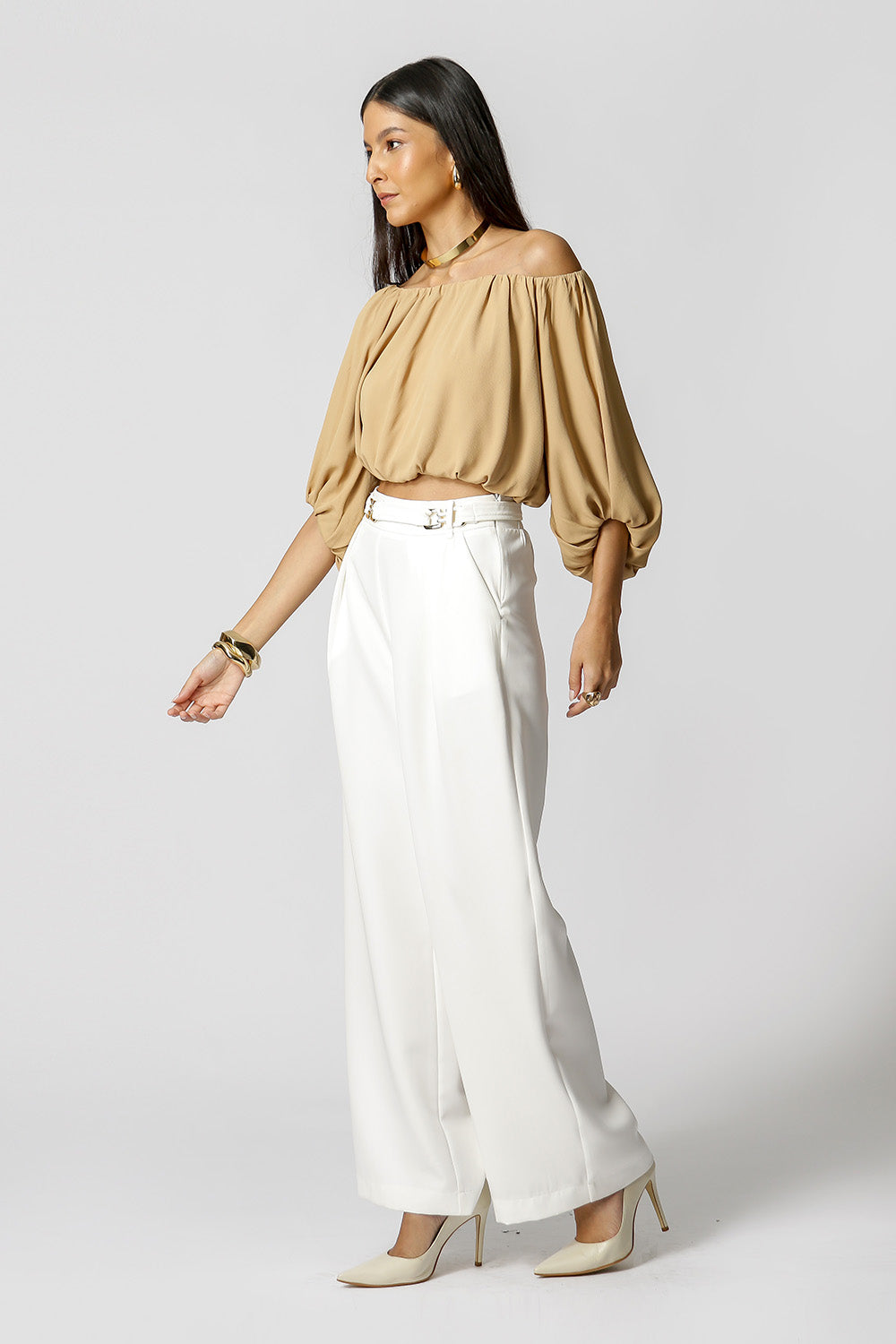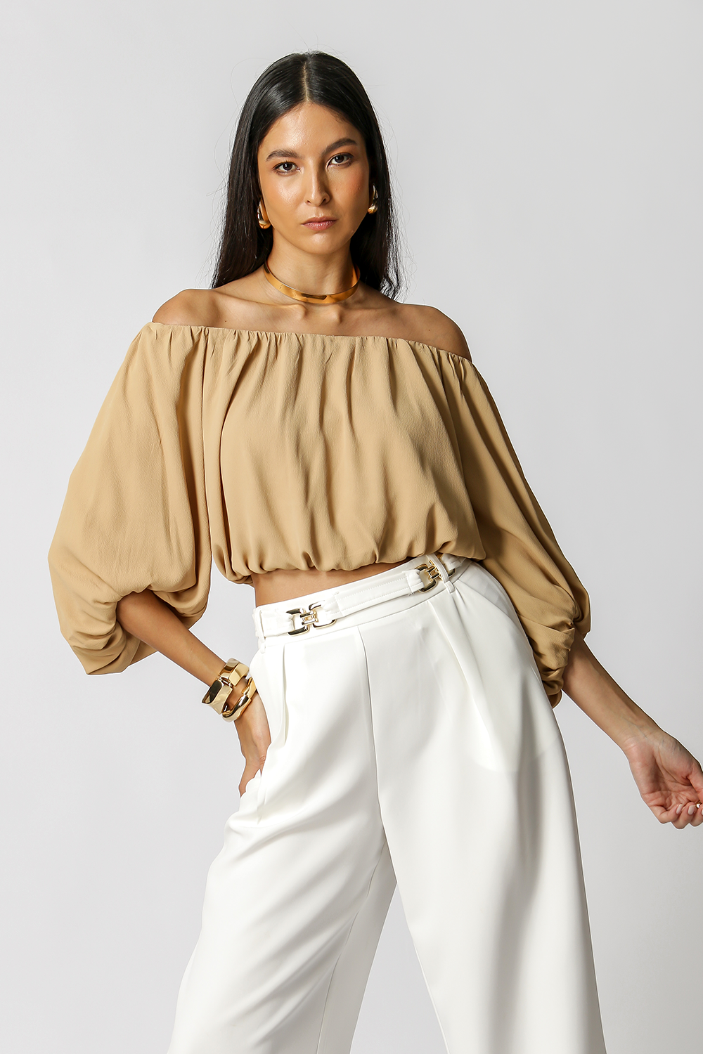 Blusa globo con hombros descubiertos, las mangas voluminosas aportan un toque femenino y lleno de personalidad, creando un look relajado y encantador.