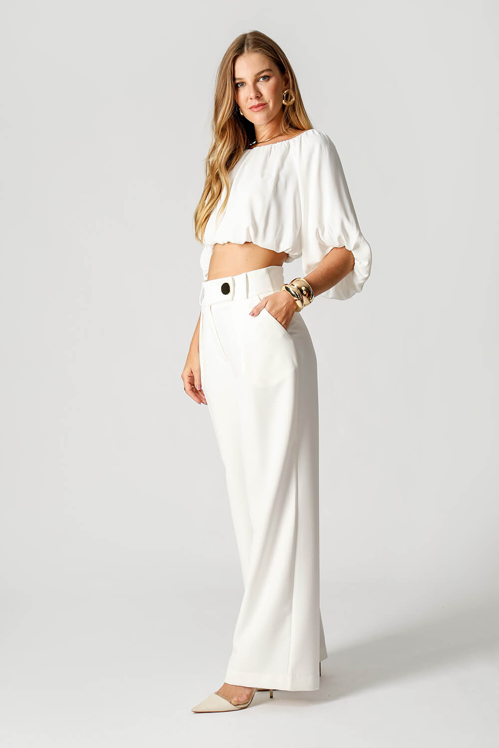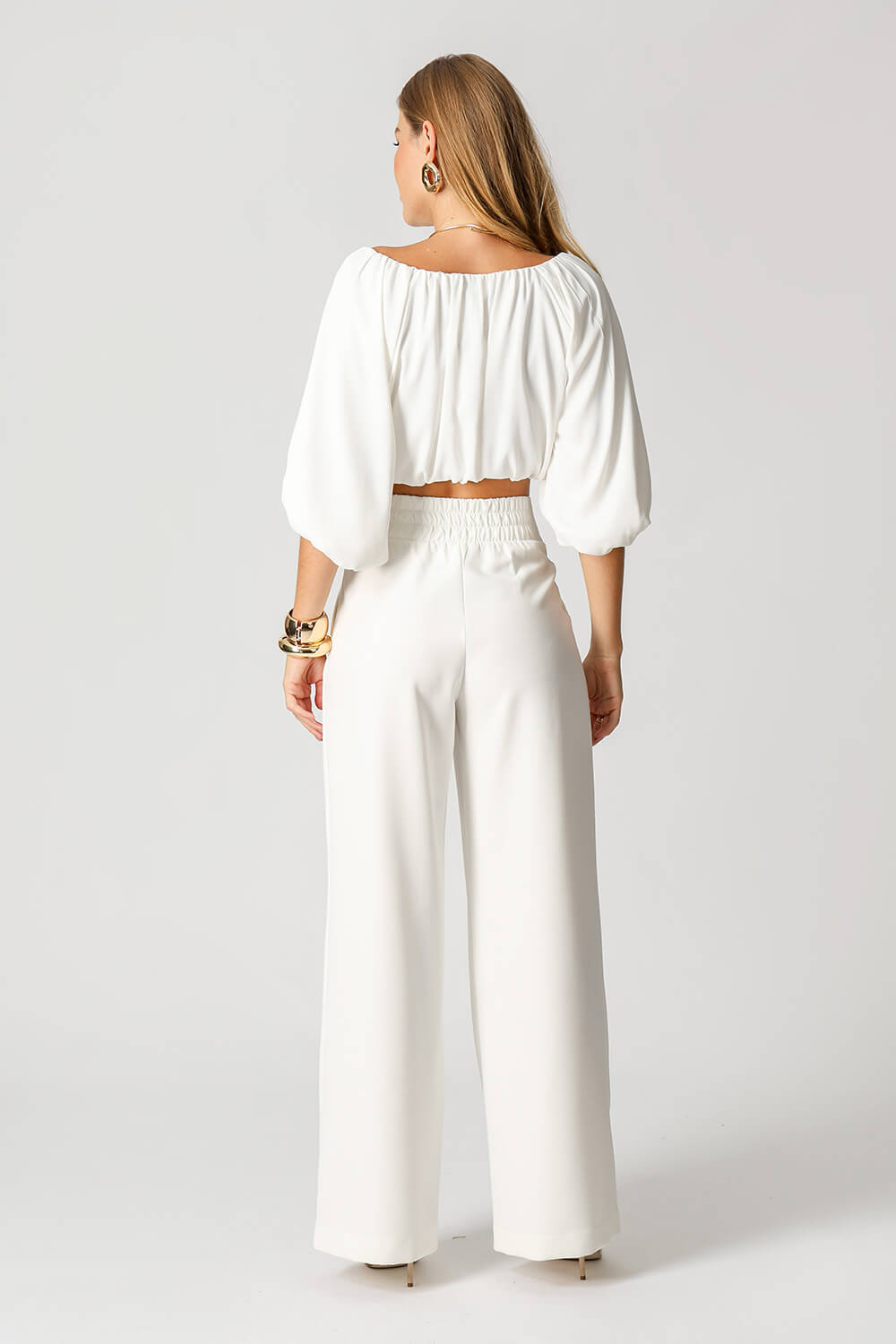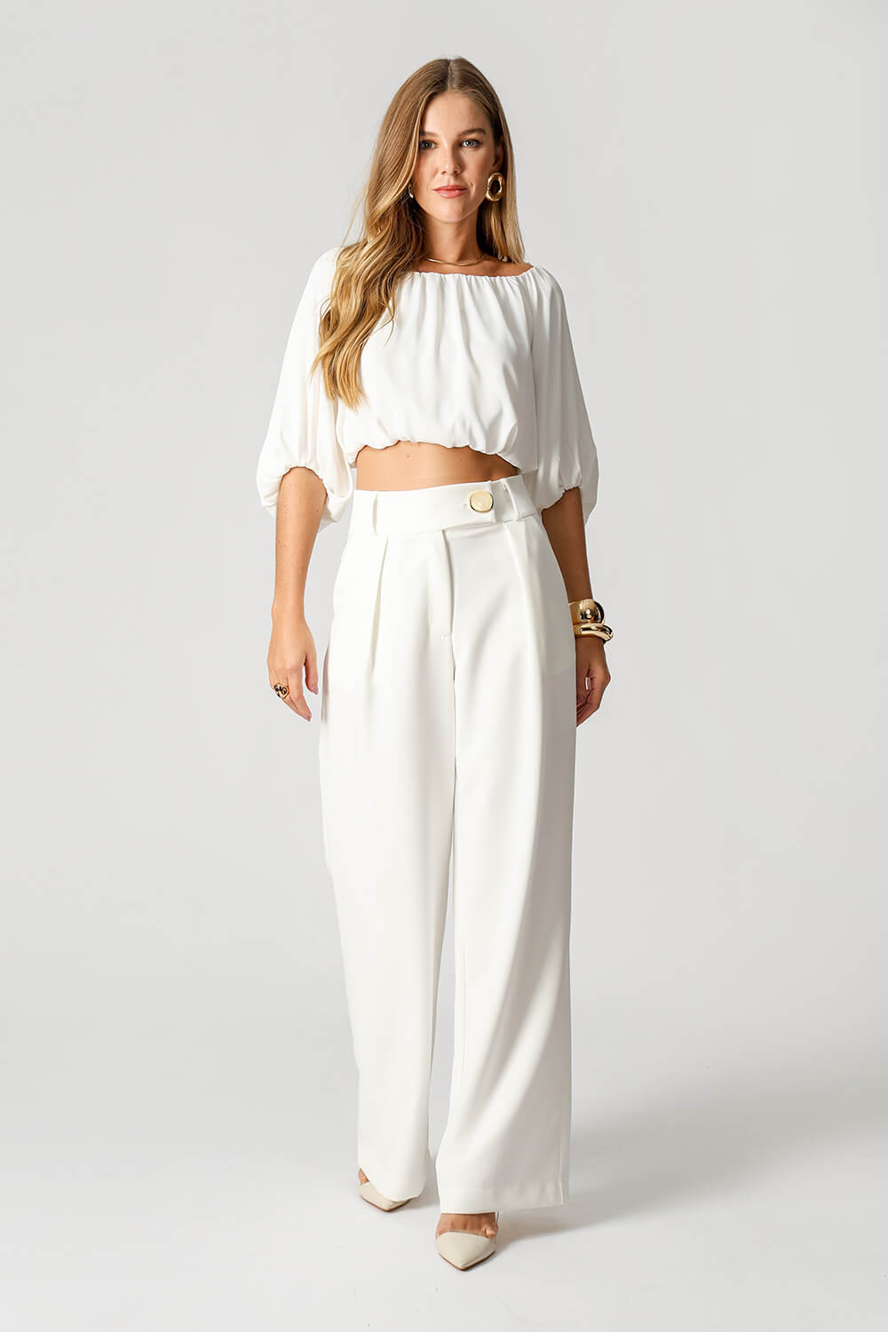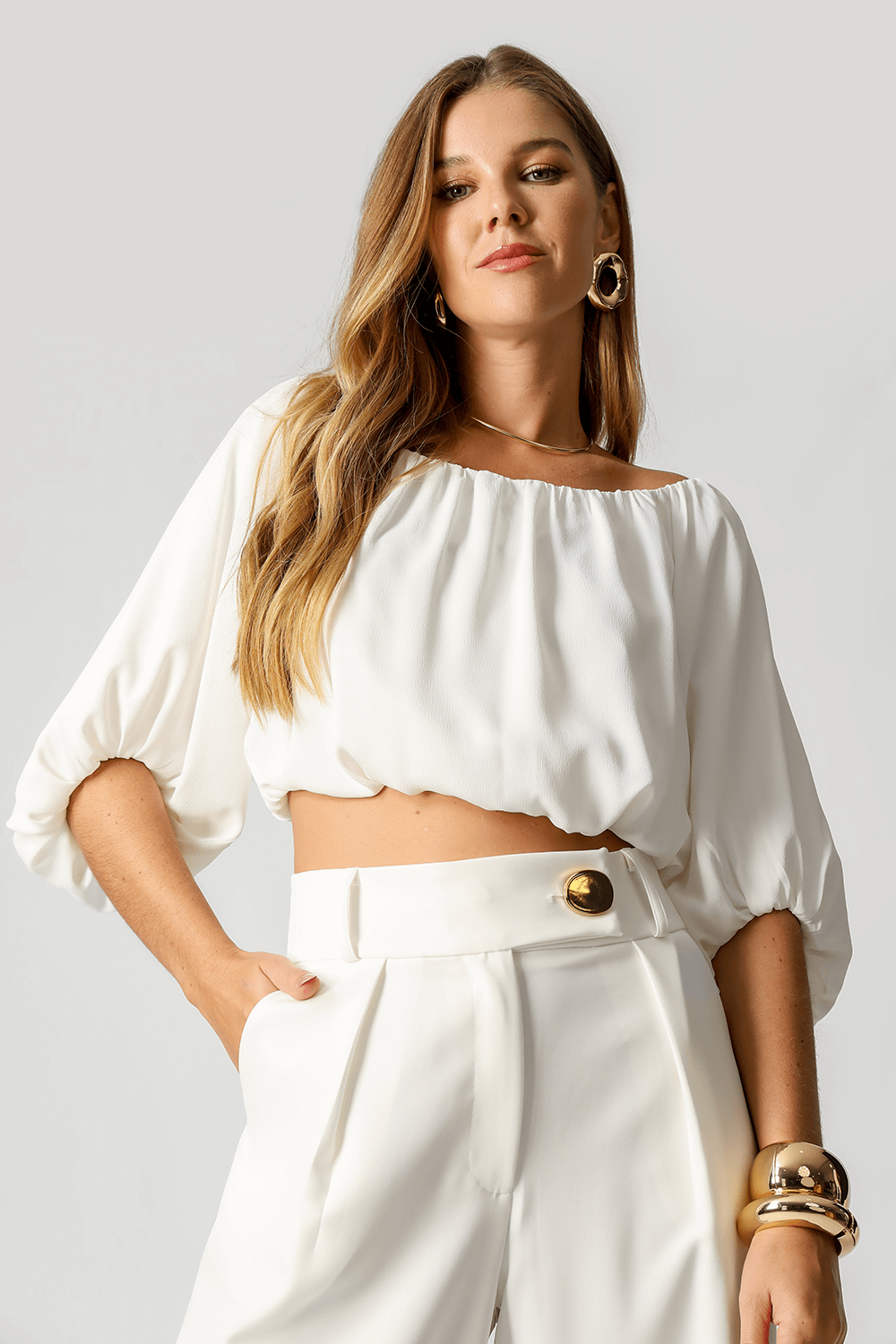 Blusa globo con hombros descubiertos, las mangas voluminosas aportan un toque femenino y lleno de personalidad, creando un look relajado y encantador.