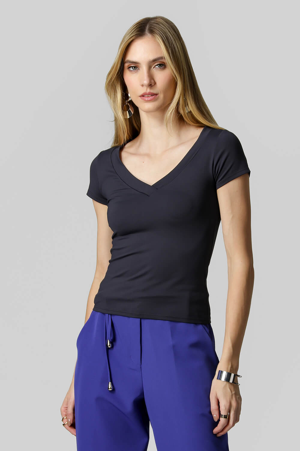 Blusa básica, confeccionada en tejido de poliamida con manga corta y escote en pico.