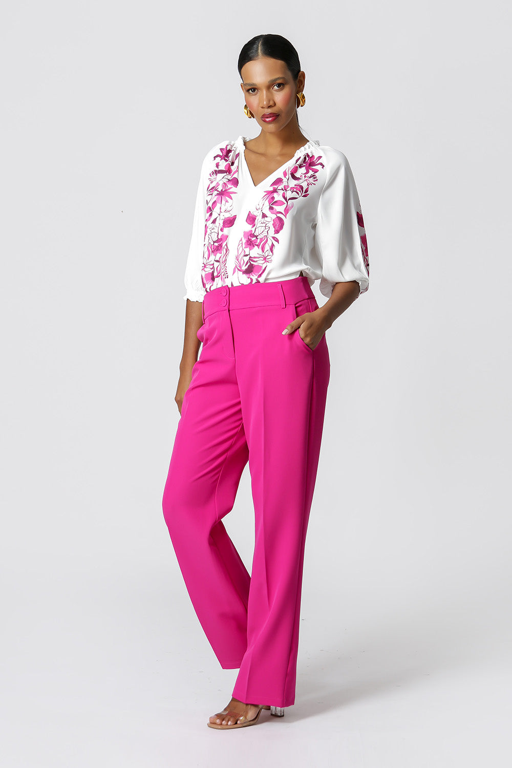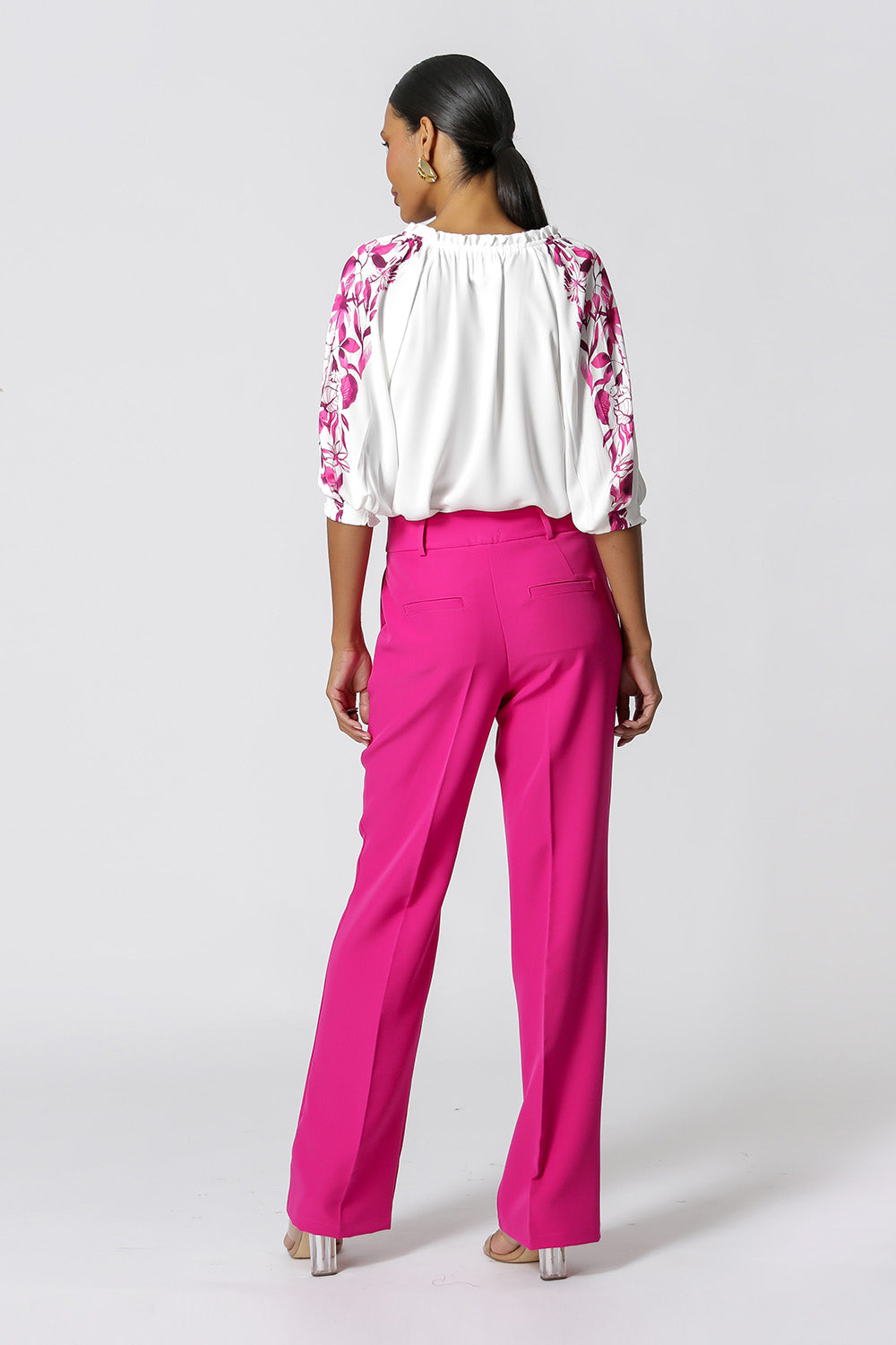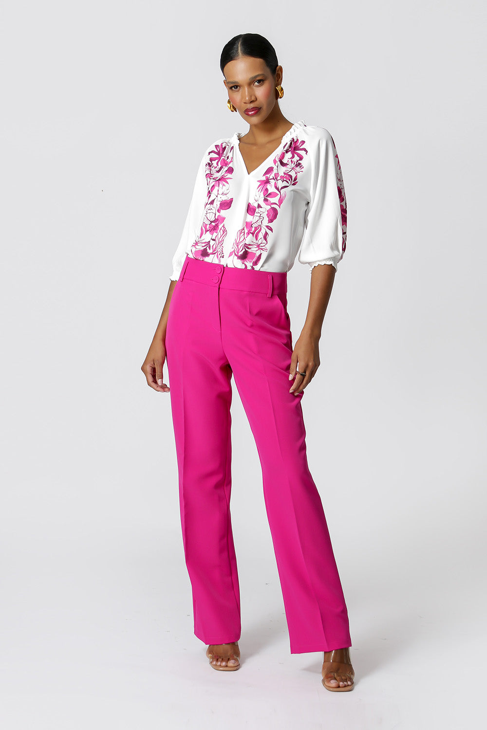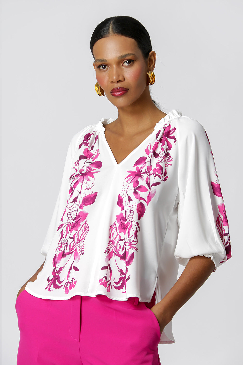 Blusa estampada con mangas 3/4, escote en pico y cuello fruncido. Pieza confeccionada en tejido crepe fluido. Una pieza de forma suelta y perfecta para usar en diversas ocasiones.
