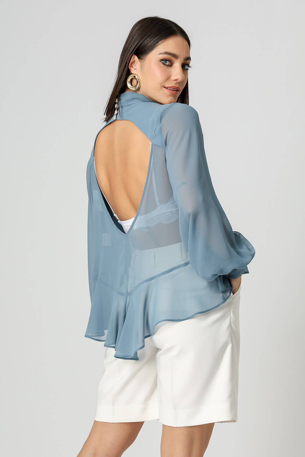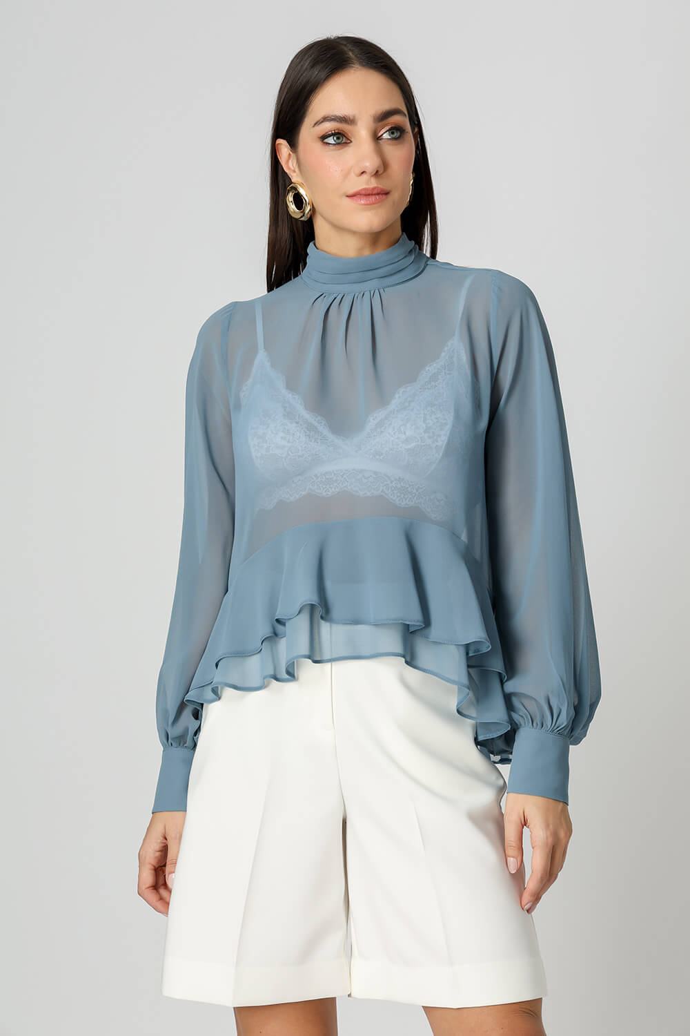 Blusa de manga longa bufante em chiffon glass, com punhos marcantes, abertura nas costas e barra com babados. Toque romântico e sofisticado para looks elegantes.