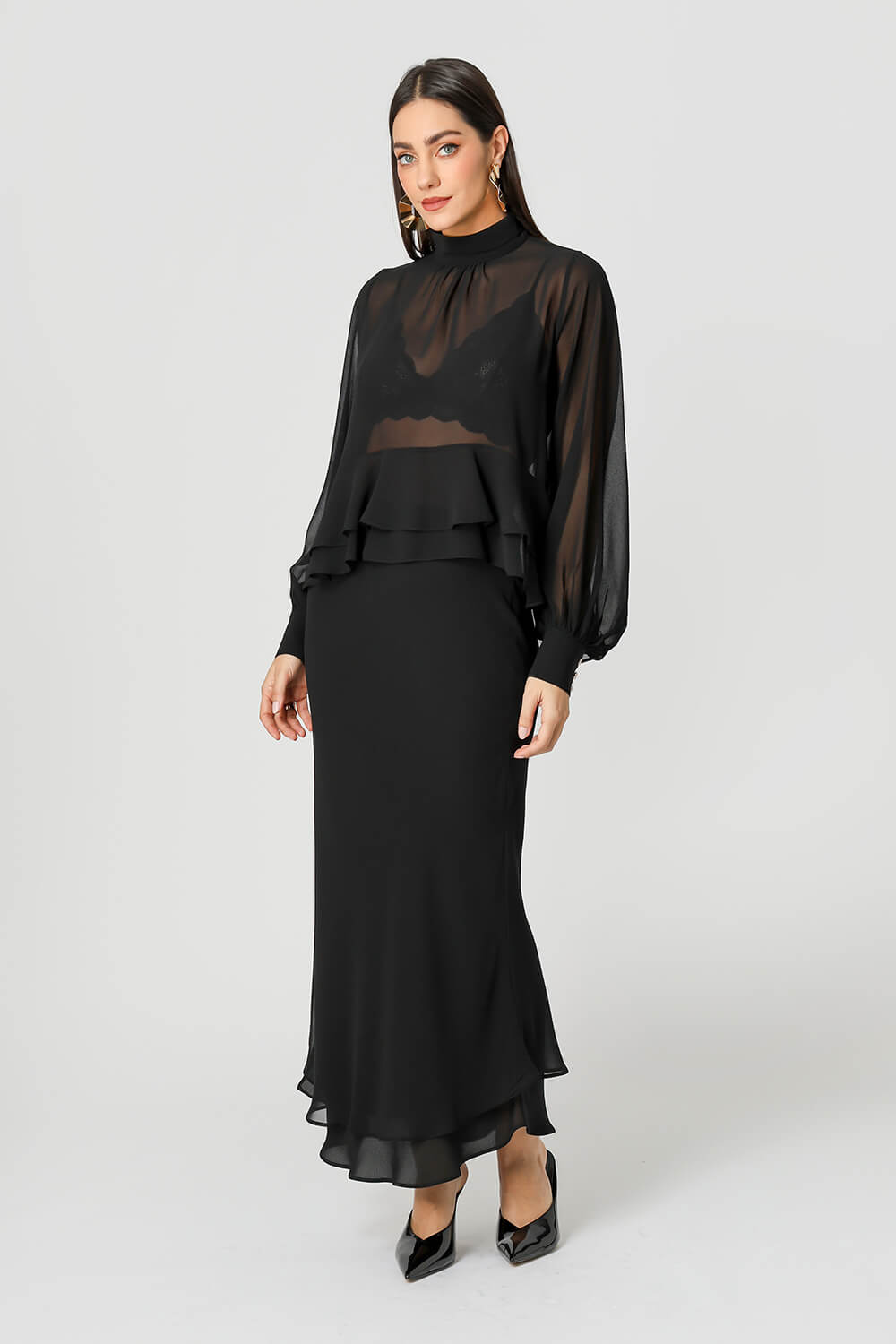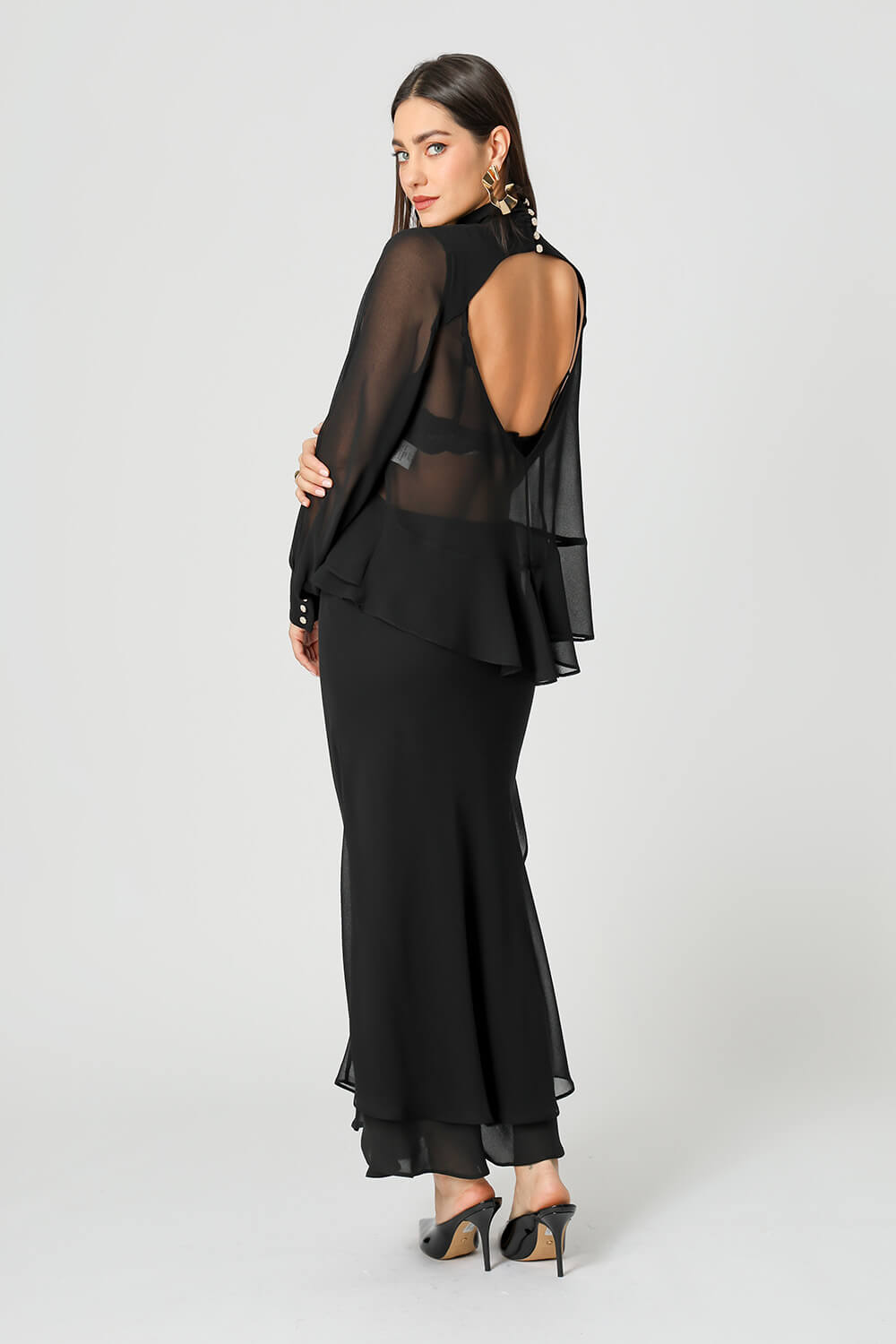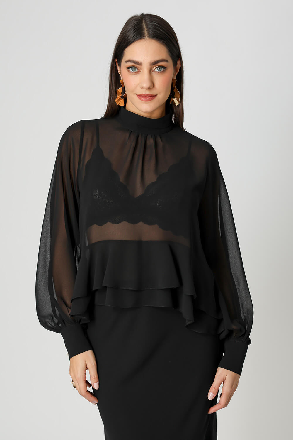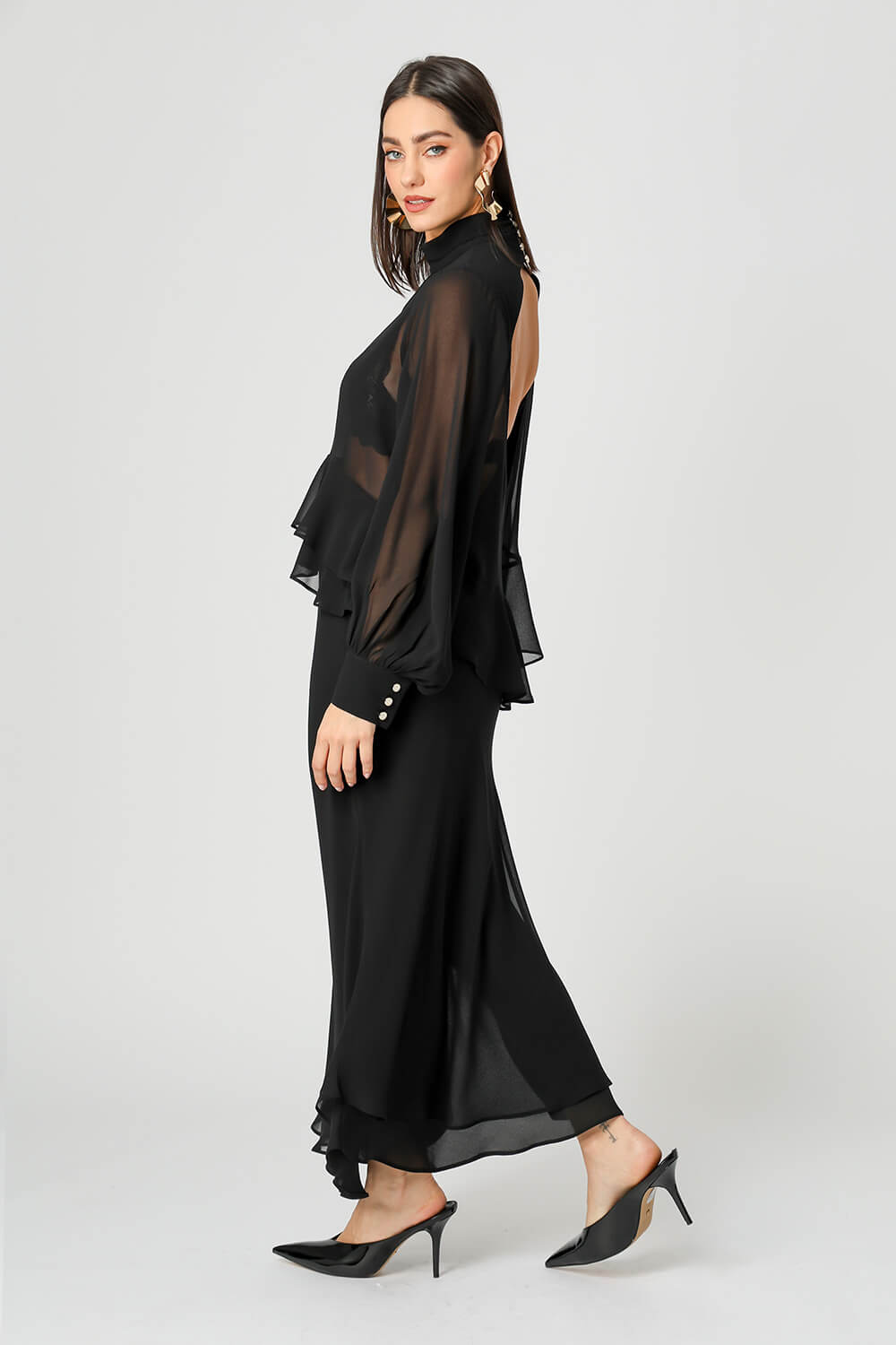 Blusa de manga longa bufante em chiffon glass, com punhos marcantes, abertura nas costas e barra com babados. Toque romântico e sofisticado para looks elegantes.