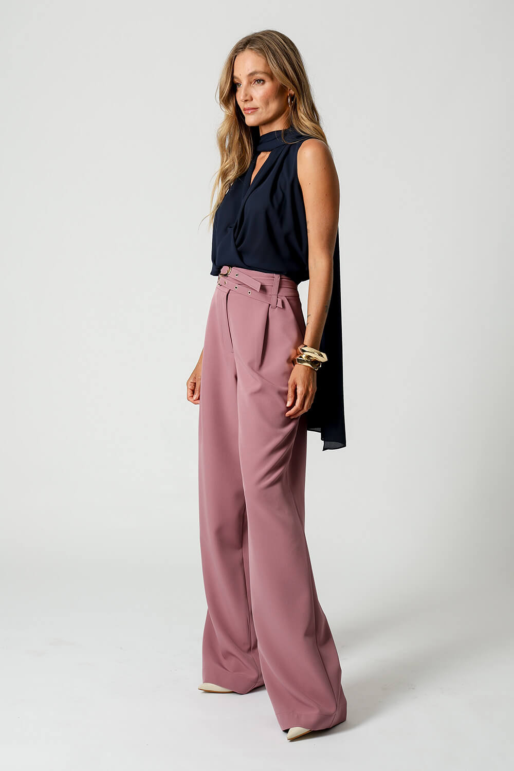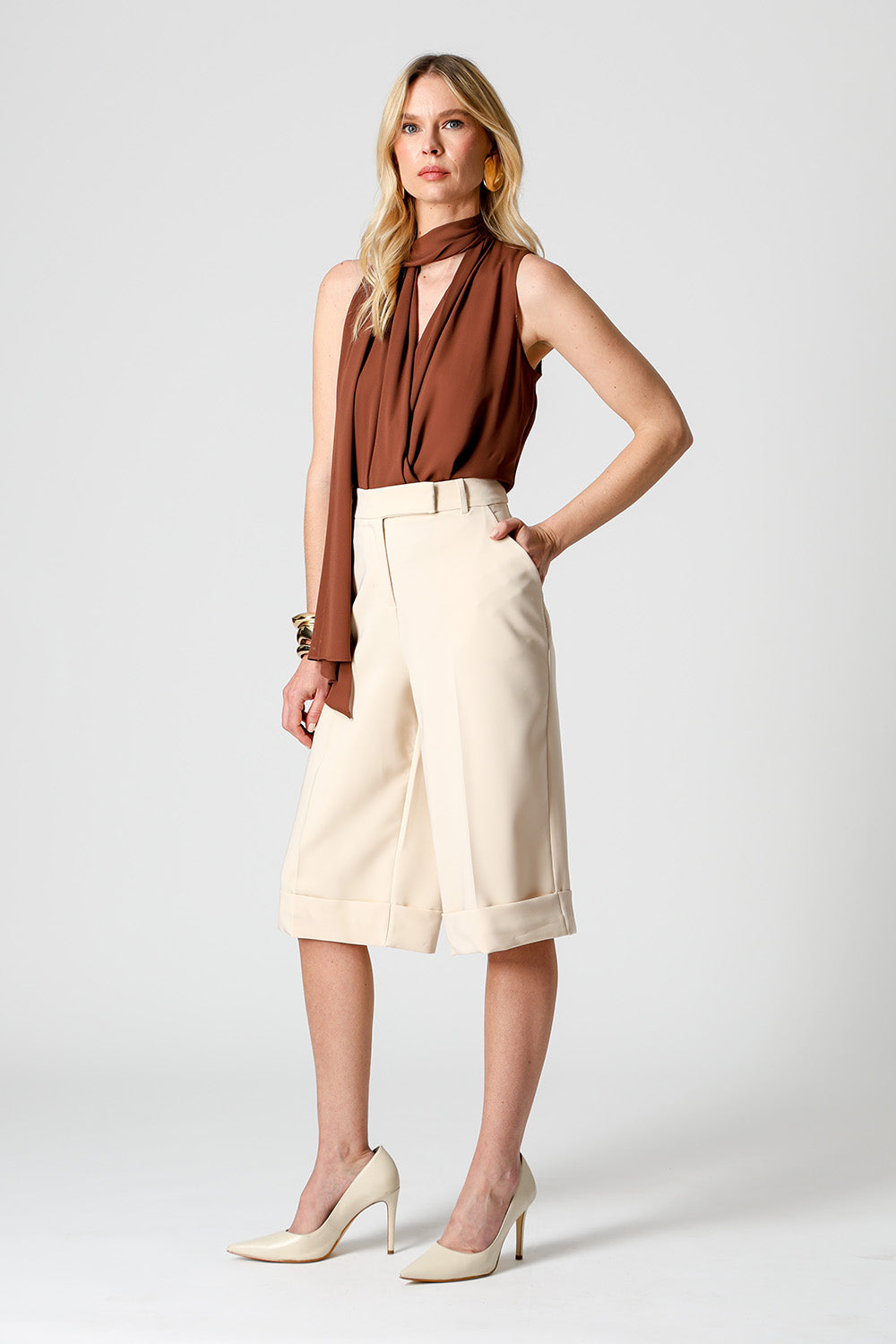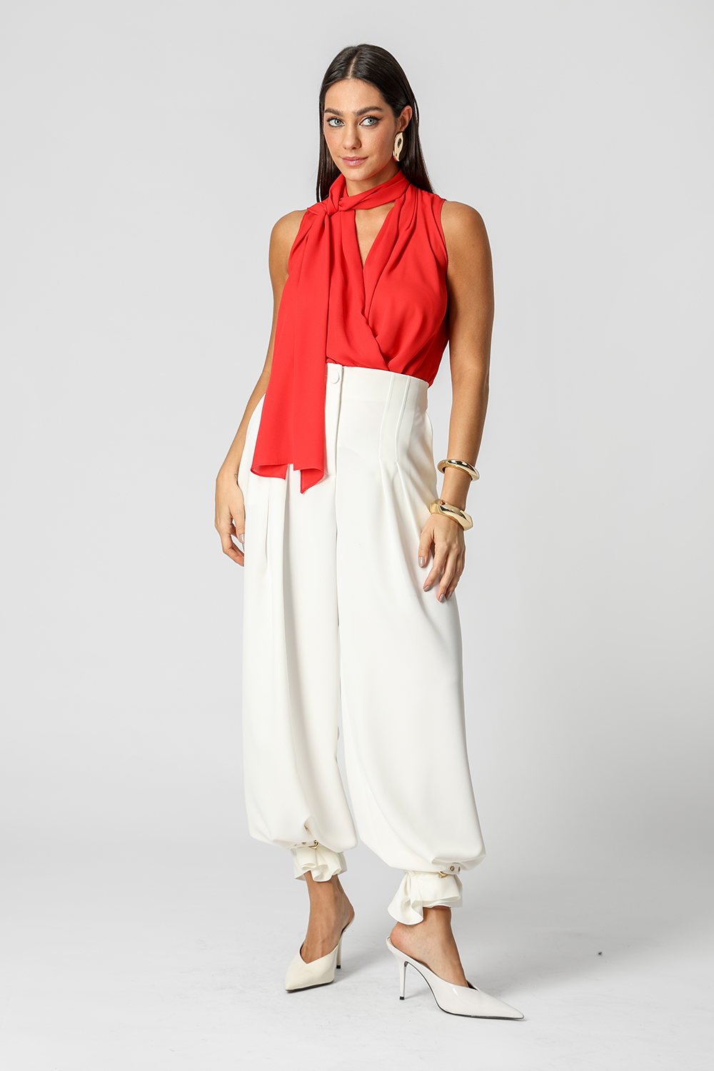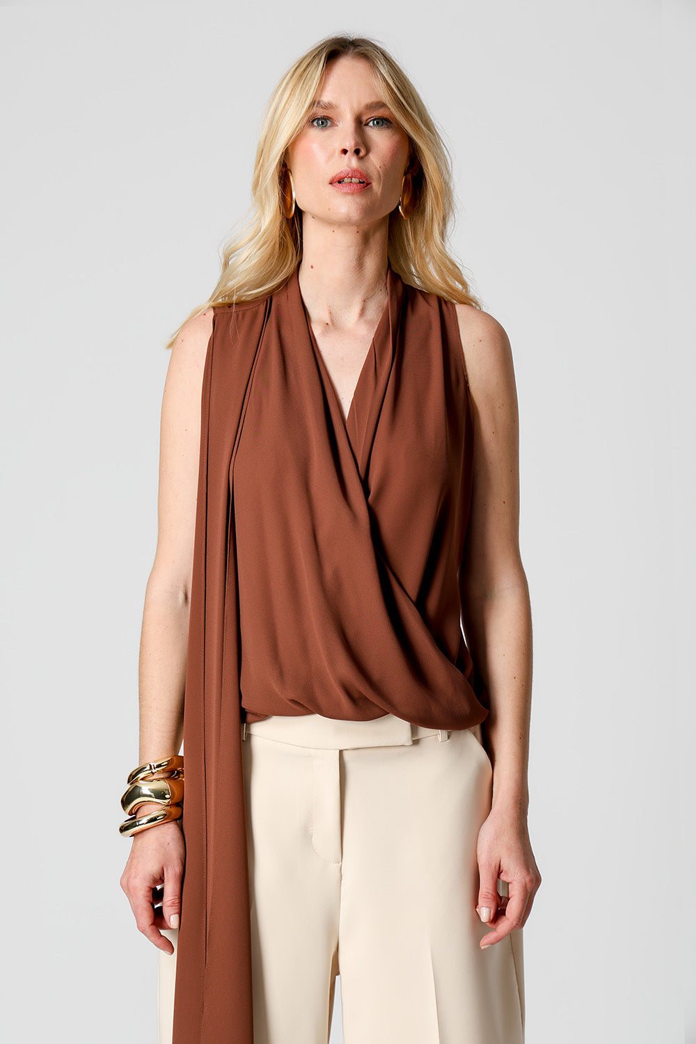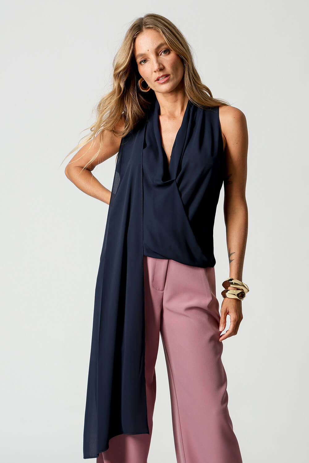 Blusa estilo cachequer em crepe fluido, acompanhada de lenço multiuso que permite diferentes amarrações. Peça leve, versátil e elegante para compor looks modernos.