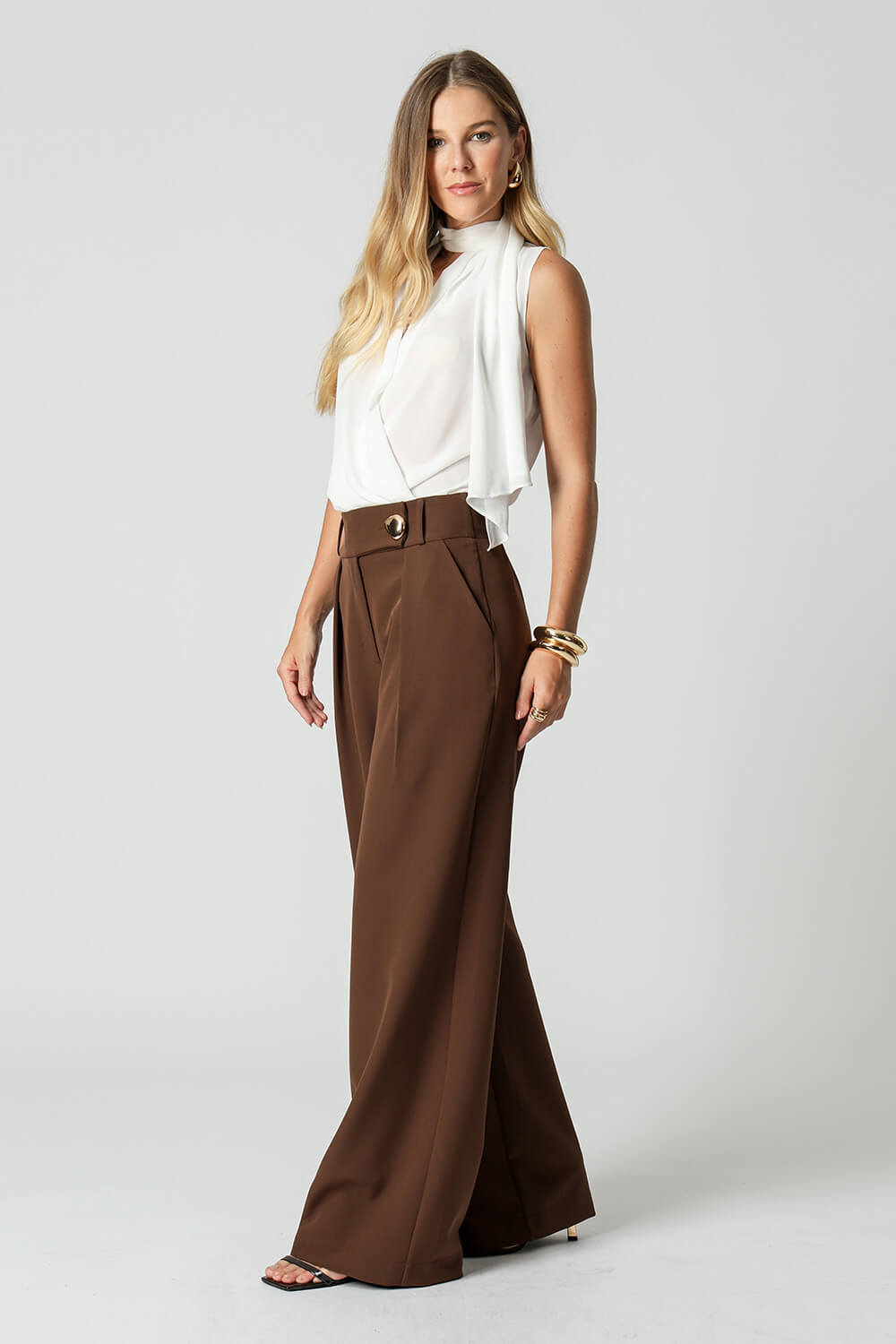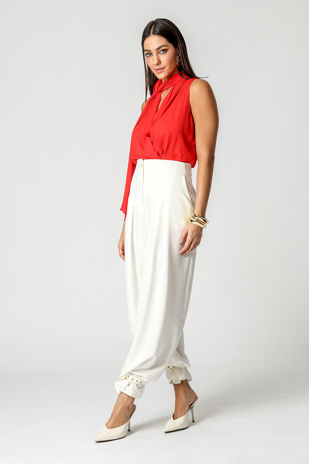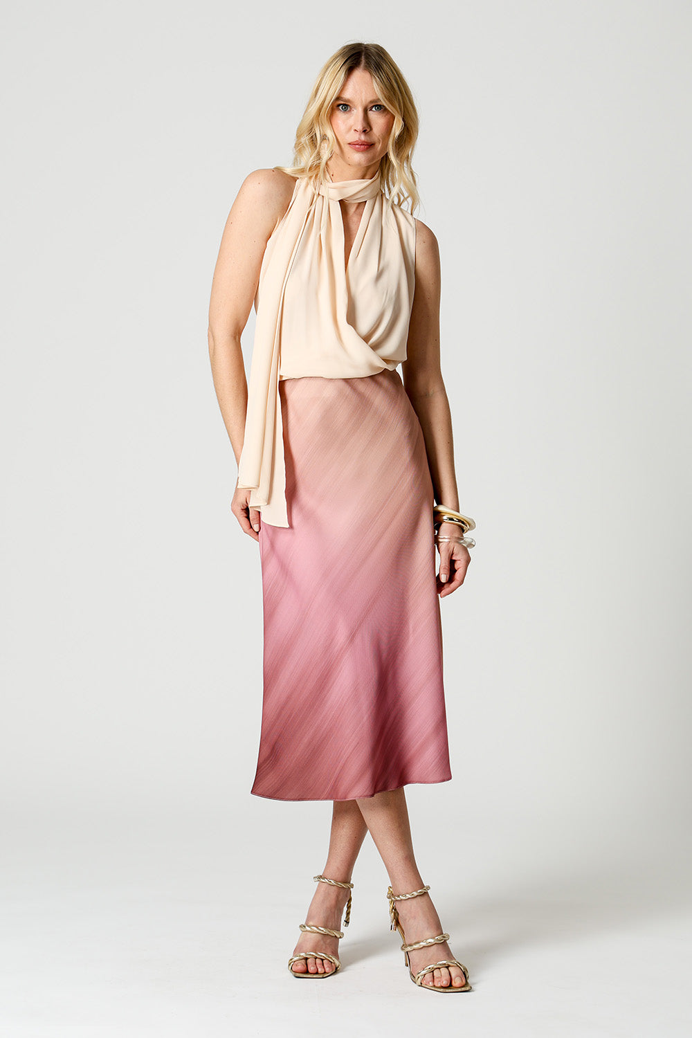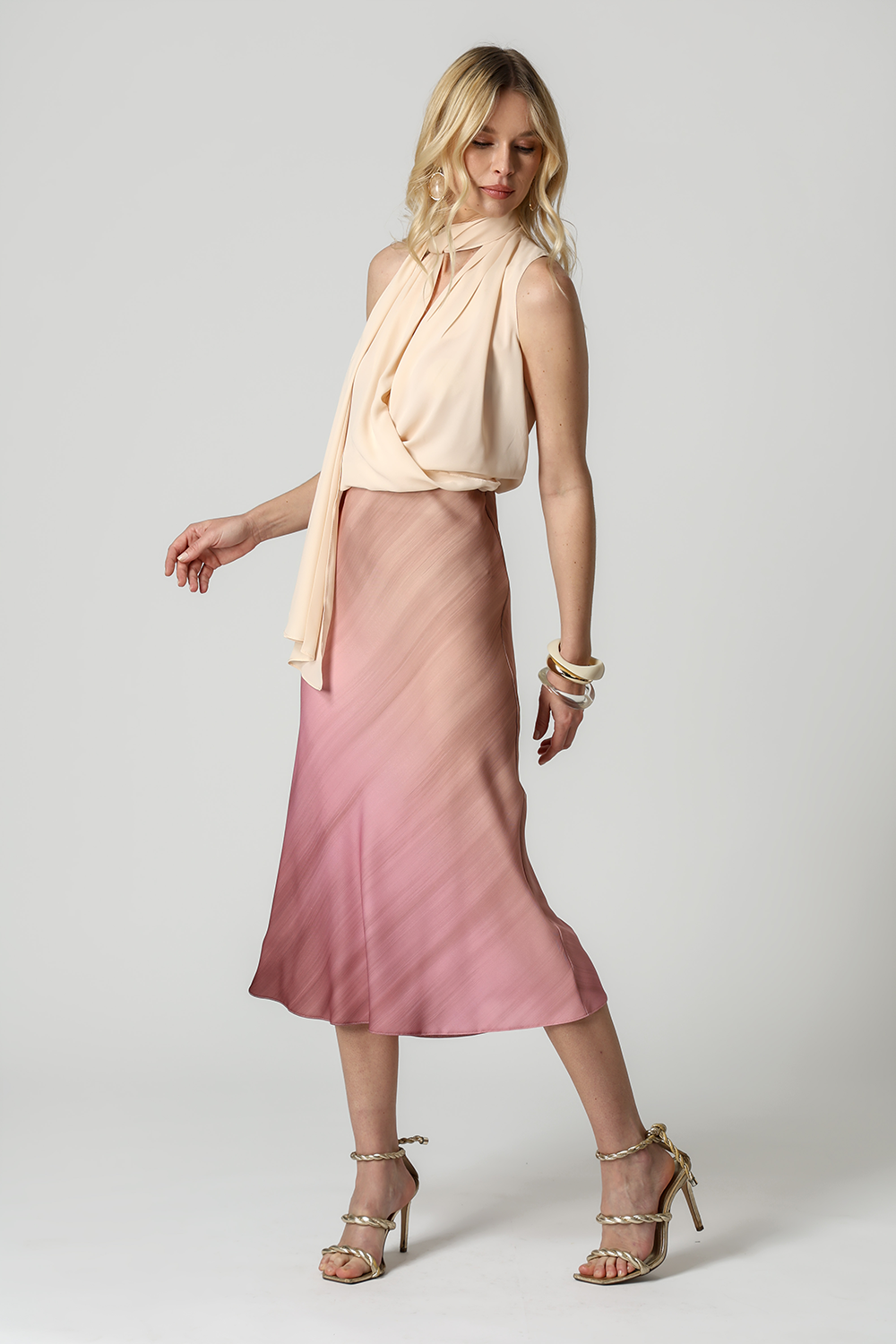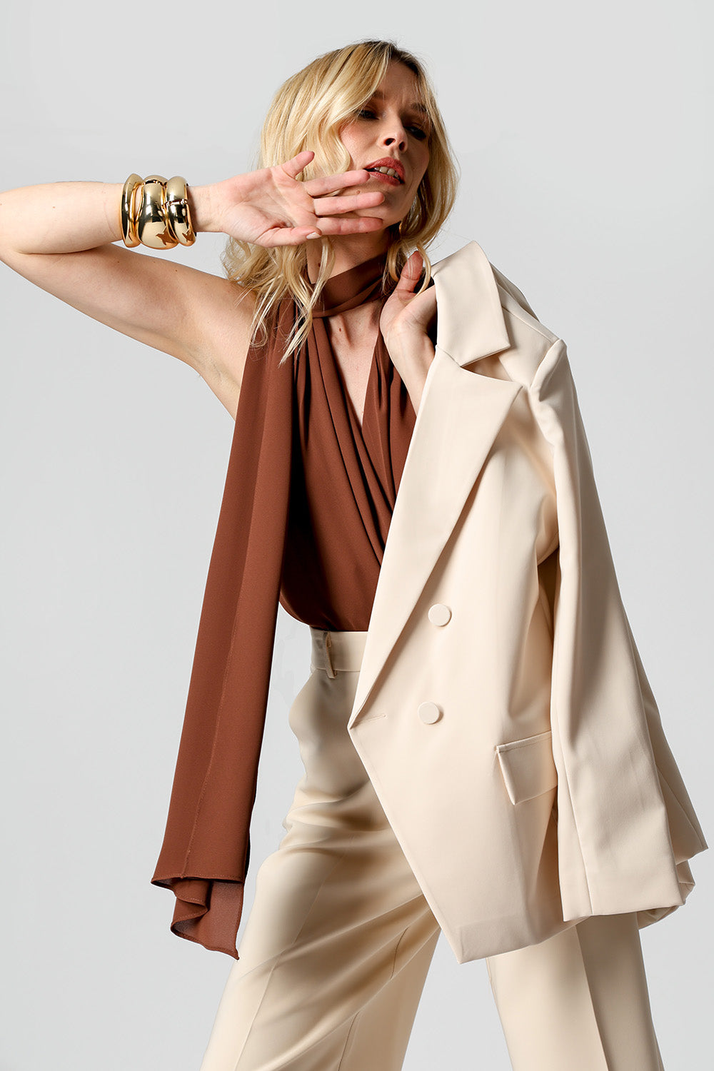 Blusa estilo cachequer em crepe fluido, acompanhada de lenço multiuso que permite diferentes amarrações. Peça leve, versátil e elegante para compor looks modernos.