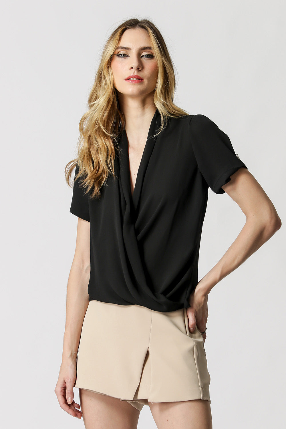 Blusa de manga corta con bufanda y detalles de botones de pedrería. Modelo realizado en tejido crepe fluido. Un modelo elegante y encantador para un ambiente de trabajo.