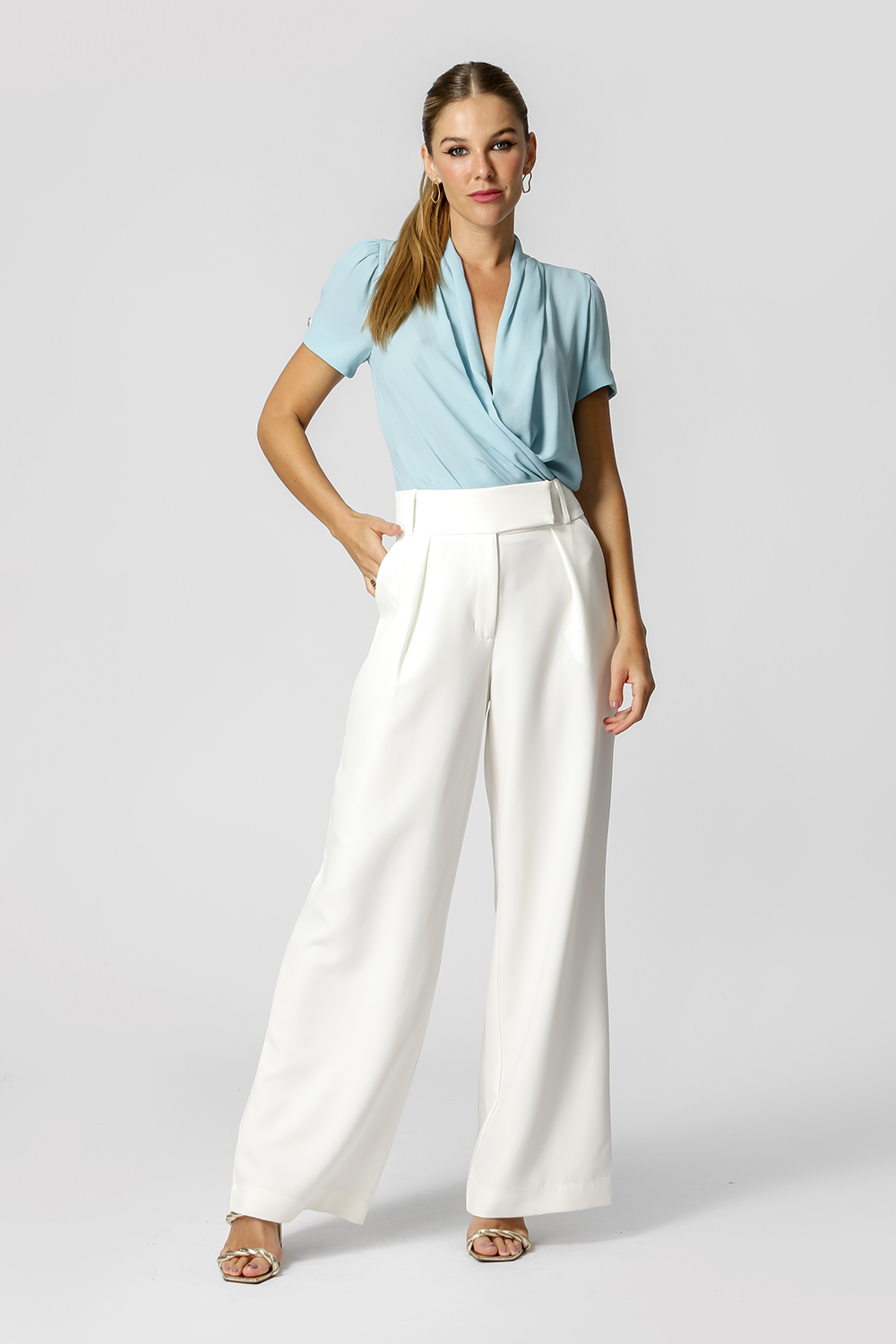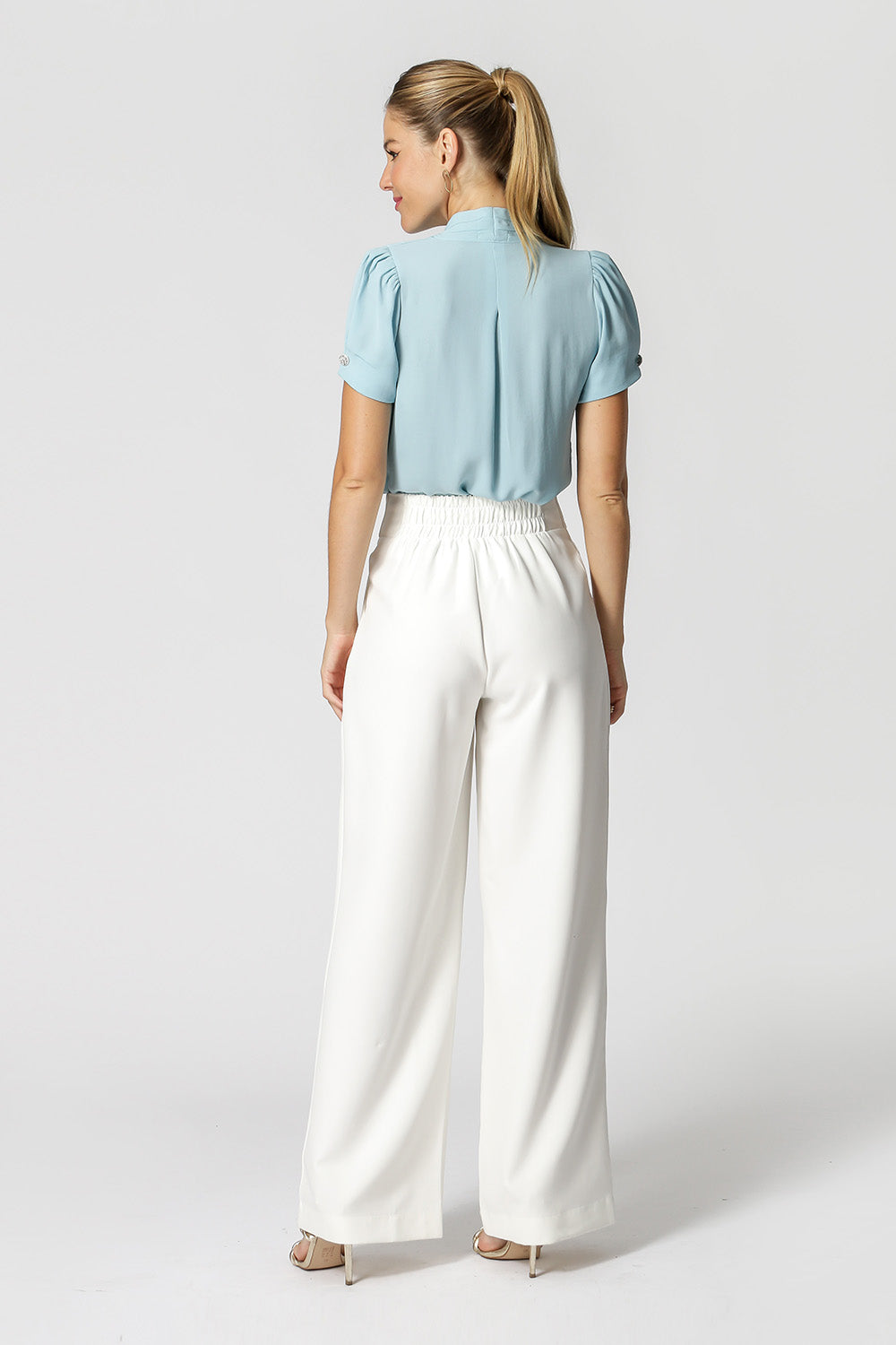 Blusa de manga corta con bufanda y detalles de botones de pedrería. Modelo realizado en tejido crepe fluido. Un modelo elegante y encantador para un ambiente de trabajo.