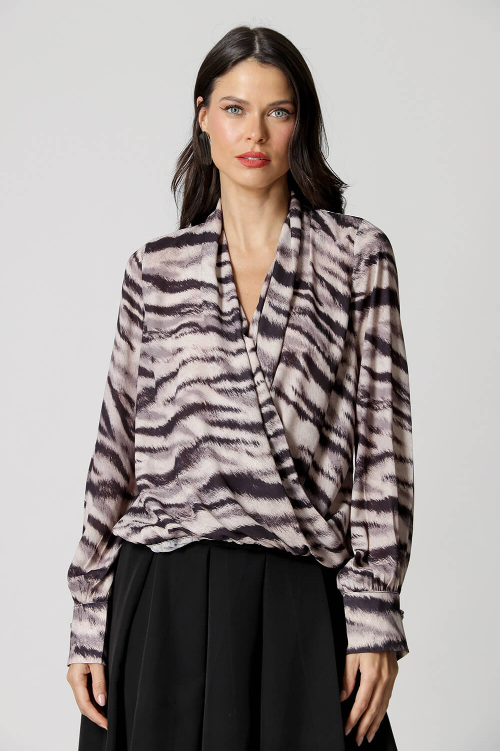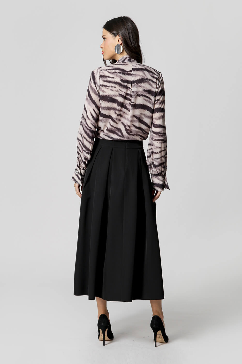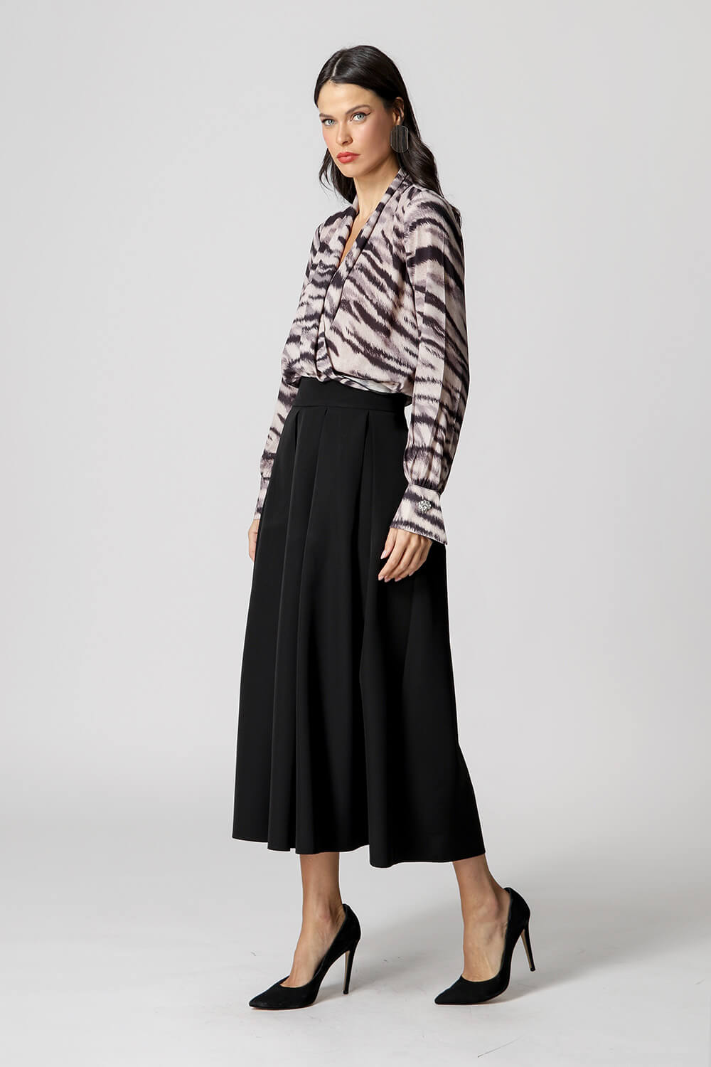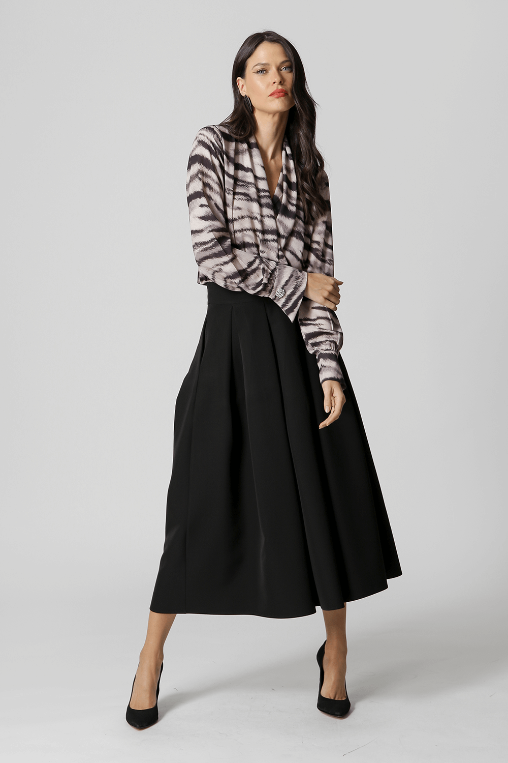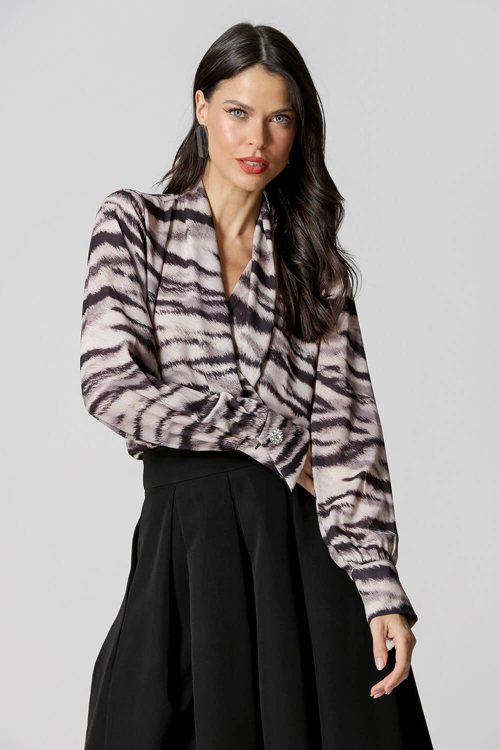 Blusa de manga larga con bufanda y botones de pedrería. Un modelo confeccionado en tejido ligero y fluido con un estampado exclusivo. Un modelo elegante, perfecto para un ambiente de trabajo.
