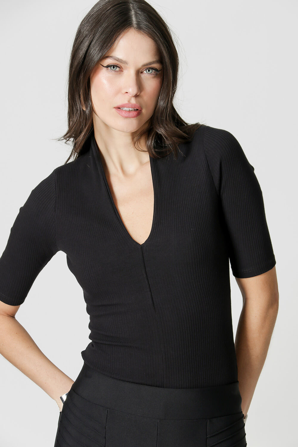 Blusa con escote profundo. Pieza confeccionada en punto canalé grueso, al ser un tejido más firme ayuda a la compresión para realzar la silueta. Modelo básico que no puede faltar en tu armario.