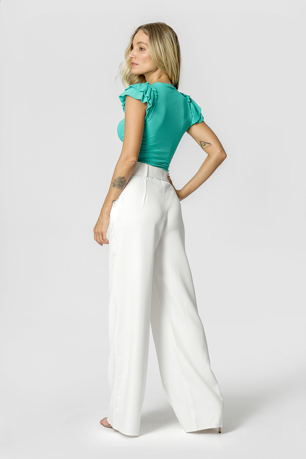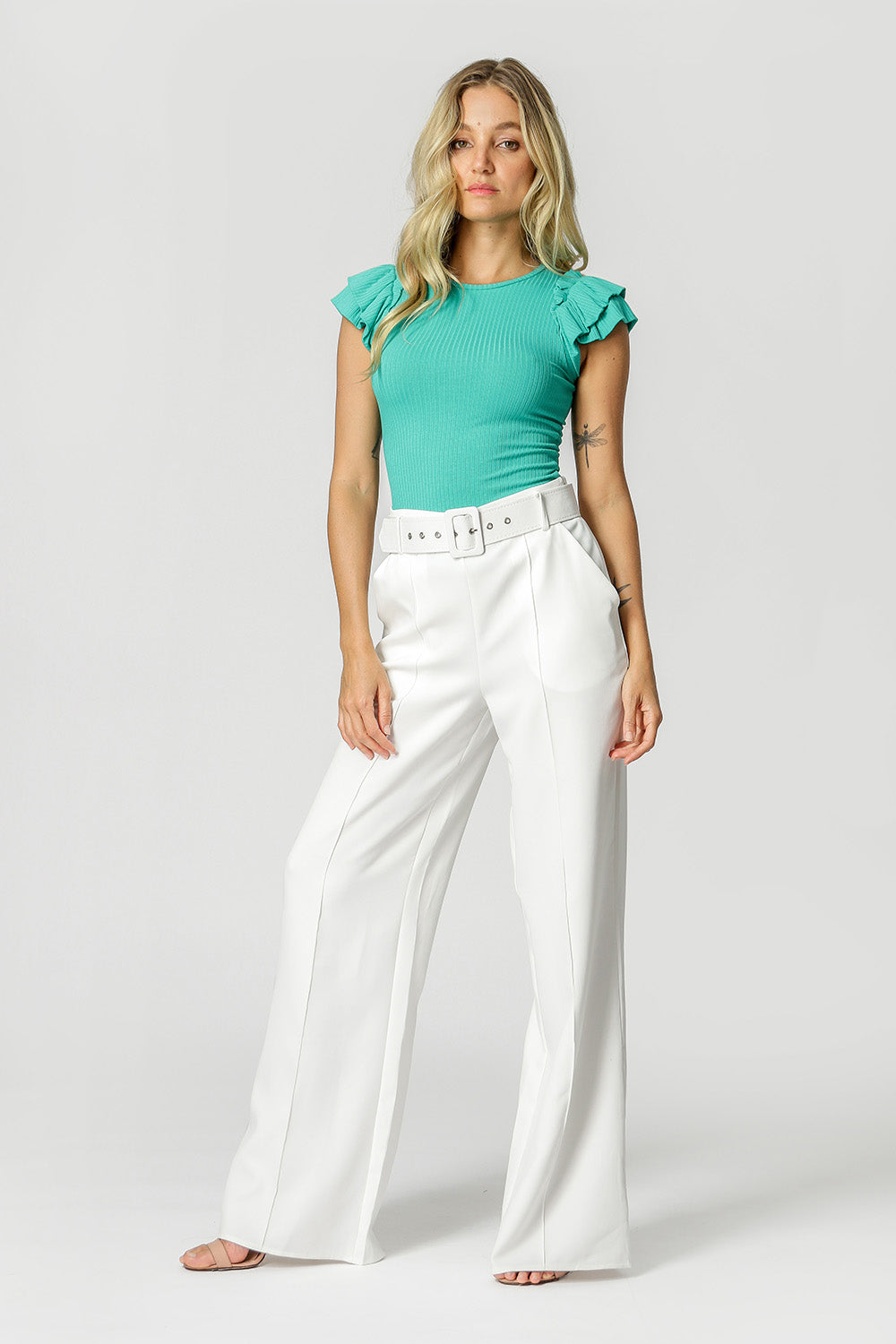 Blusa confeccionada en punto canalé, de corte ajustado, manga corta con 2 capas de volantes. Una pieza única con mucho encanto, que dejará tu look actual y preparado para cualquier ocasión.