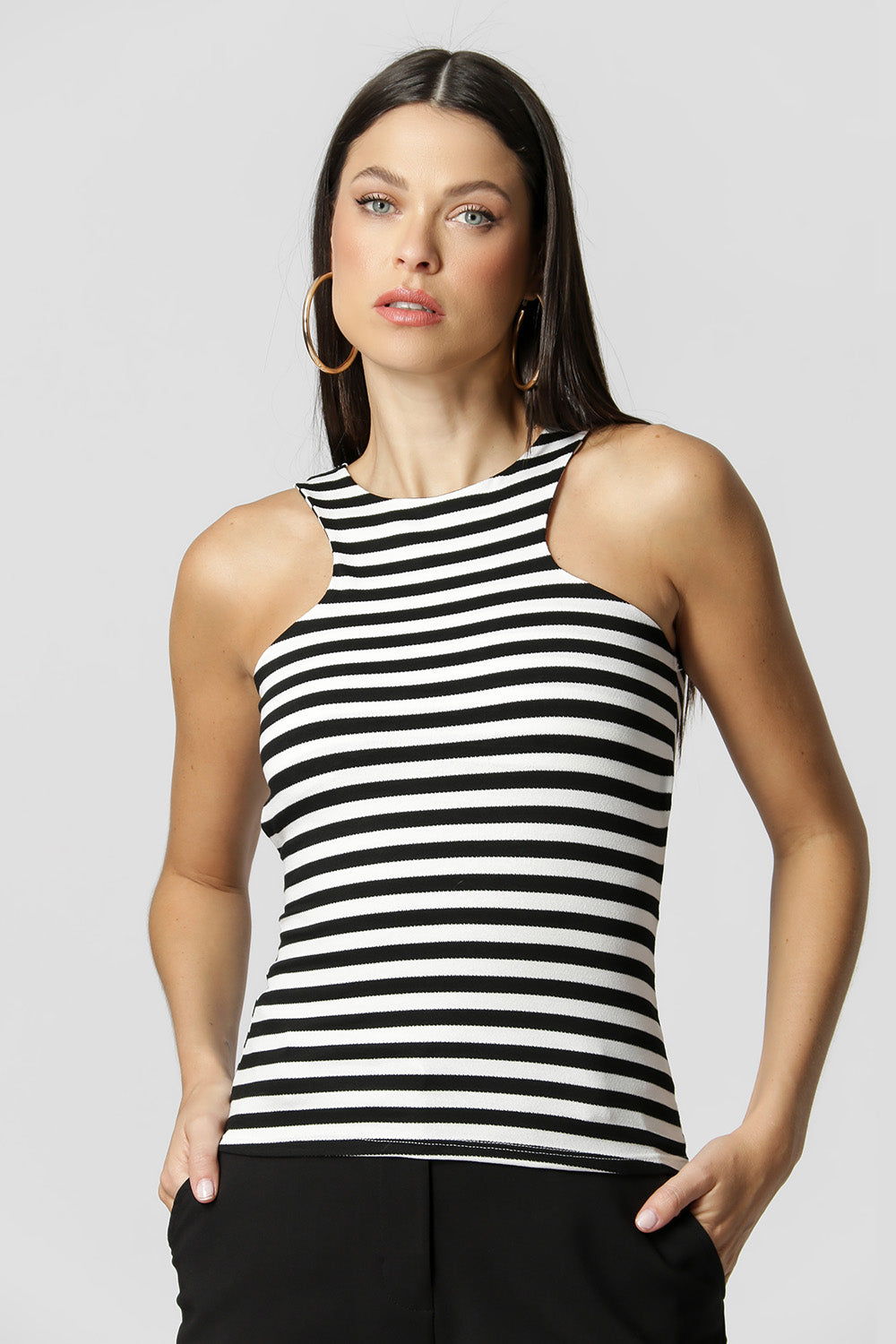 Camiseta sin mangas con espalda cruzada. Fabricado en tejido de punto a rayas. Una pieza básica para el día a día que no puede faltar en tu armario.