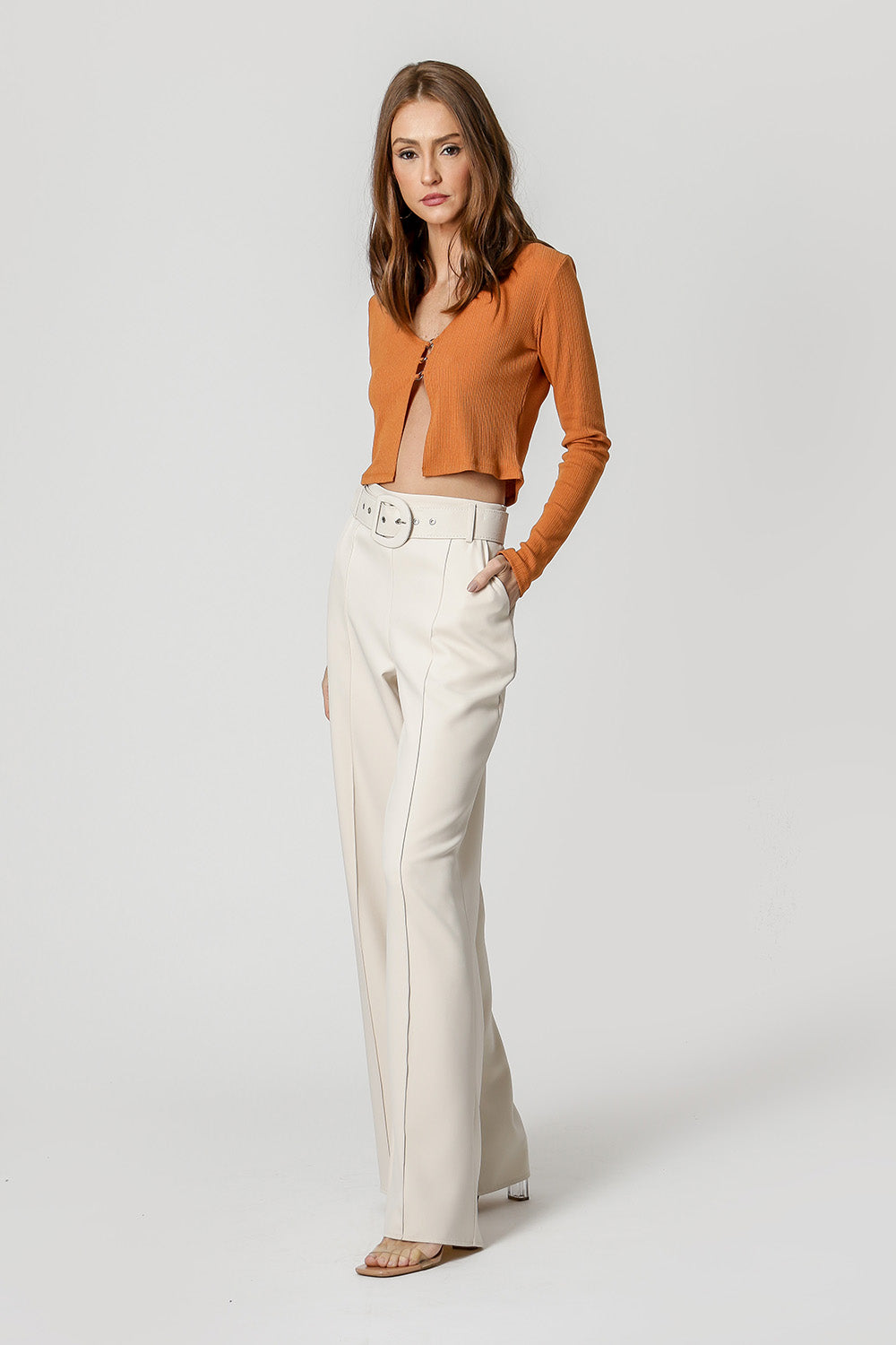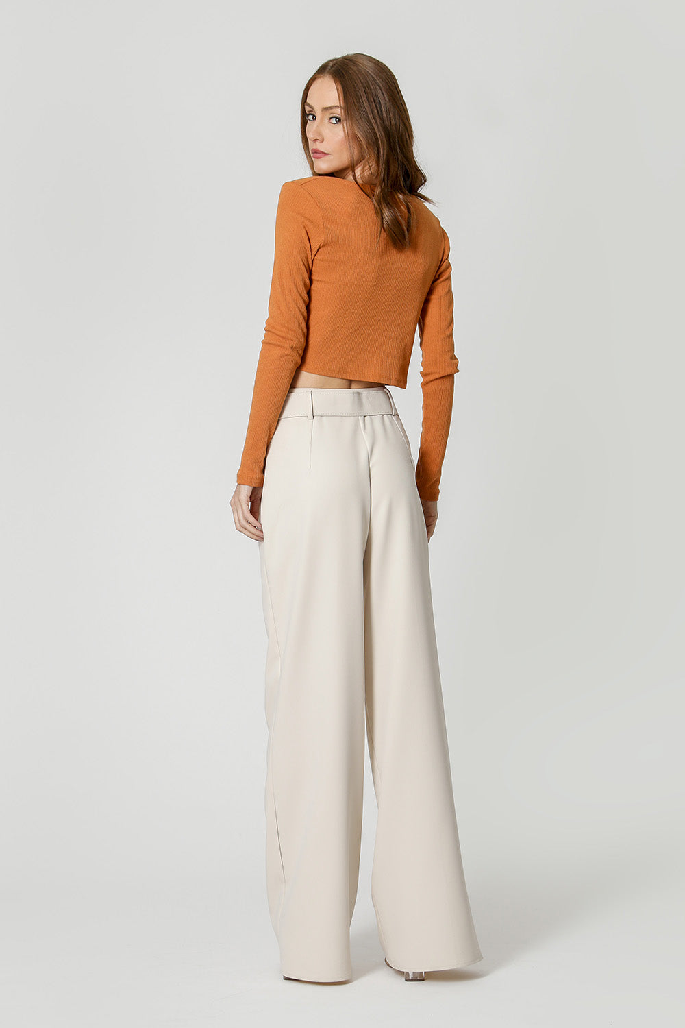 Blusa cropped de manga larga con trio de anillas metálicas. ¡Moderno casual con un toque de moda!