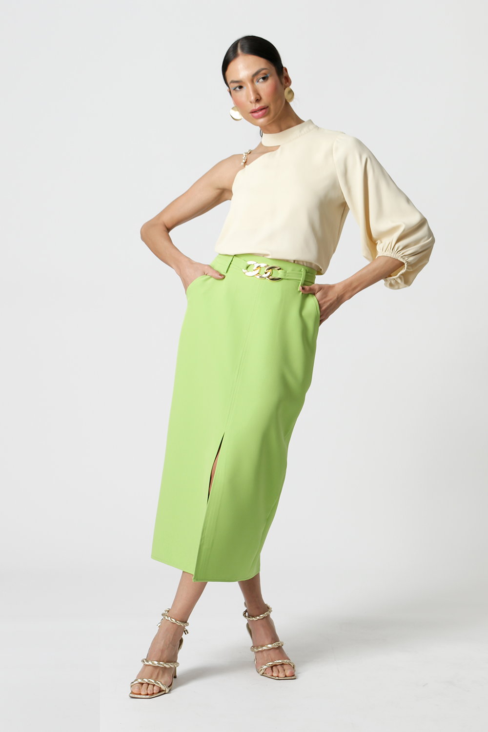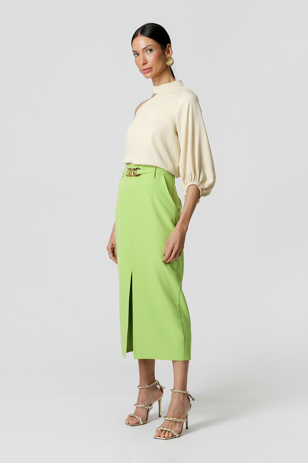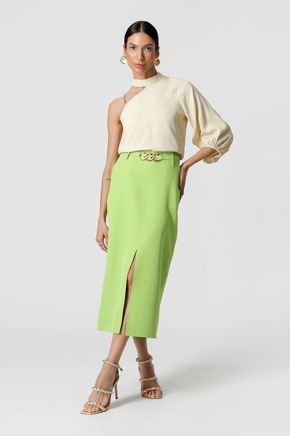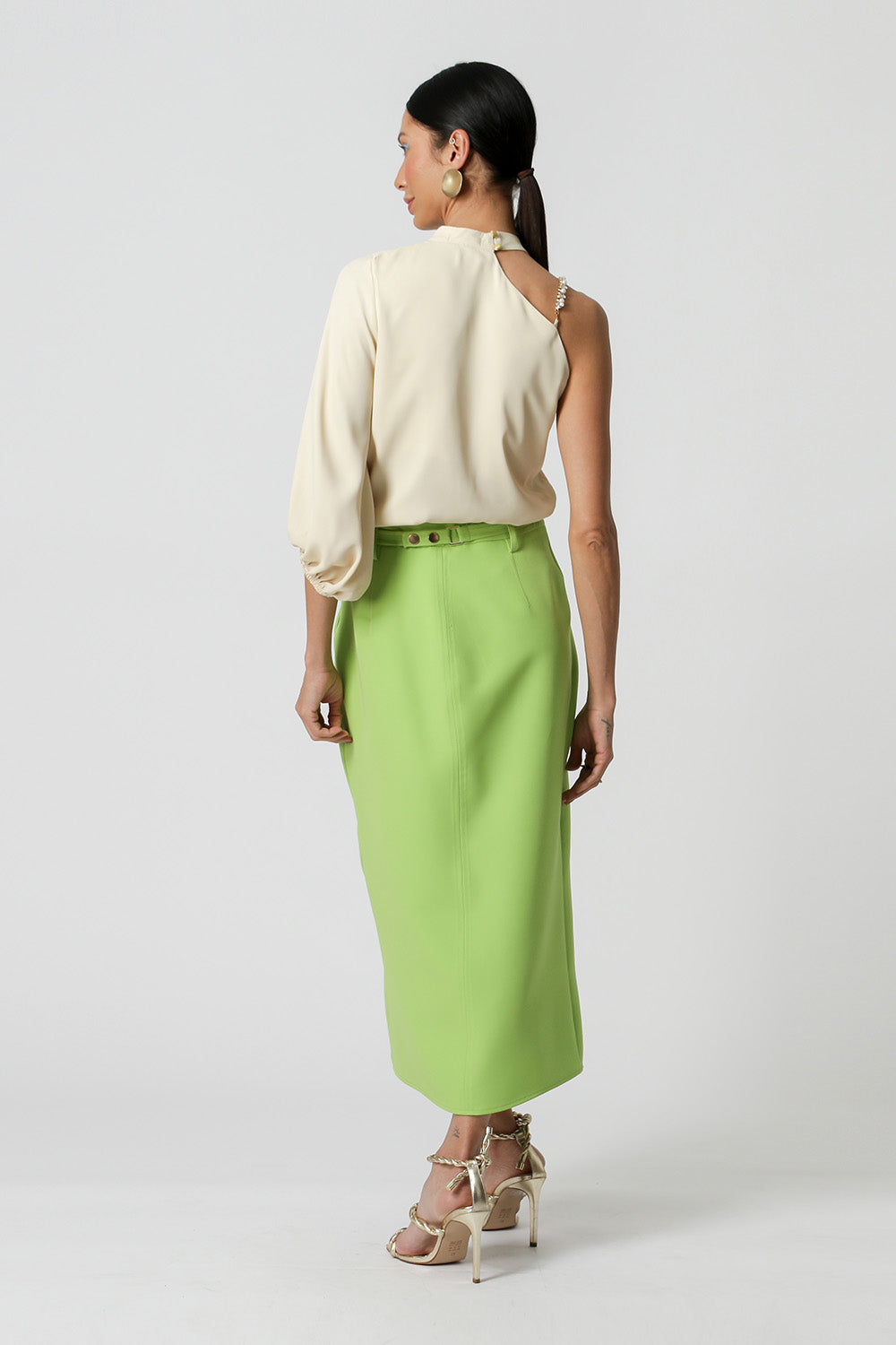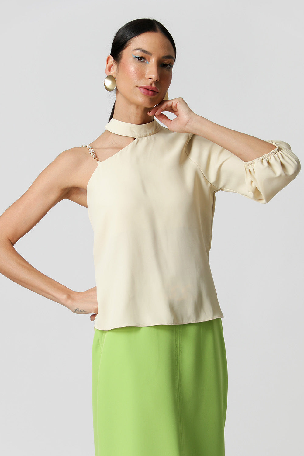 Blusa de un solo hombro con mangas abullonadas y tirantes de pedrería. Fabricado con tejido fluido. Una pieza elegante, de forma suelta e ideal para crear un ambiente de trabajo.