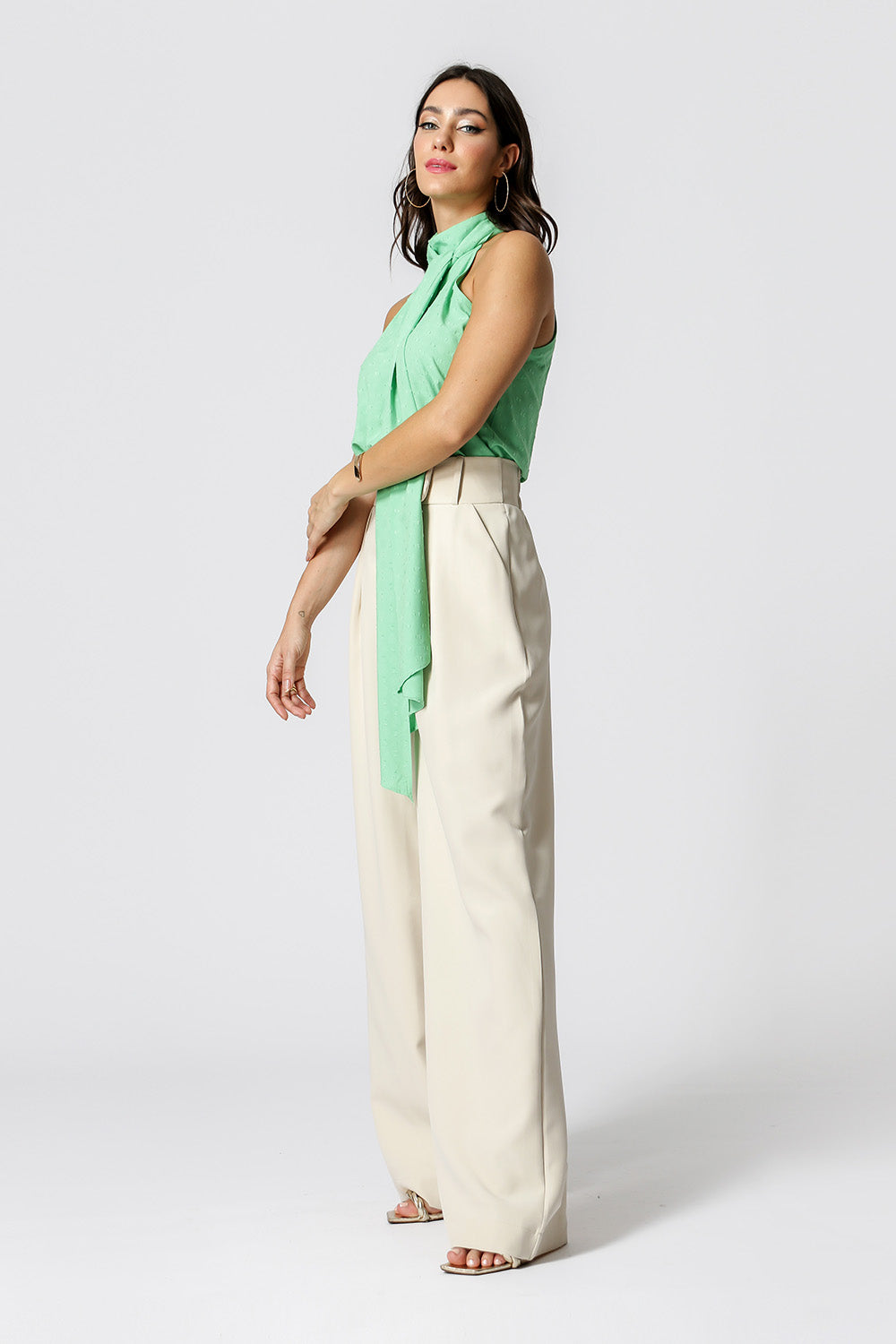Blusa con lazo en el cuello y botón en la espalda. Modelo realizado en tejido Viscosa con texturas. Un modelo fresco y encantador para crear looks diarios.