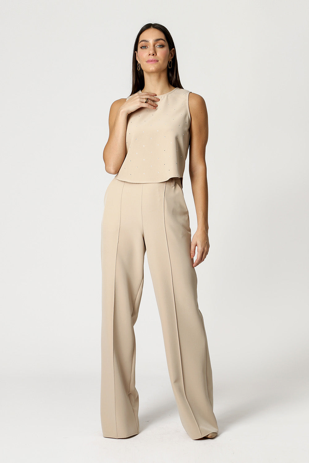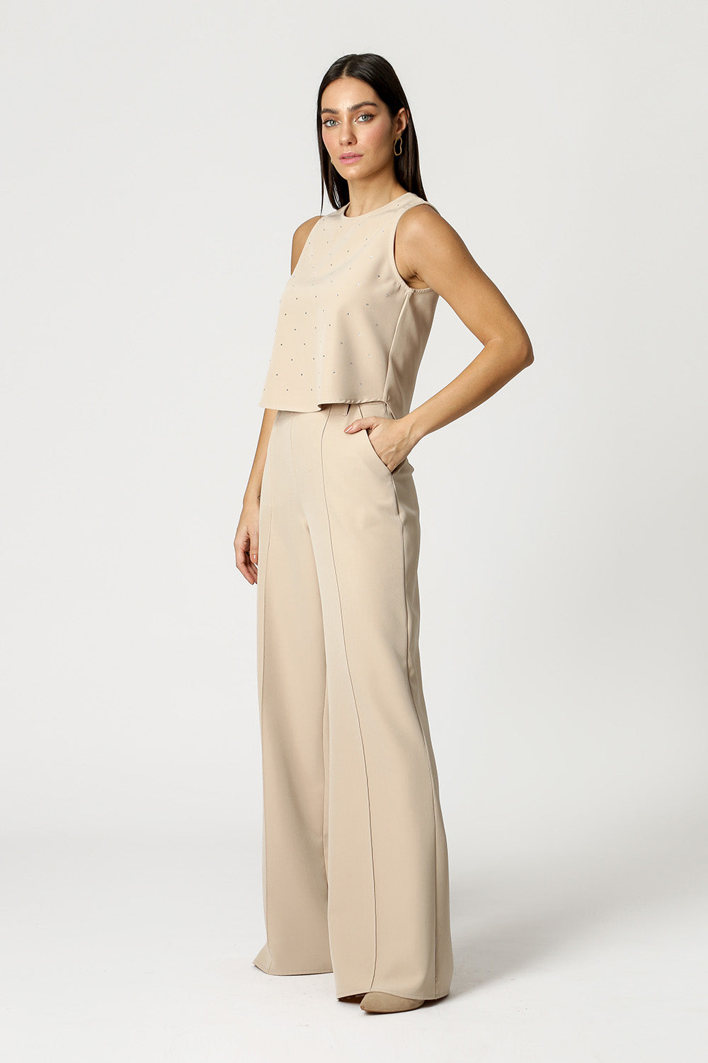 Blusa con detalle de aplicación de pedrería. Fabricado con tejido a medida. Una pieza versátil llena de encanto e ideal para crear un look de noche.