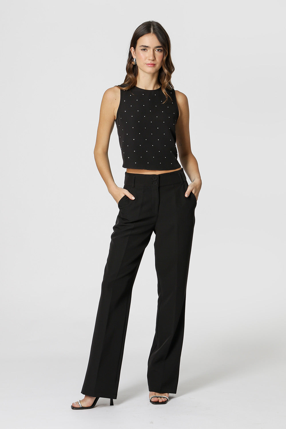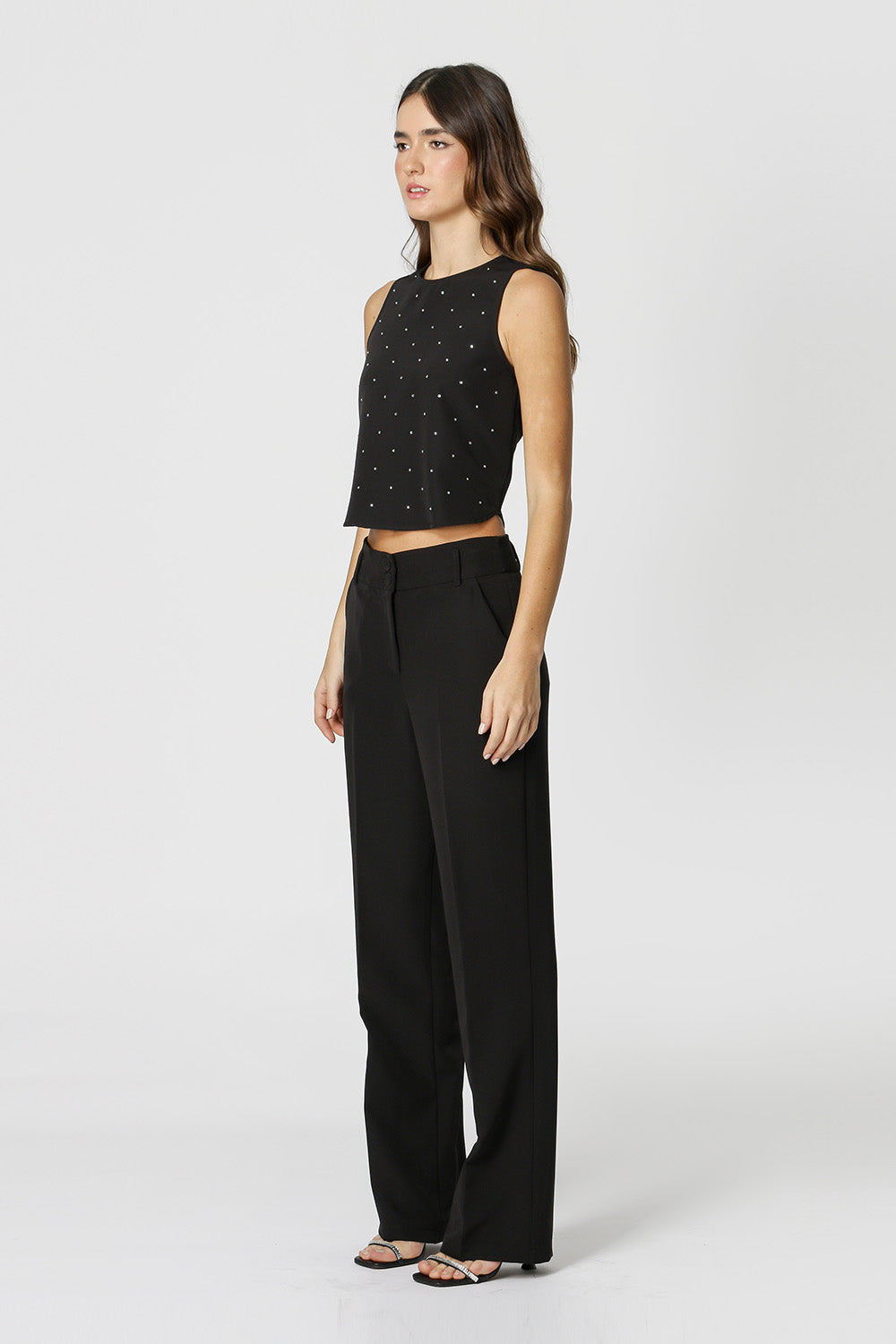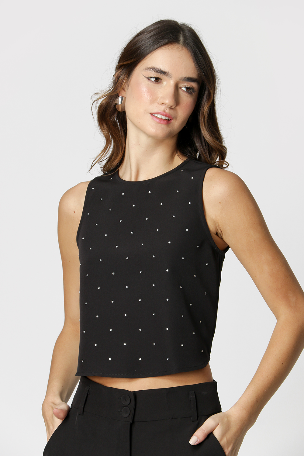 Blusa con detalle de aplicación de pedrería. Fabricado con tejido a medida. Una pieza versátil llena de encanto e ideal para crear un look de noche.