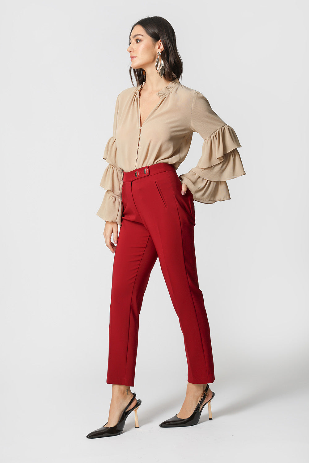 Tiene cierre de botones frontal y un delicado volante en el cuello.