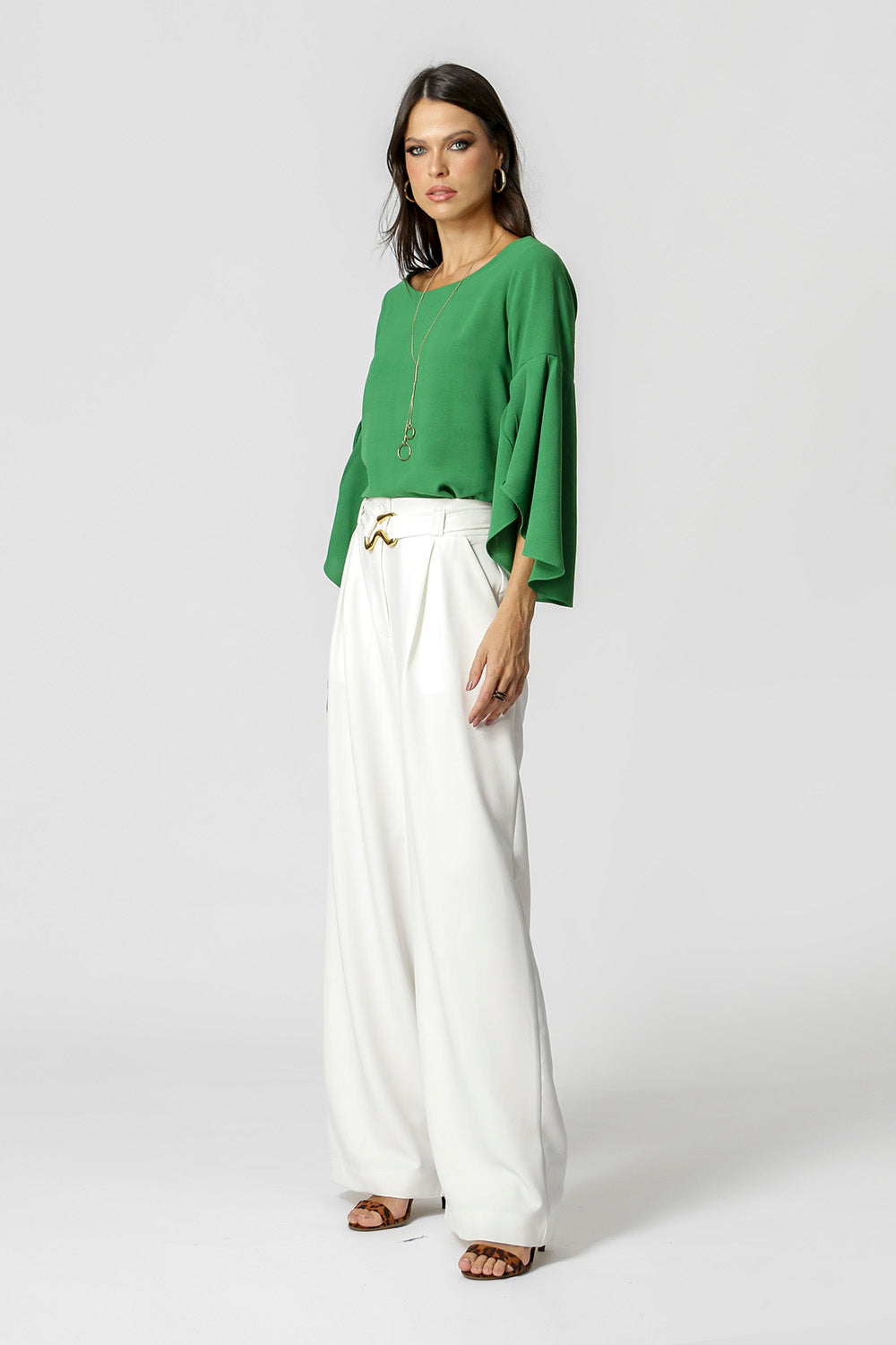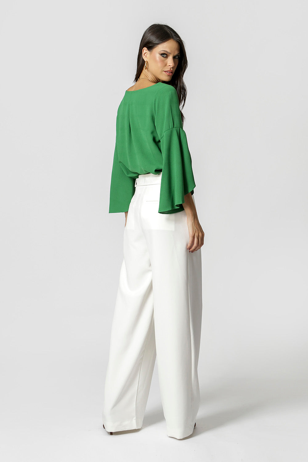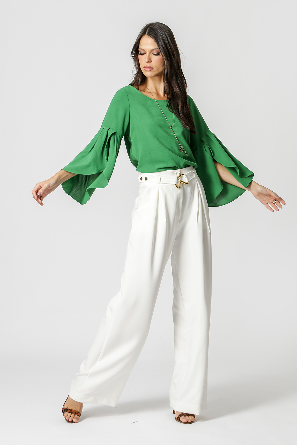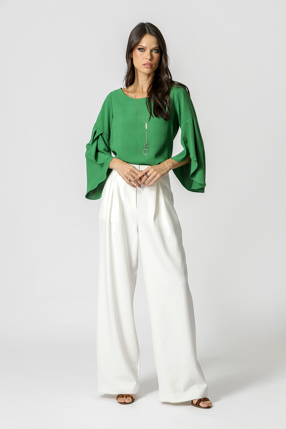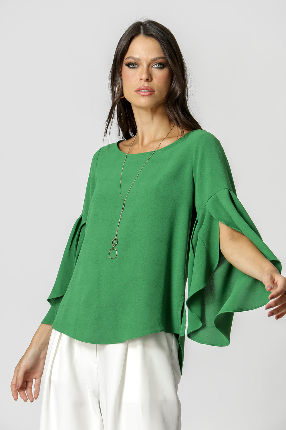 Blusa holgada, mangas anchas 3/4 con volantes. Una pieza llena de encanto para darle a tu look laboral un toque súper elegante.