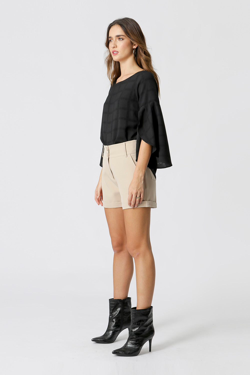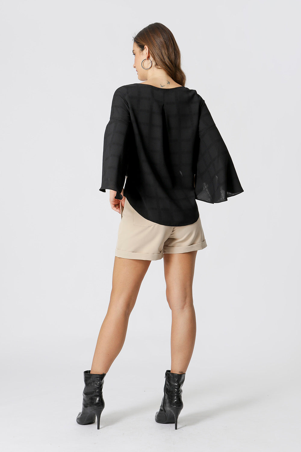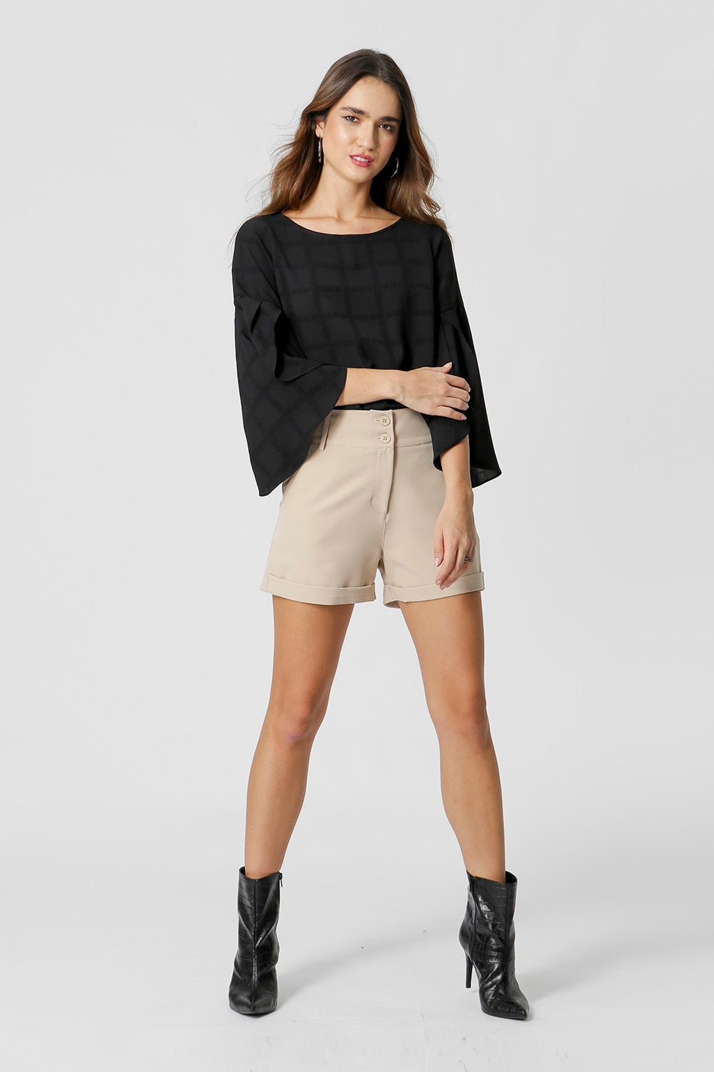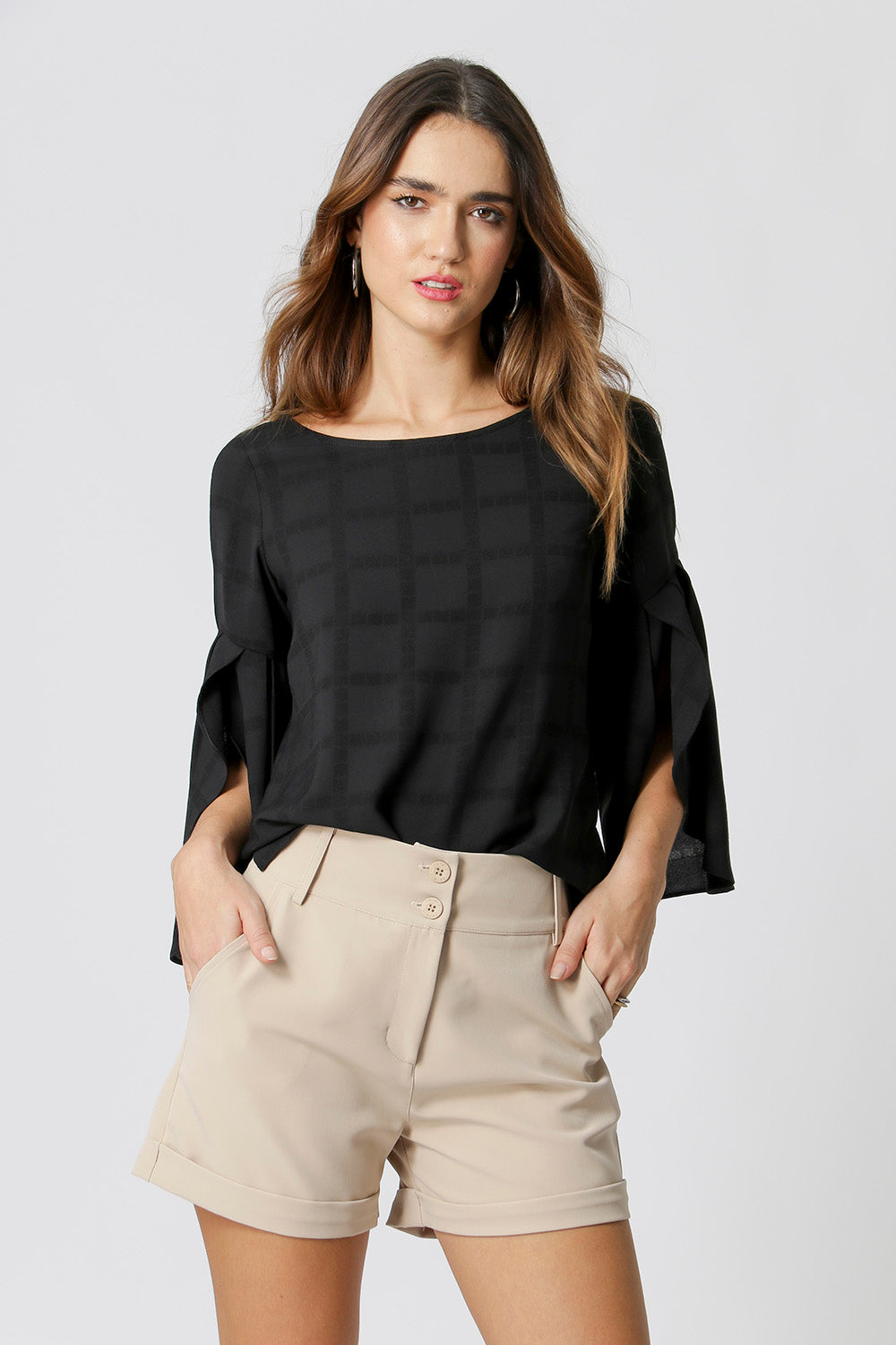 Blusa holgada, mangas anchas 3/4 con volantes. Una pieza llena de encanto para darle a tu look laboral un toque súper elegante.