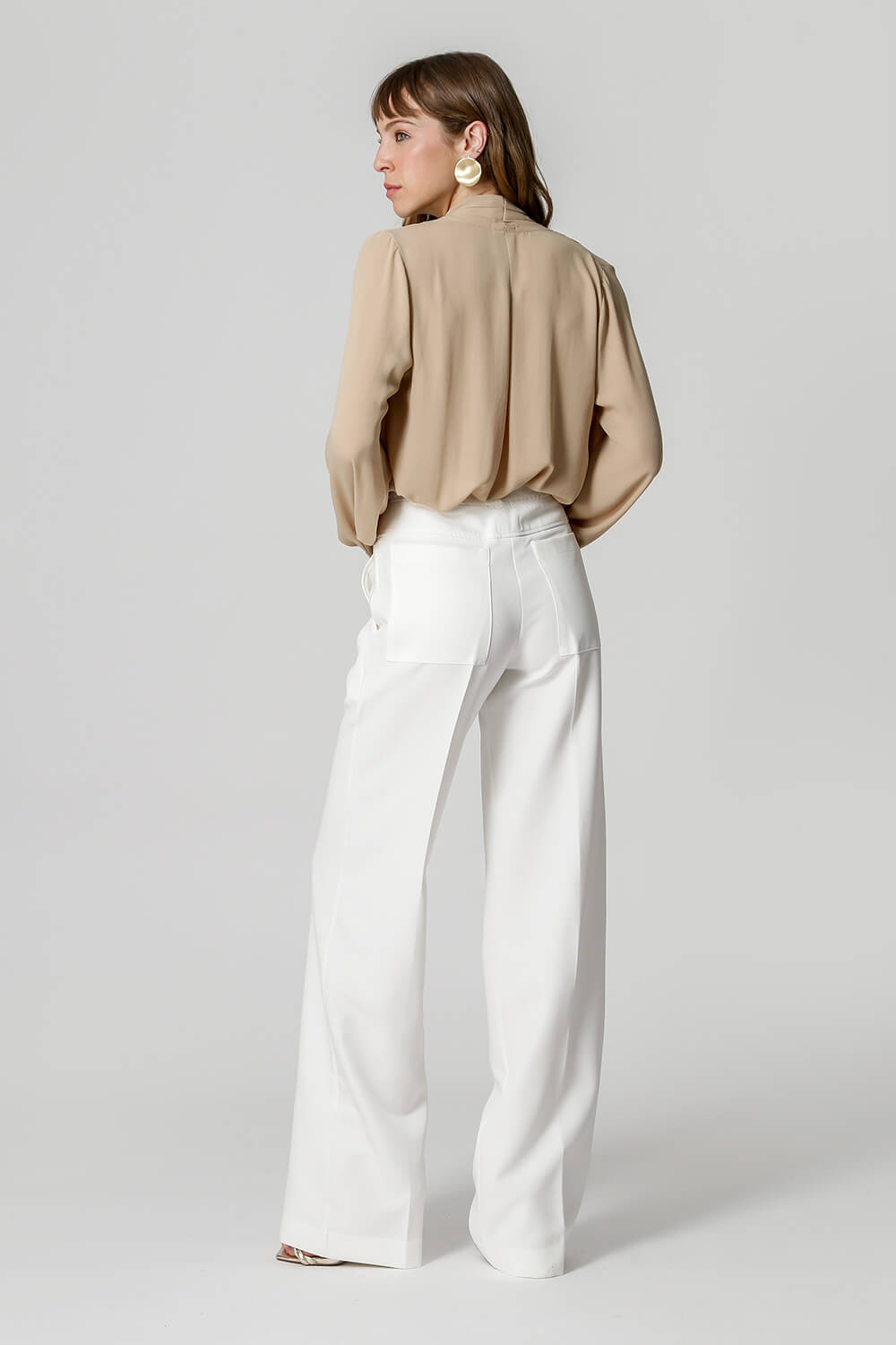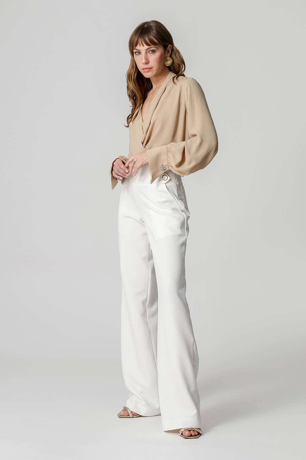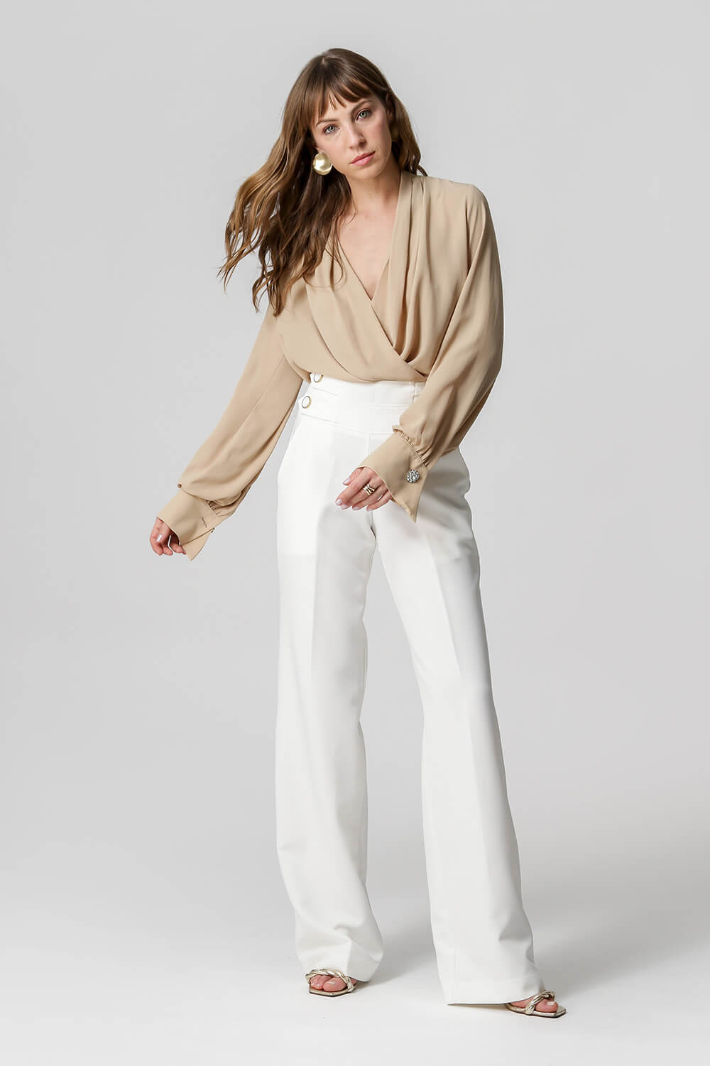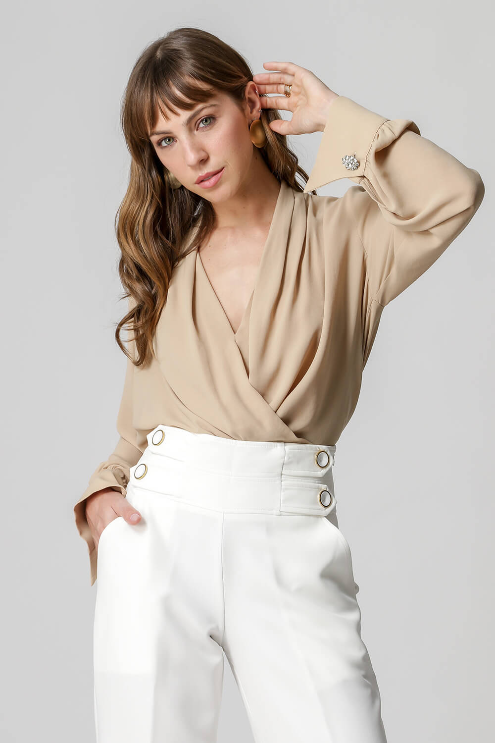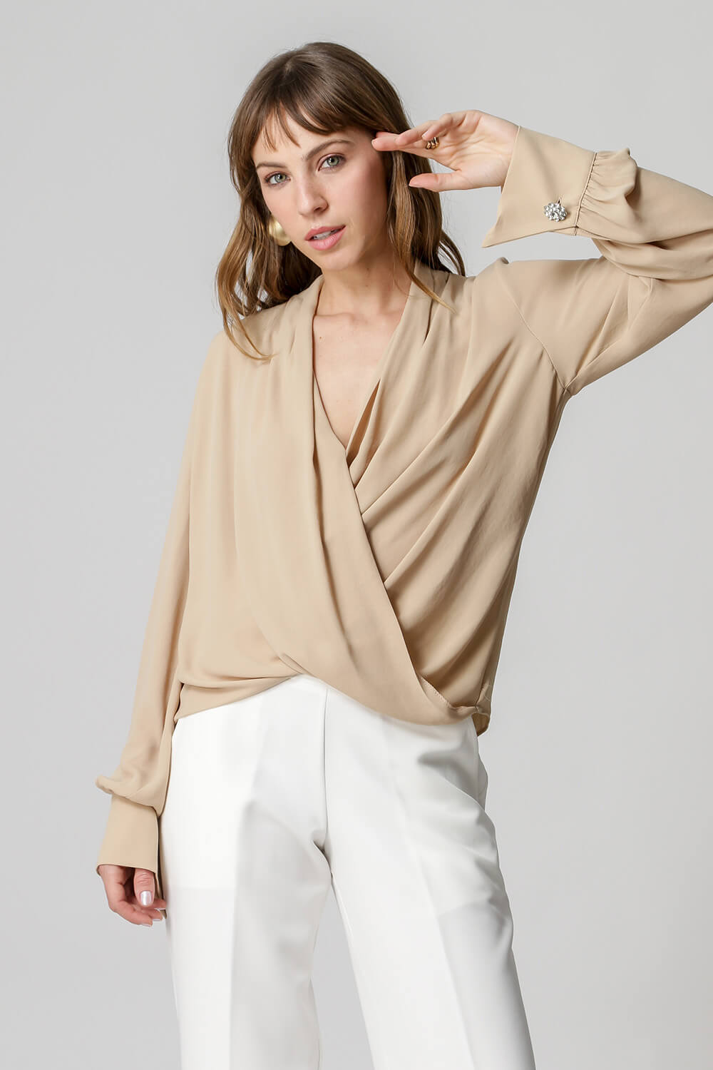 Blusa de manga larga con distintivo botón de pedrería, diseño estilo bufanda confeccionada en crepe fluido. Una pieza clásica y atemporal para un look elegante.